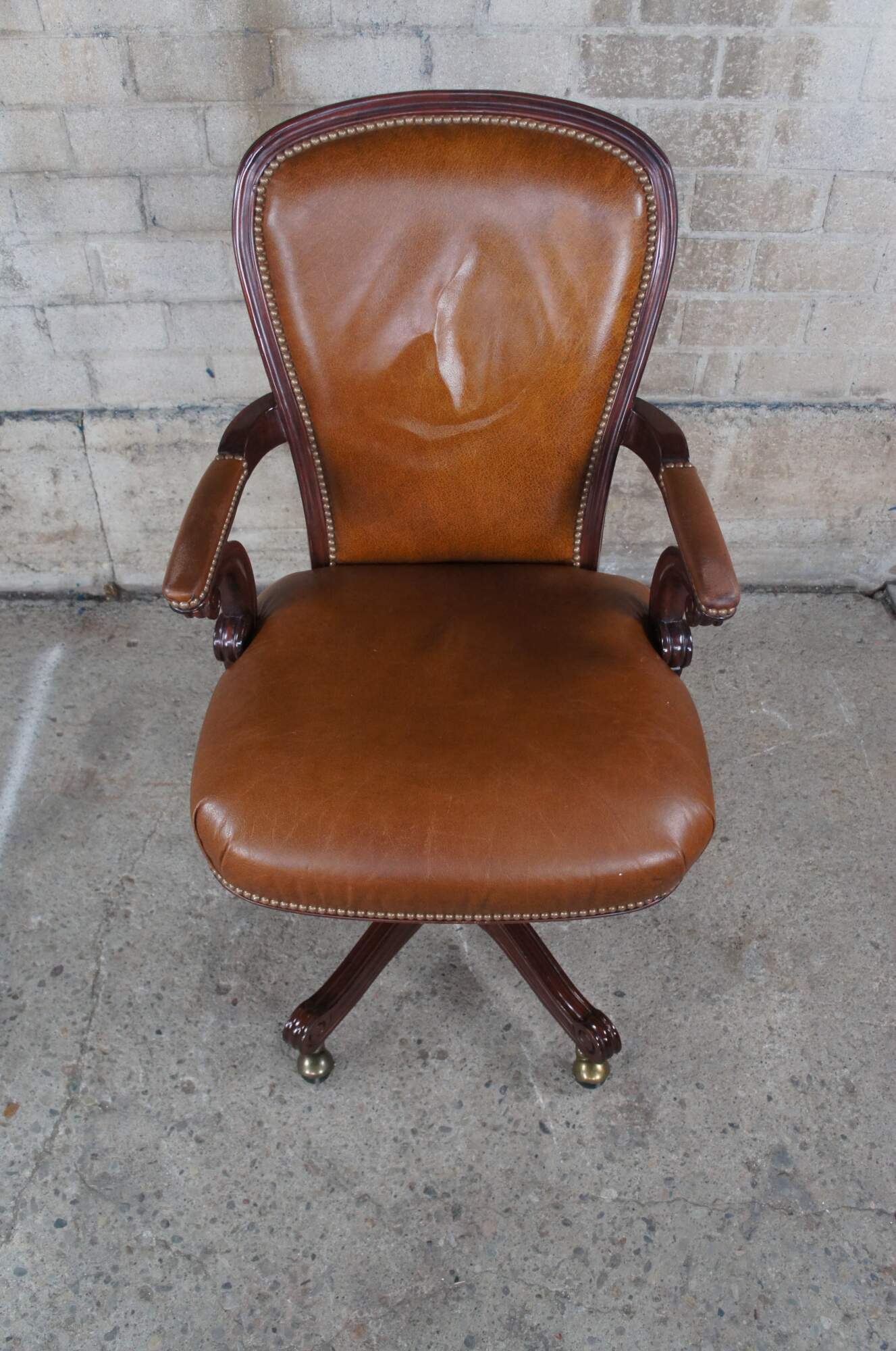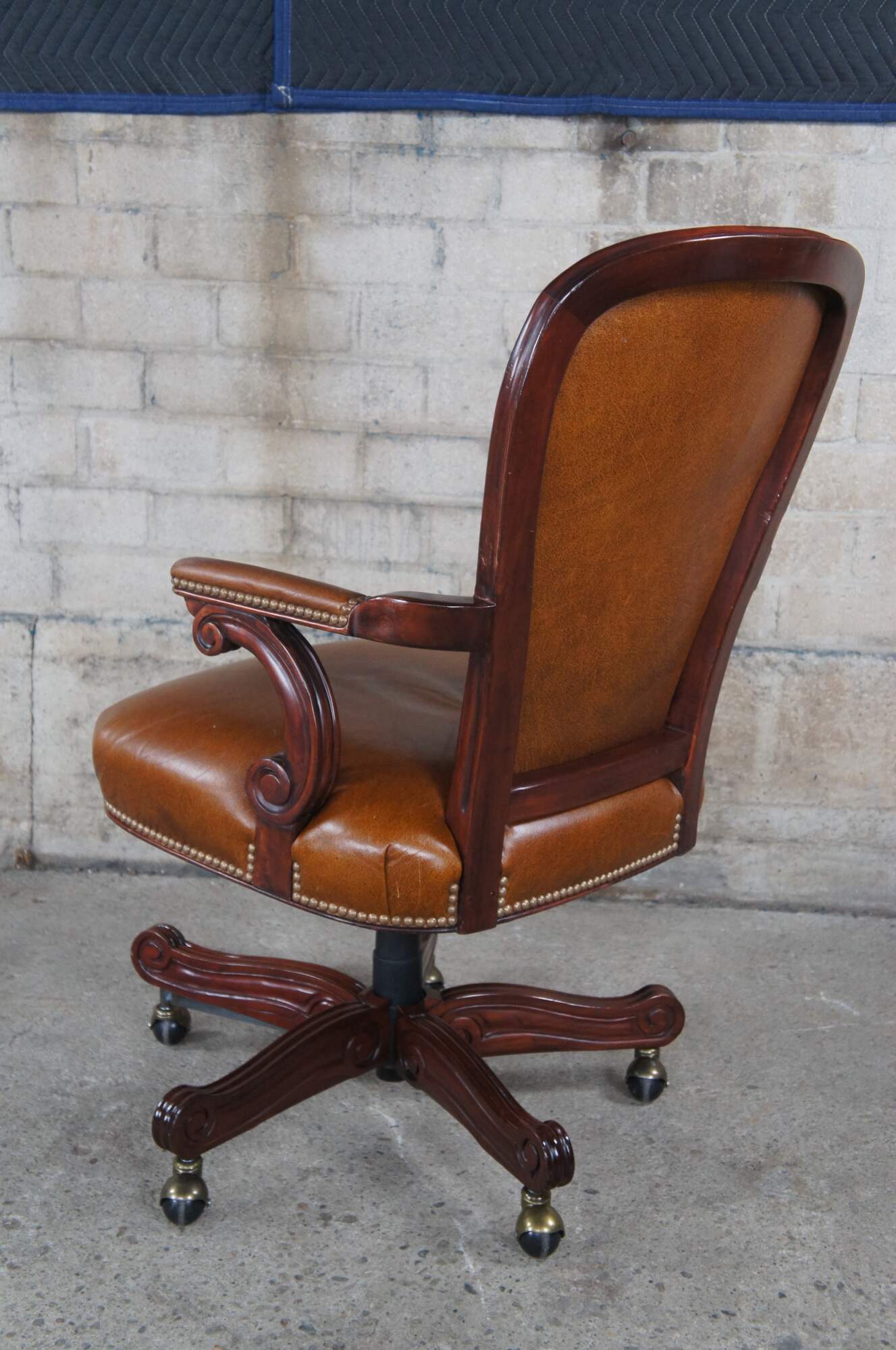 The Wiggins Executive Swivel Chair (SKU:693-27) by Leathercraft Furniture is a smooth and balanced piece that brings completeness to any home. Features a warm brown leather with nailhead trim. Made from beechwood with a mahogany finish.