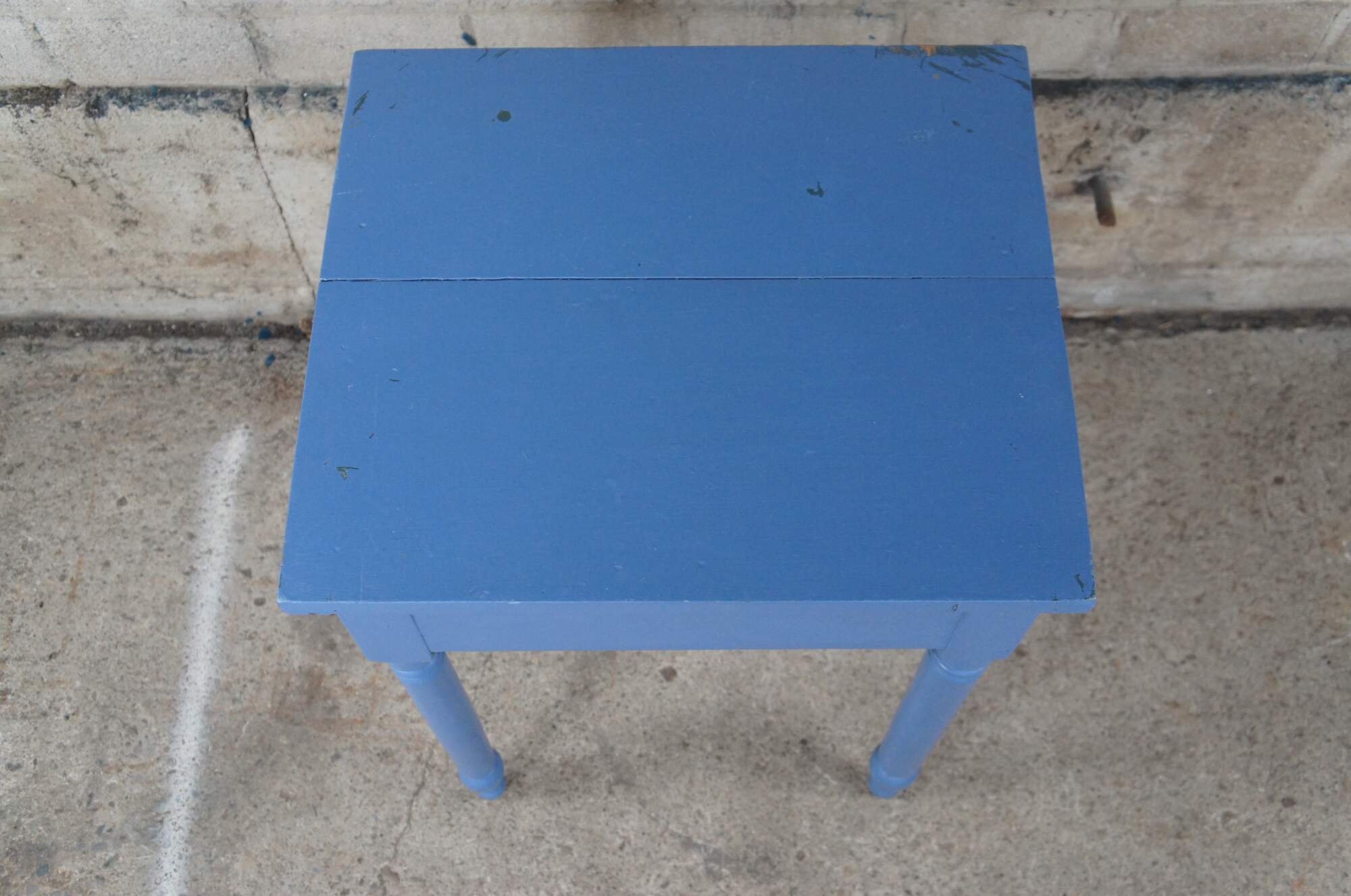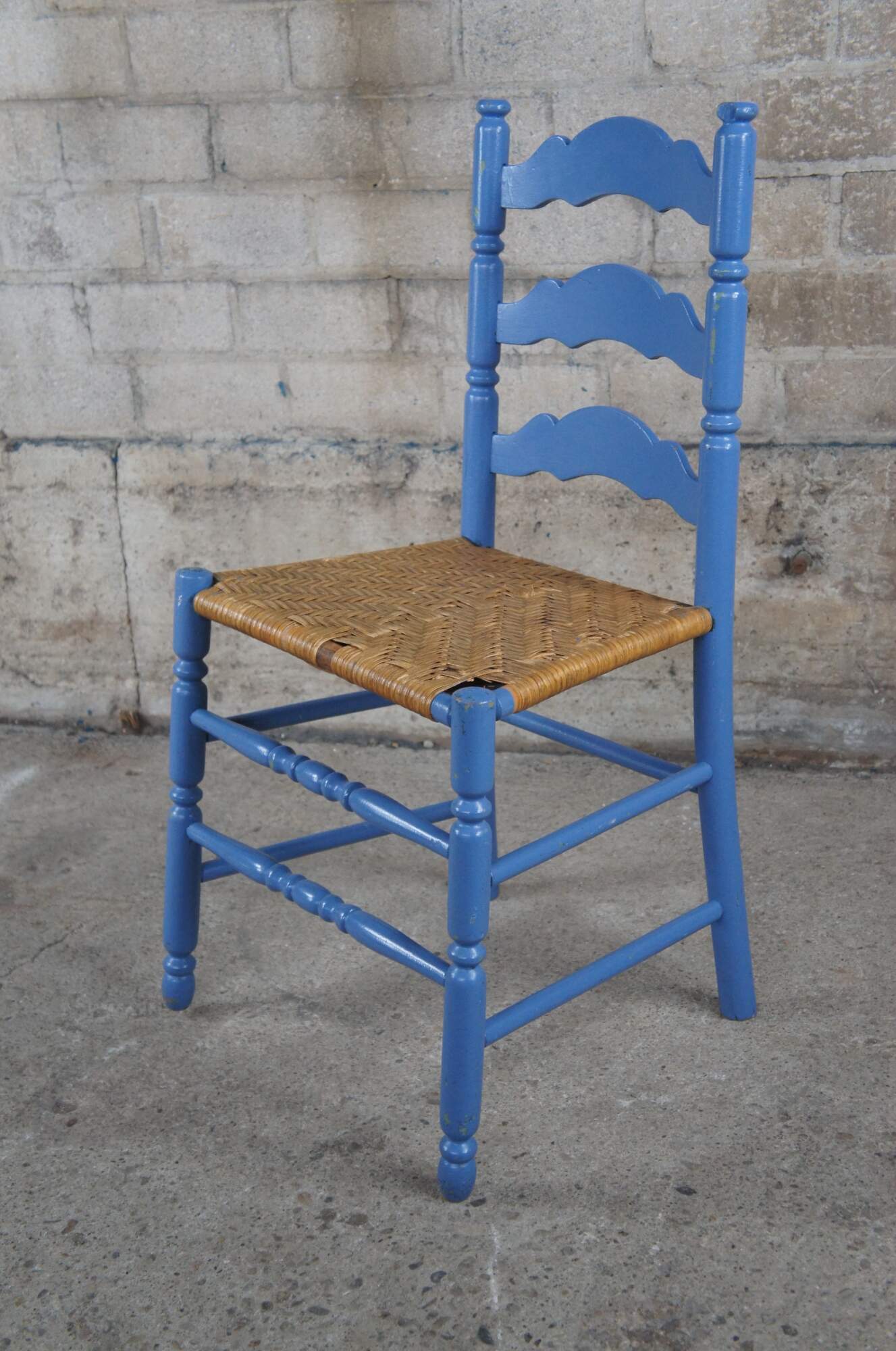 20th Century primitive table and shaker chair. Made from hardwood with a blue painted finish. The table features turned legs and arrow feet. The chair has a ladder back and rush seat.