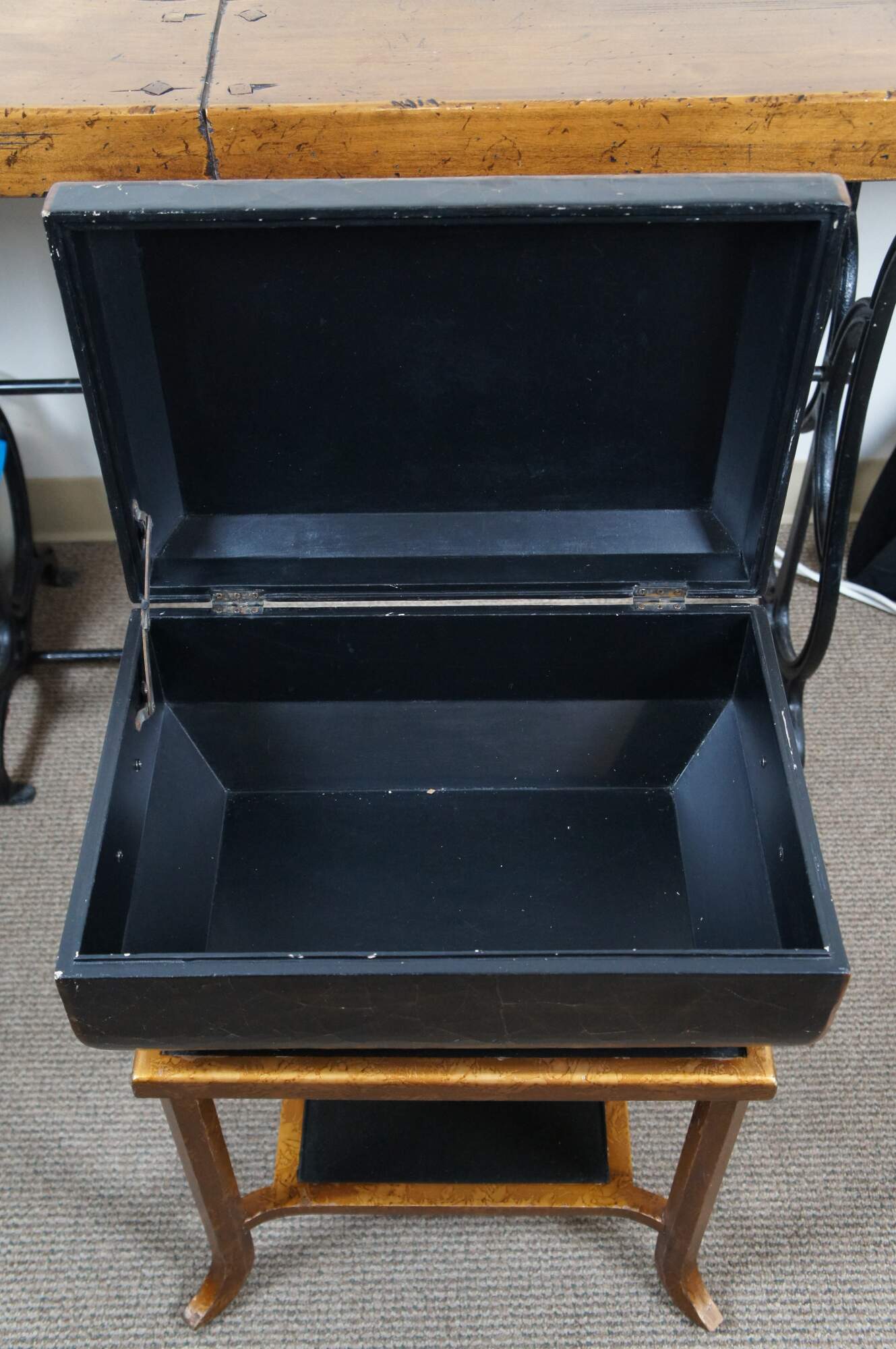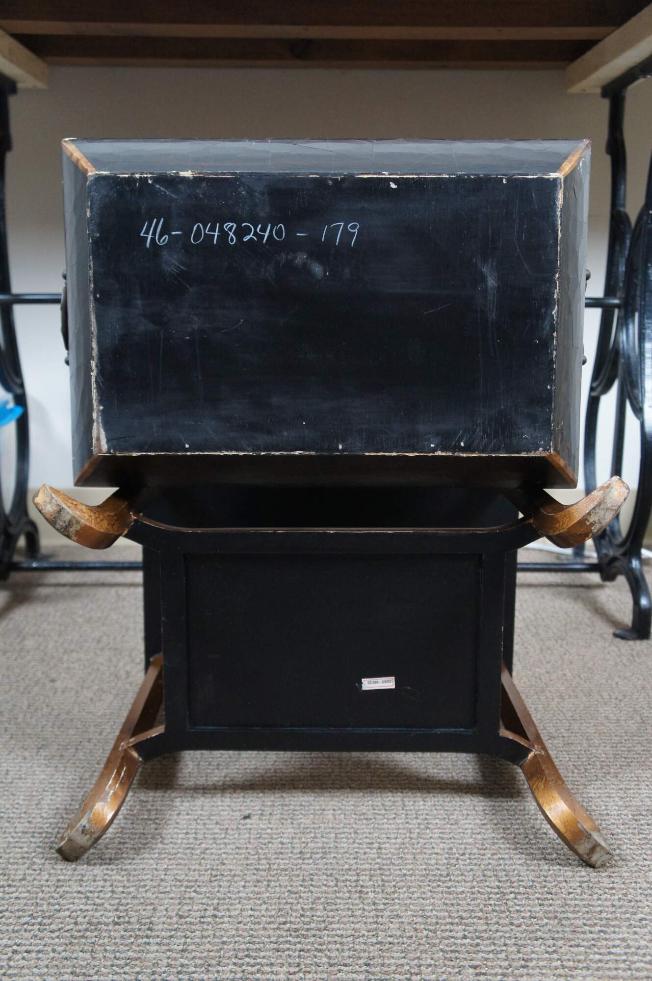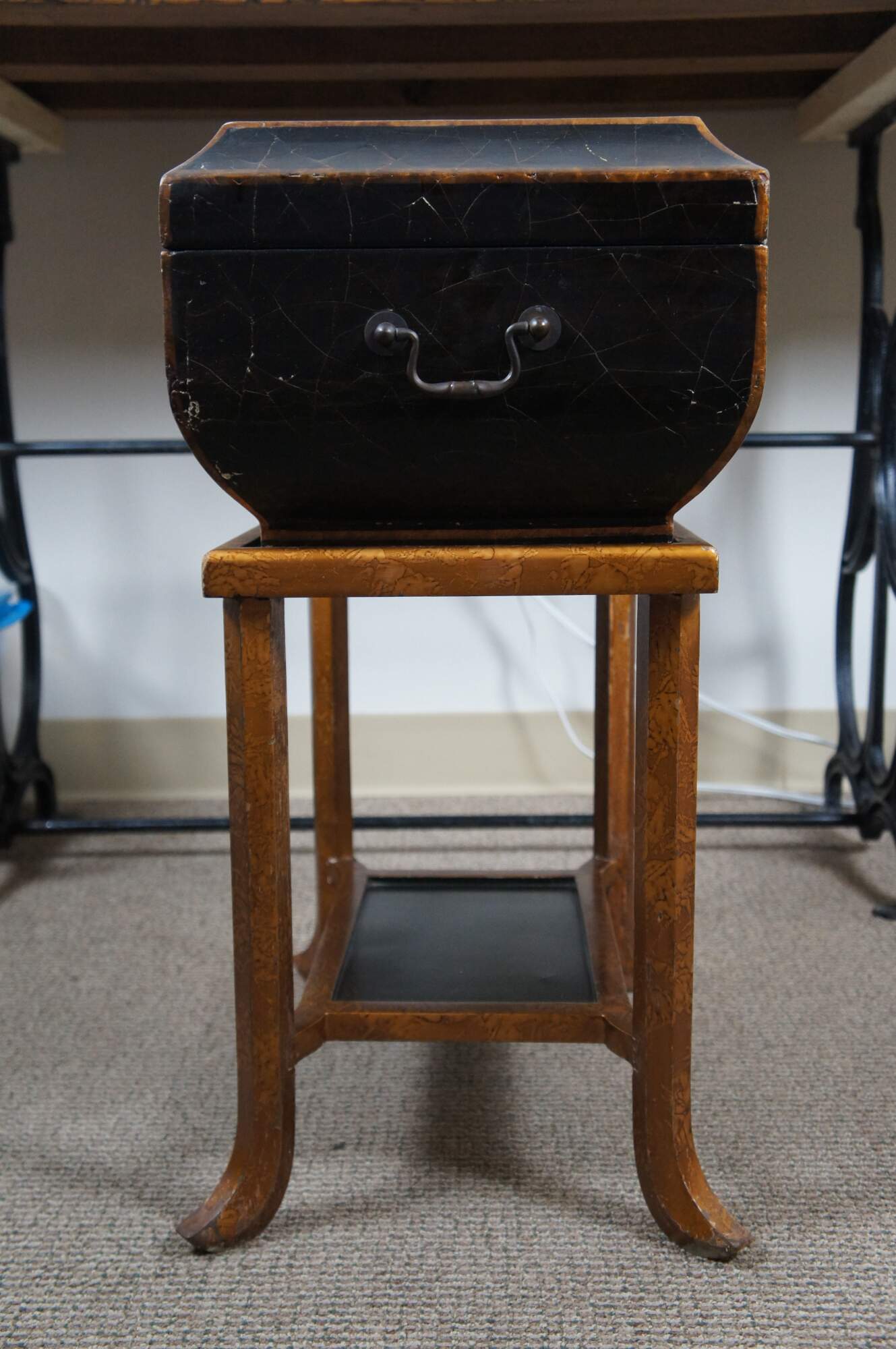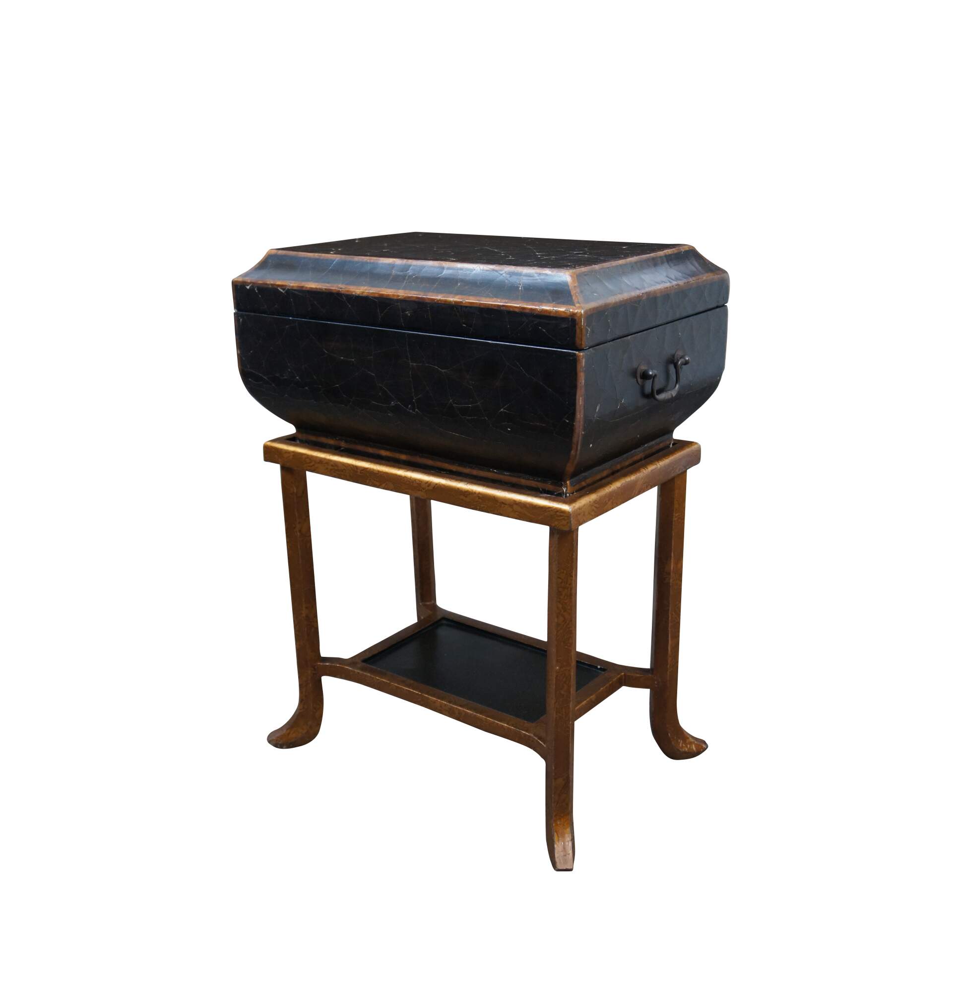 Late 20th century crackled black lacquer Chinoiserie style trunk / chest on a gold painted two tier stand / end table.