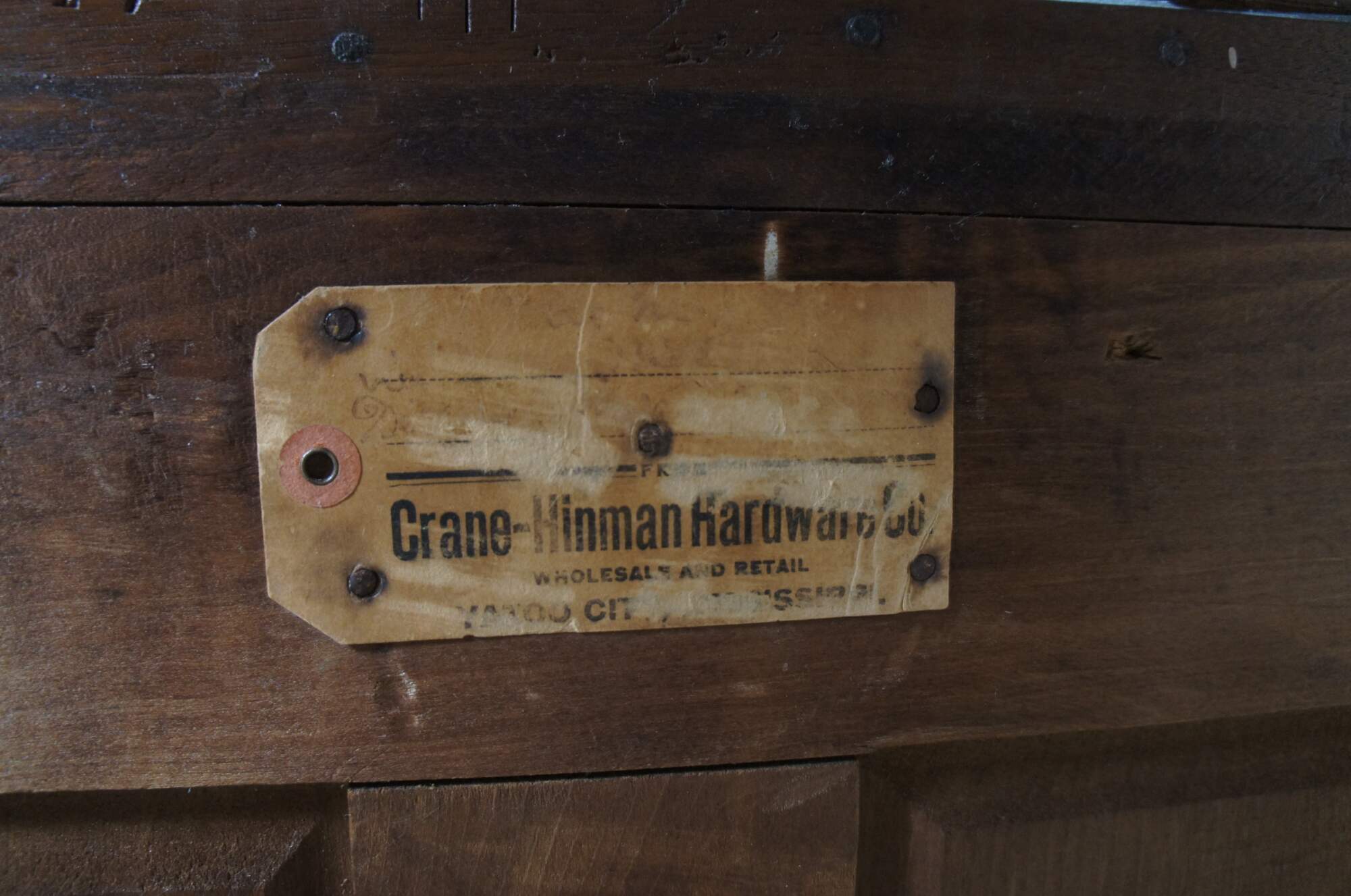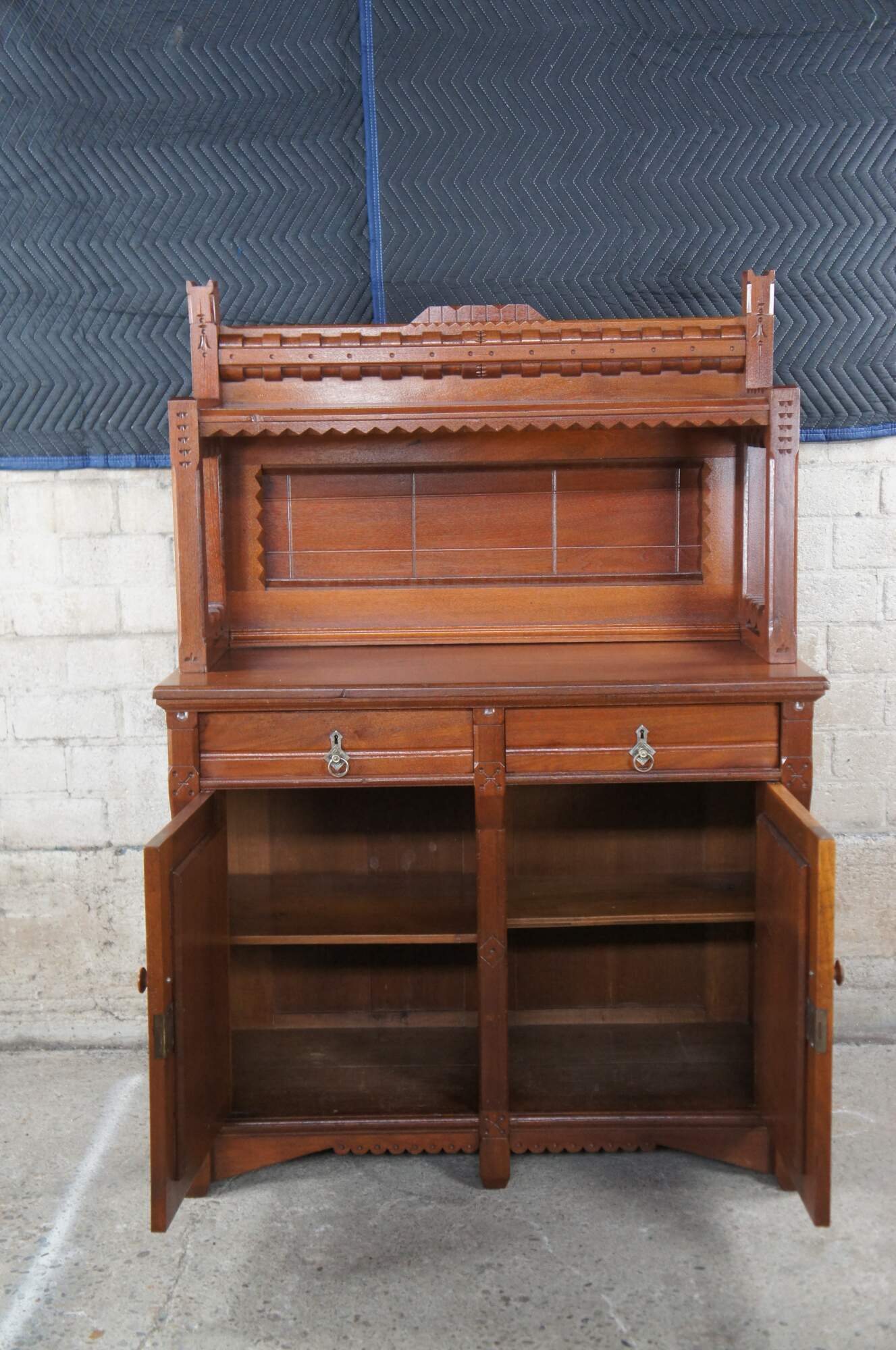 A beautiful Victorian era Eastlake sideboard, server or dry bar. Made from walnut with a uniquely carved backsplash featuring sawtooth and contoured molding. The paneled backing can be removed and replaced with a mirror. The base features two hand dovetailed drawers over a lower cabinet with shelf. Originally purchased from the Crane-Hinman Hardware Co of Yazoo Mississippi, circa 19th century