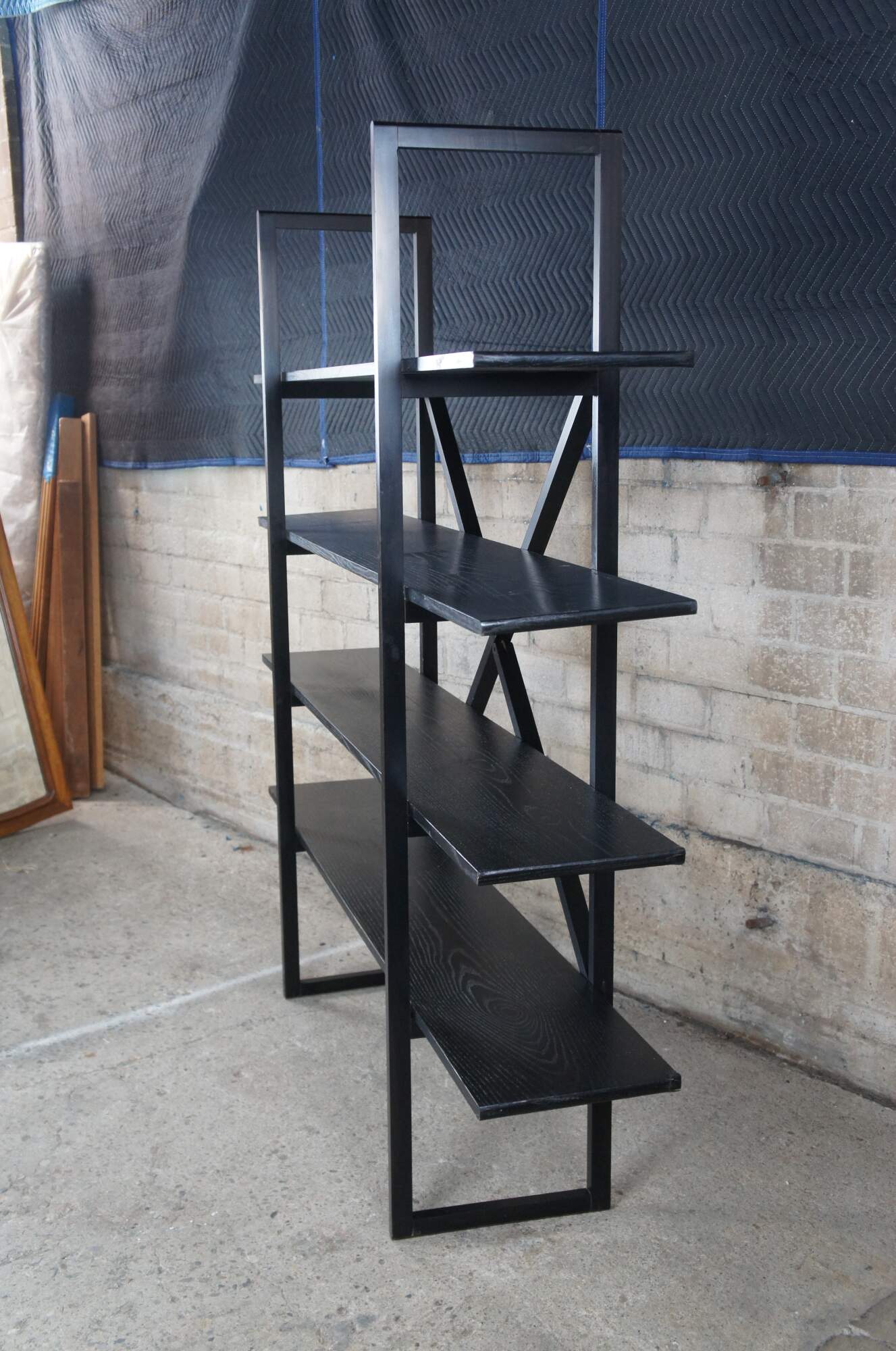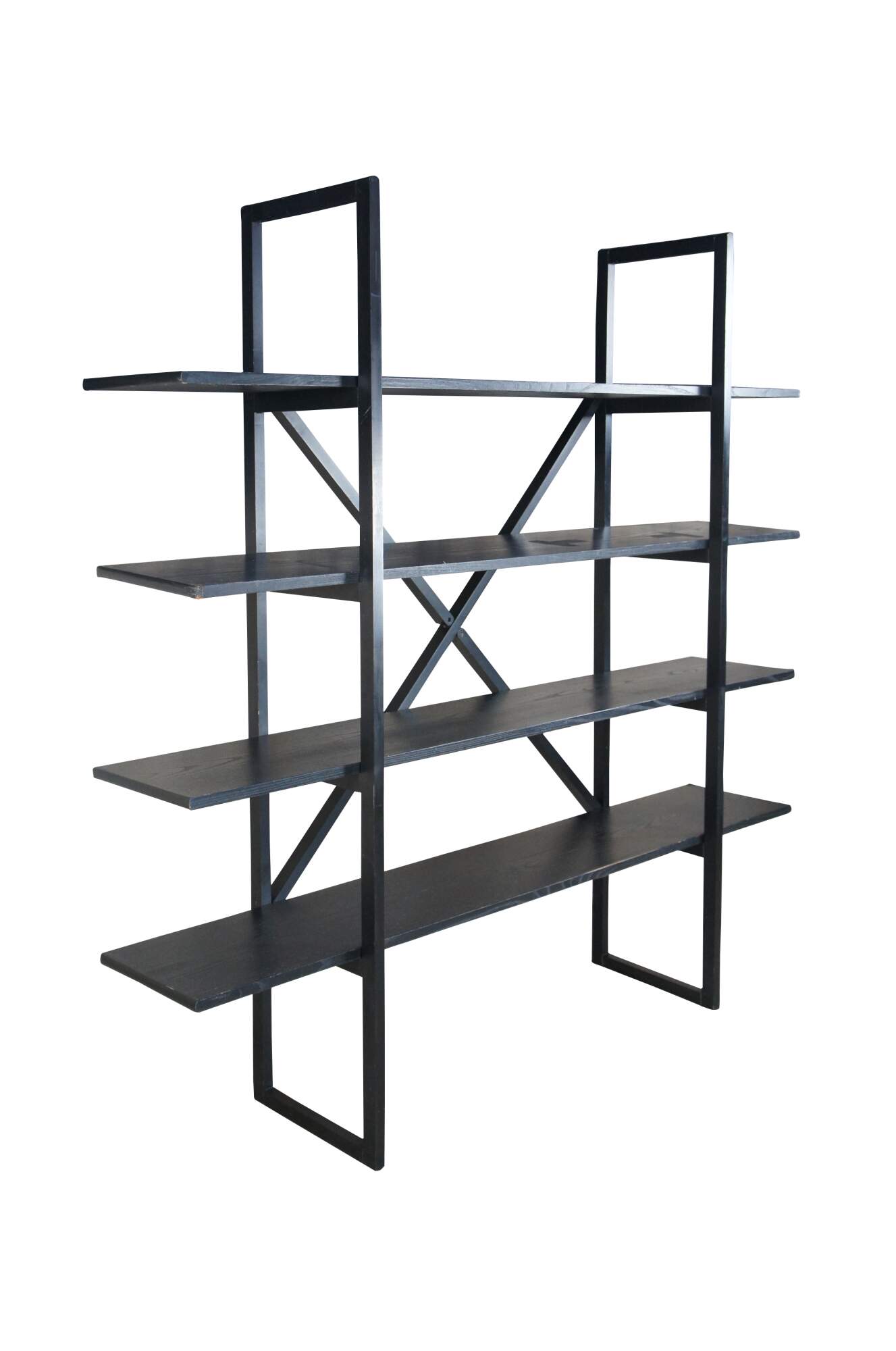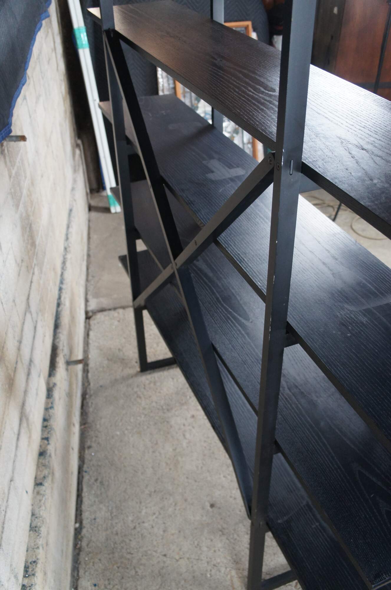 An open frame industrial style x frame bookcase or room divider from the last quarter of the 20th century. Made from oak with four long shelves. The unit can be broken down folding up nicely for storage. Inspired by Niels Gammelgaard design that was amde fro Ikea in the early 1980s.