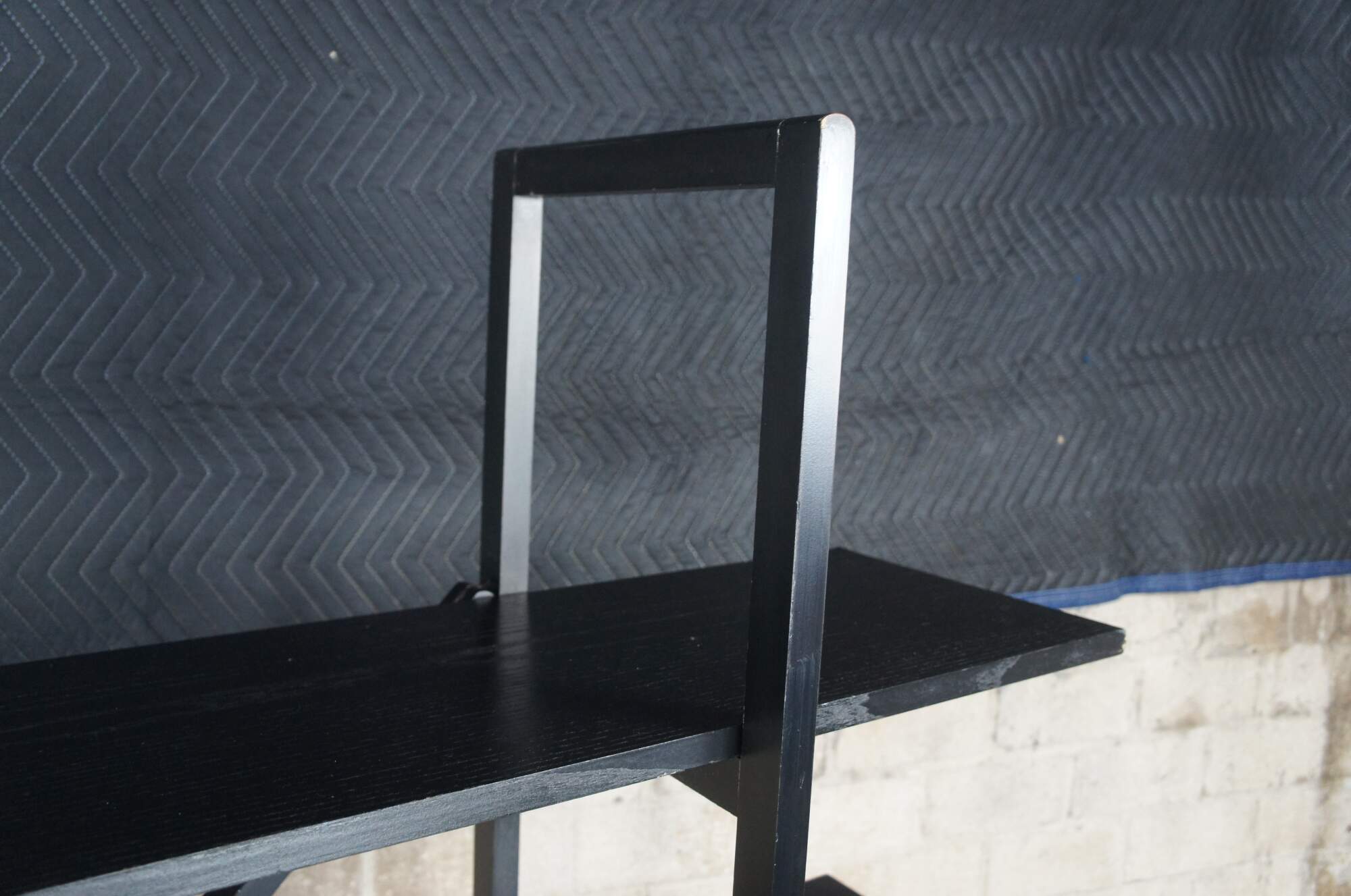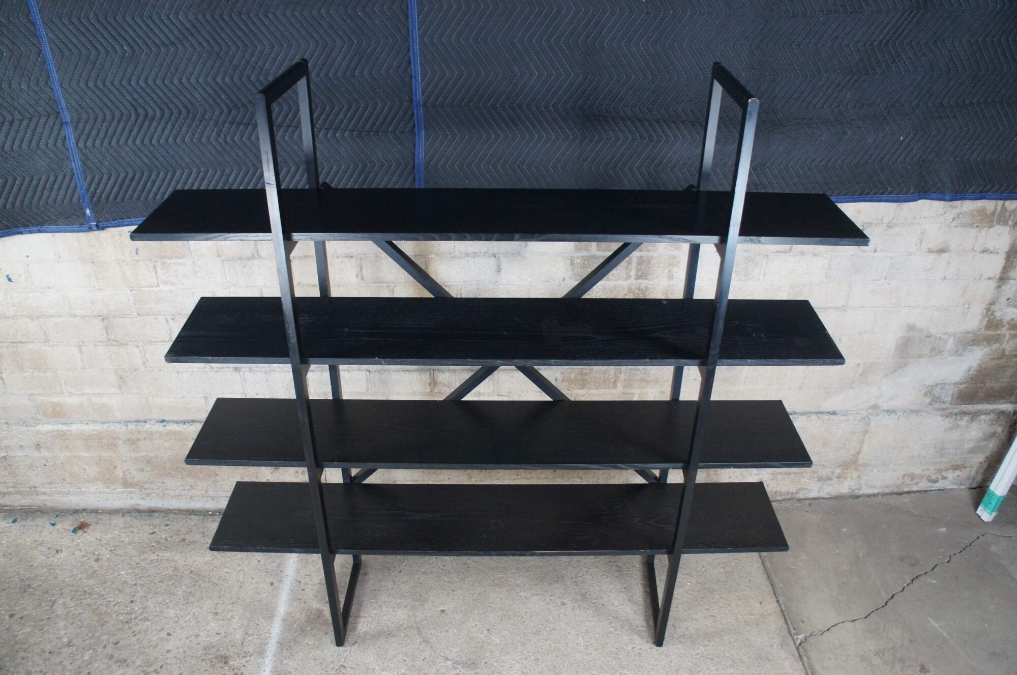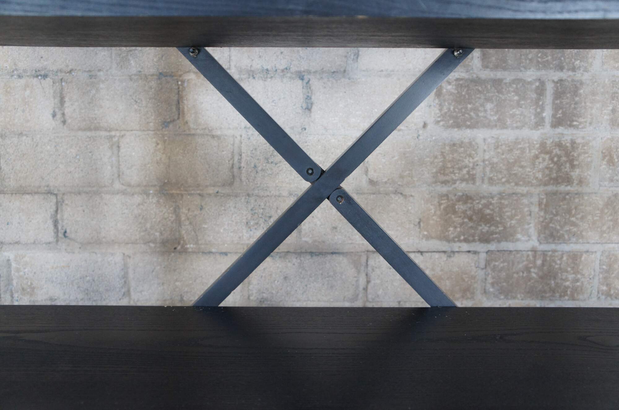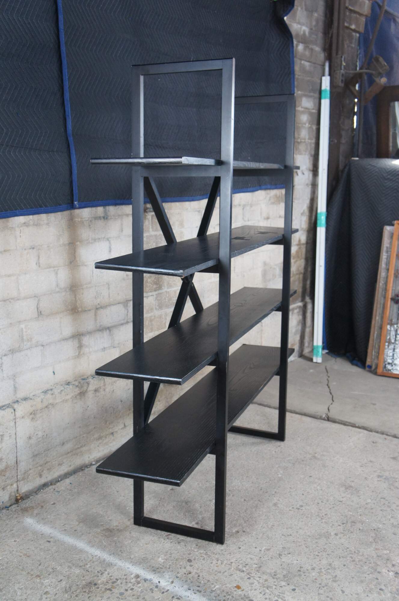 An open frame industrial style x frame bookcase or room divider from the last quarter of the 20th century. Made from oak with four long shelves. The unit can be broken down folding up nicely for storage. Inspired by Niels Gammelgaard design that was amde fro Ikea in the early 1980s.