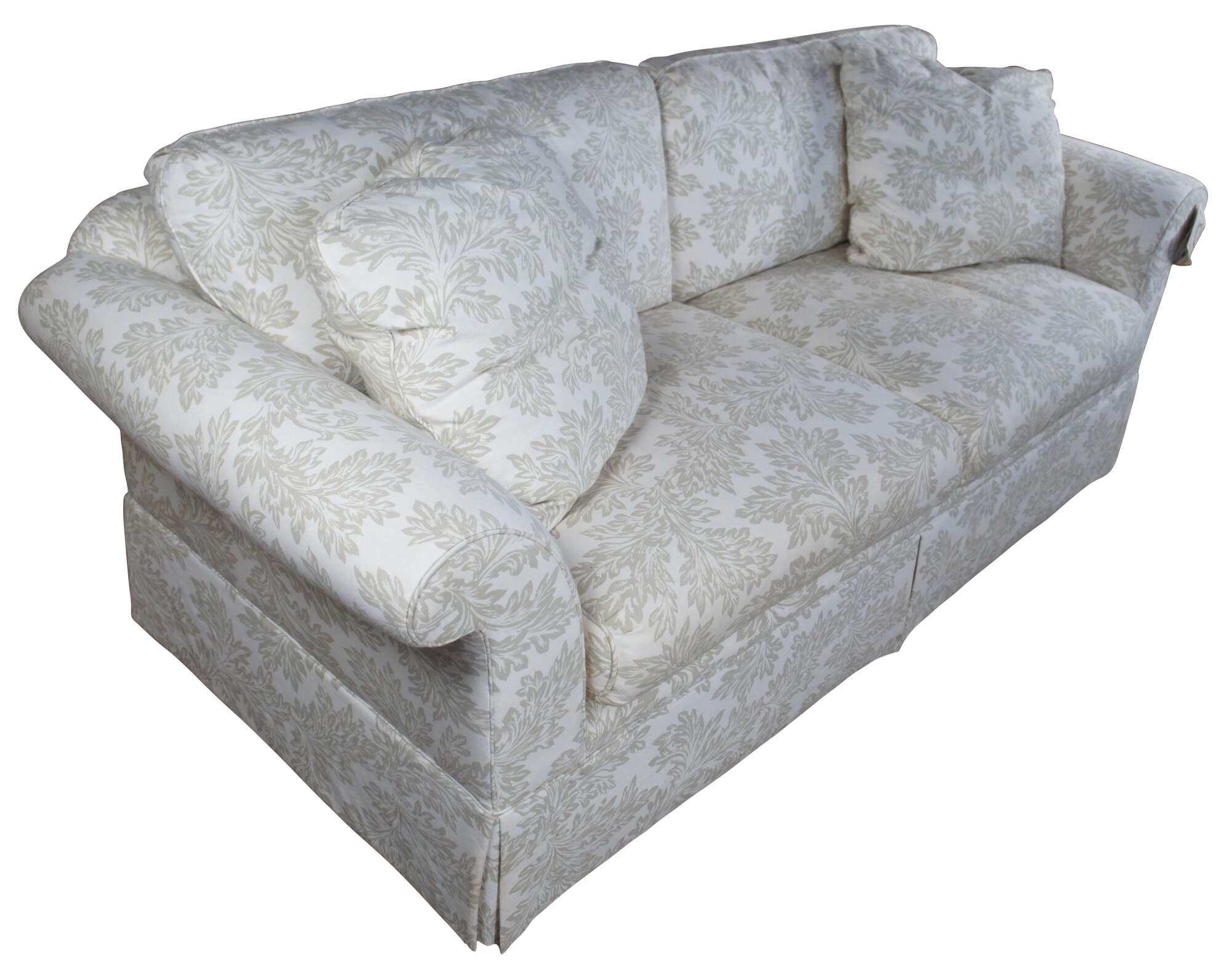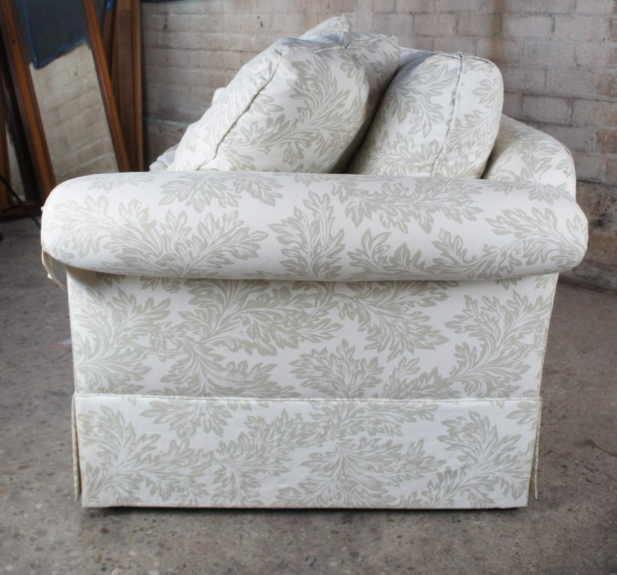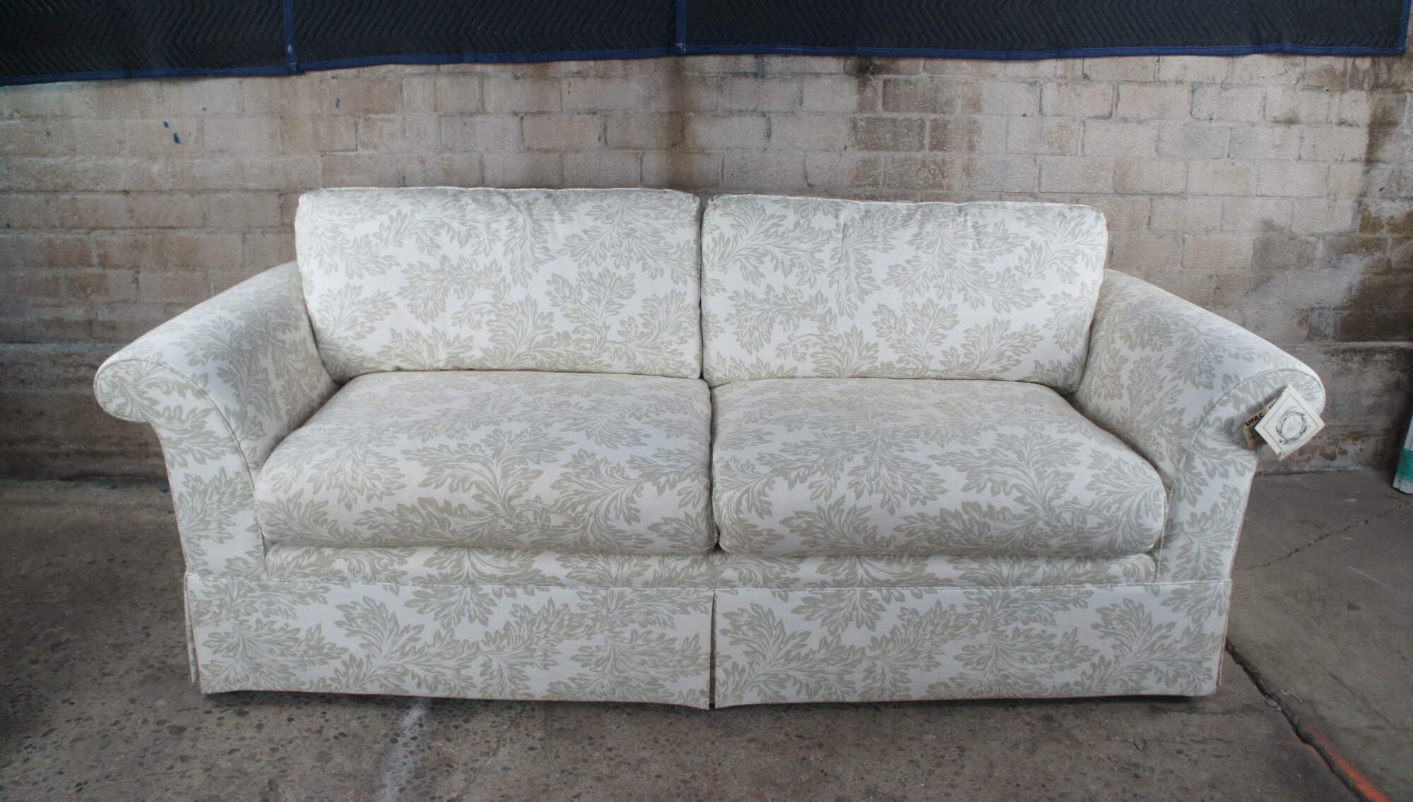 Vintage Baker Crown & Tulip Collection Sofa, circa last quarter 20th century. Features a rectangular form with rolled arms, down filled cushions and throw pillows. #6819-88C. Upholstered in an off-white fabric with olive green / acanthus design. Bares the original tags which are attached to the arm.