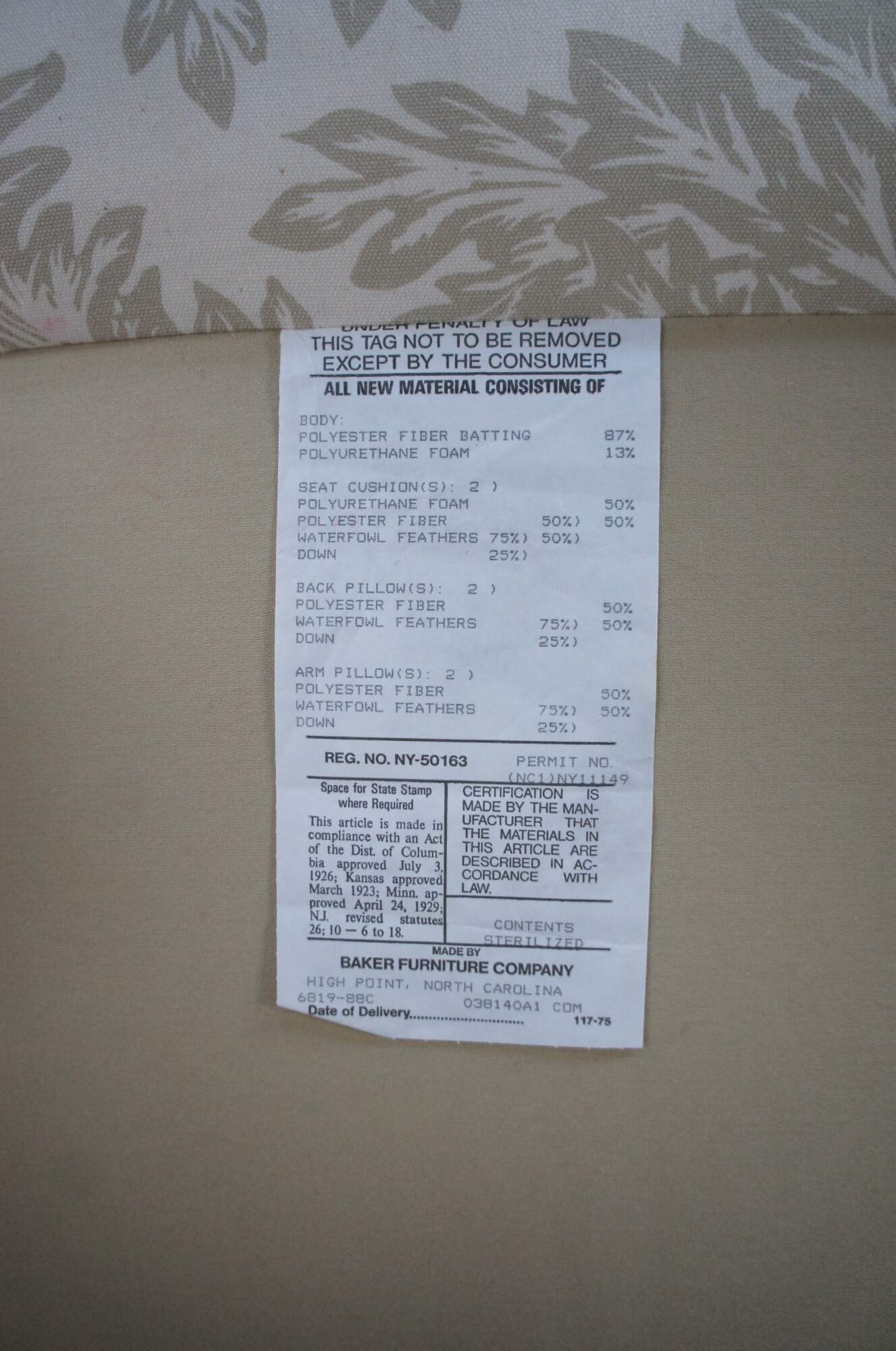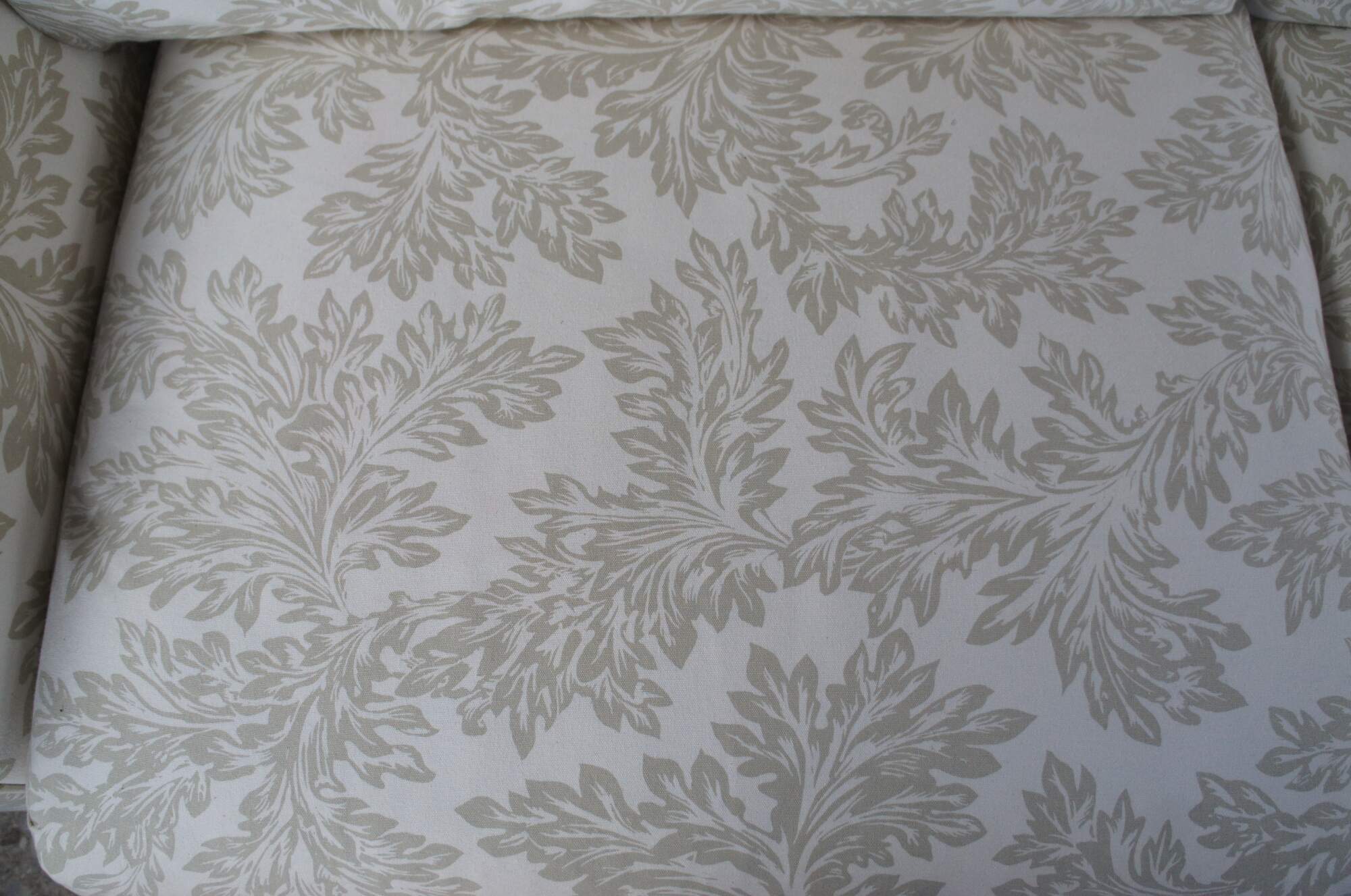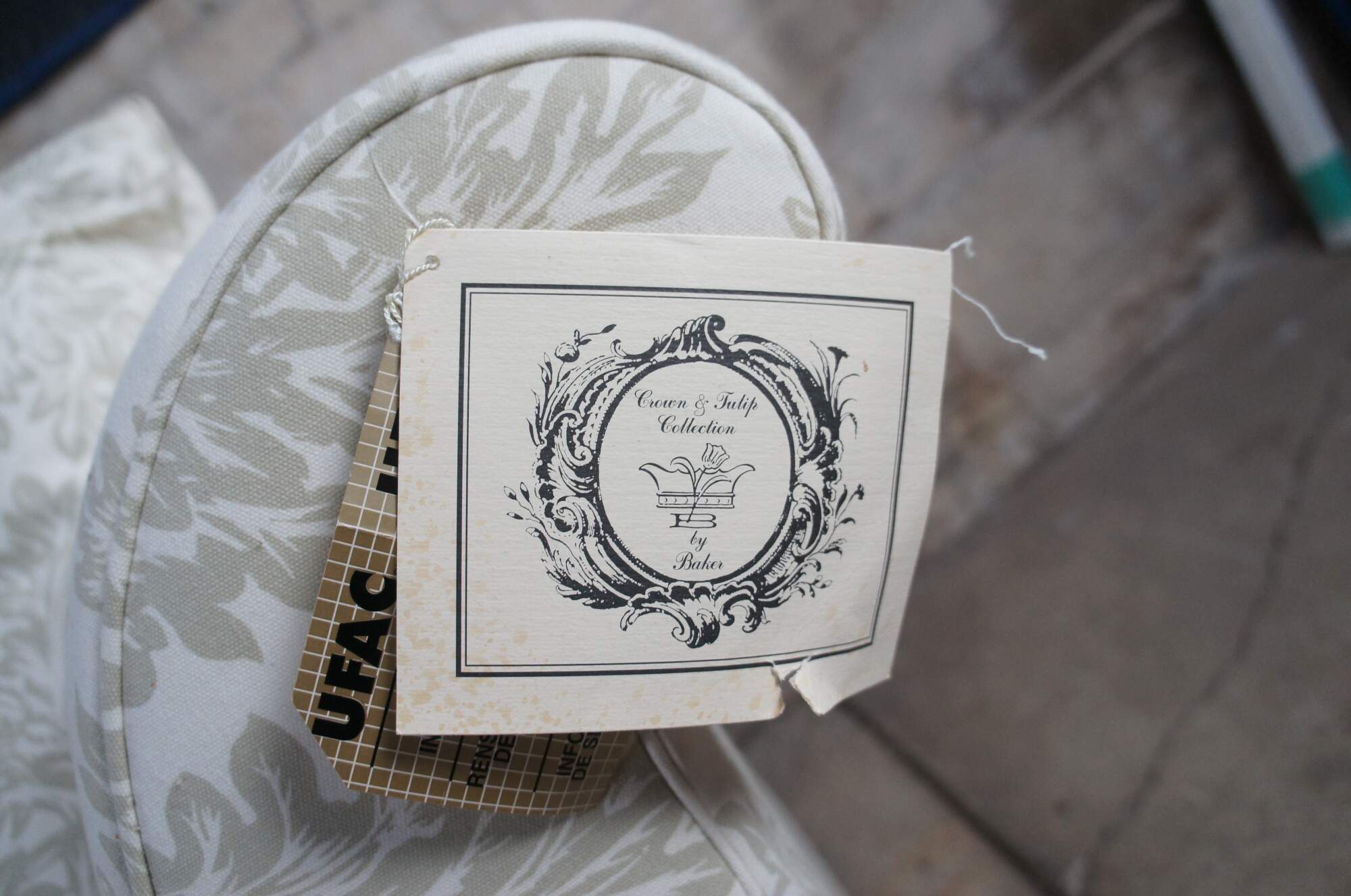 Vintage Baker Crown & Tulip Collection Sofa, circa last quarter 20th century. Features a rectangular form with rolled arms, down filled cushions and throw pillows. #6819-88C. Upholstered in an off-white fabric with olive green / acanthus design. Bares the original tags which are attached to the arm.