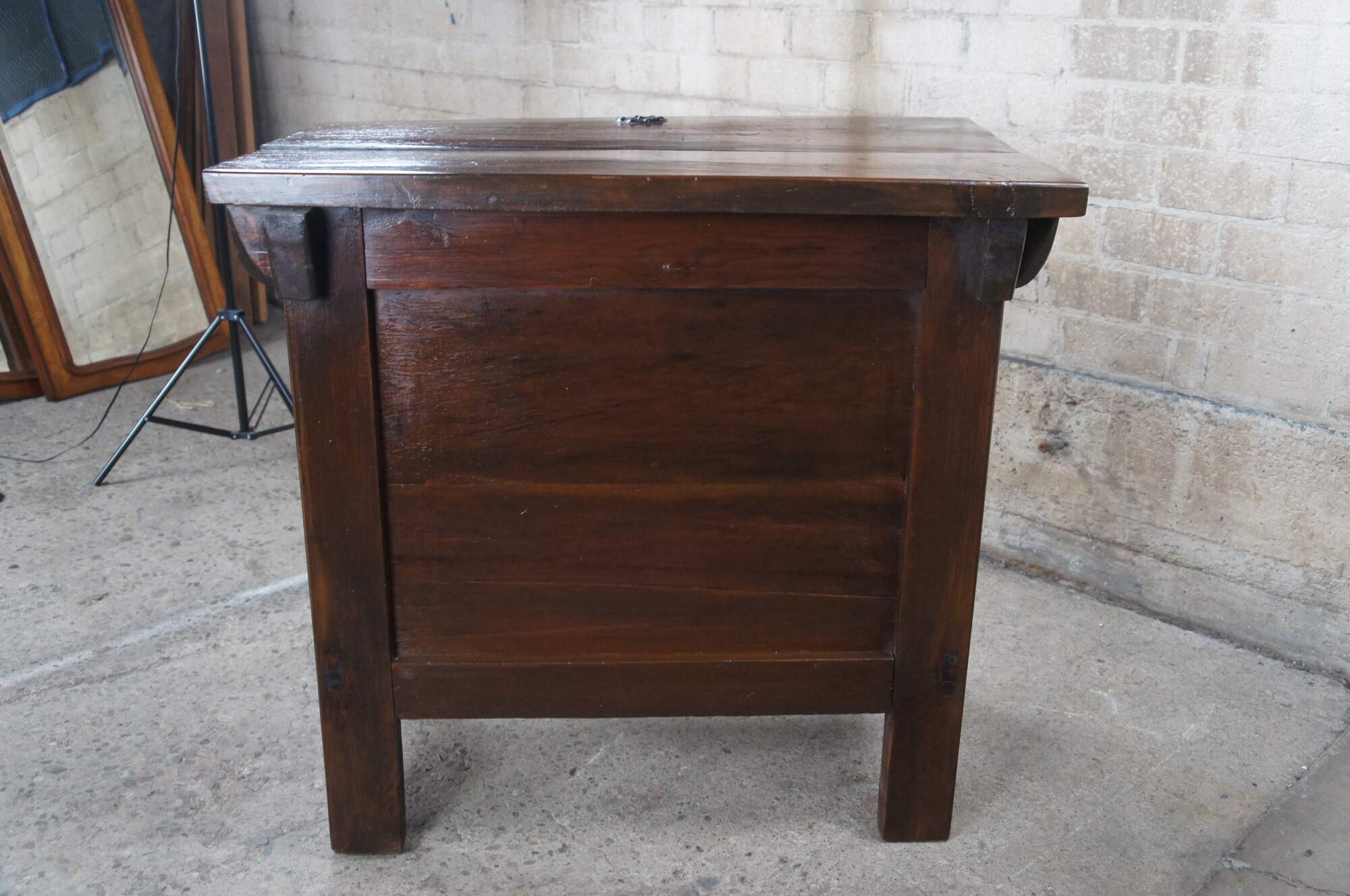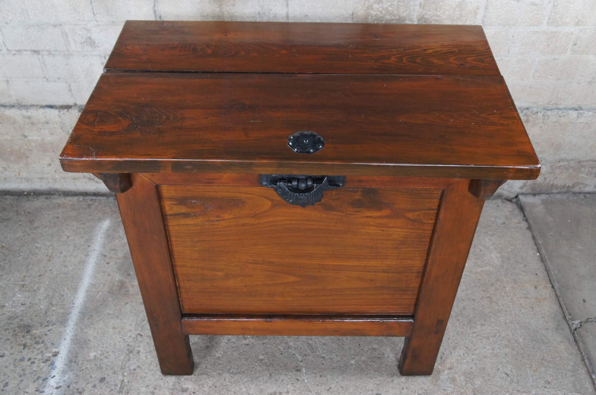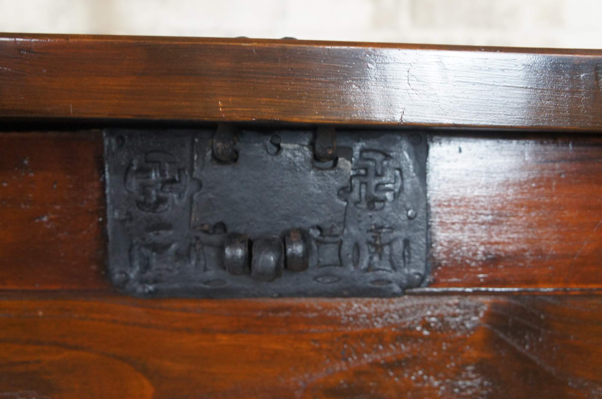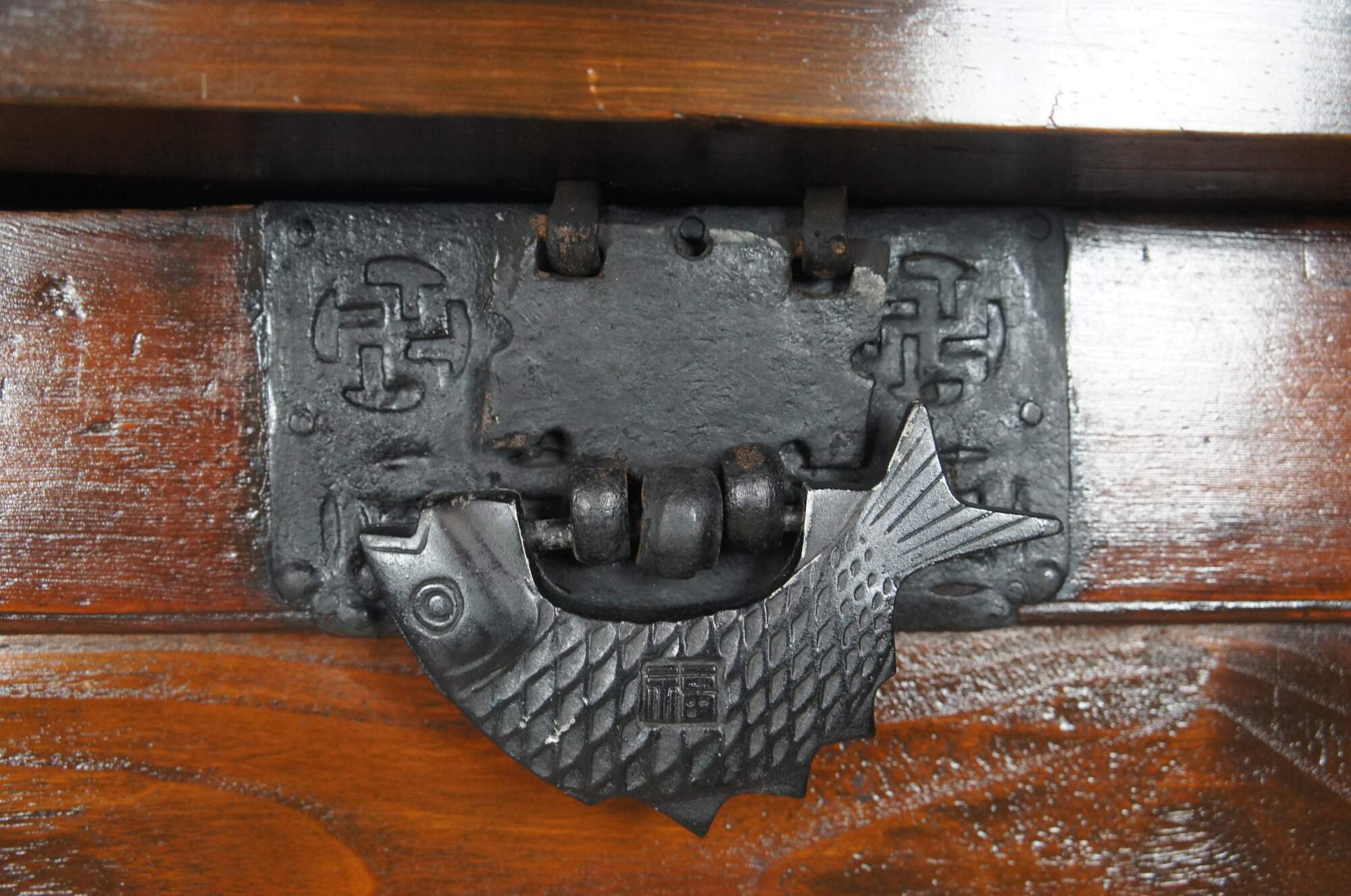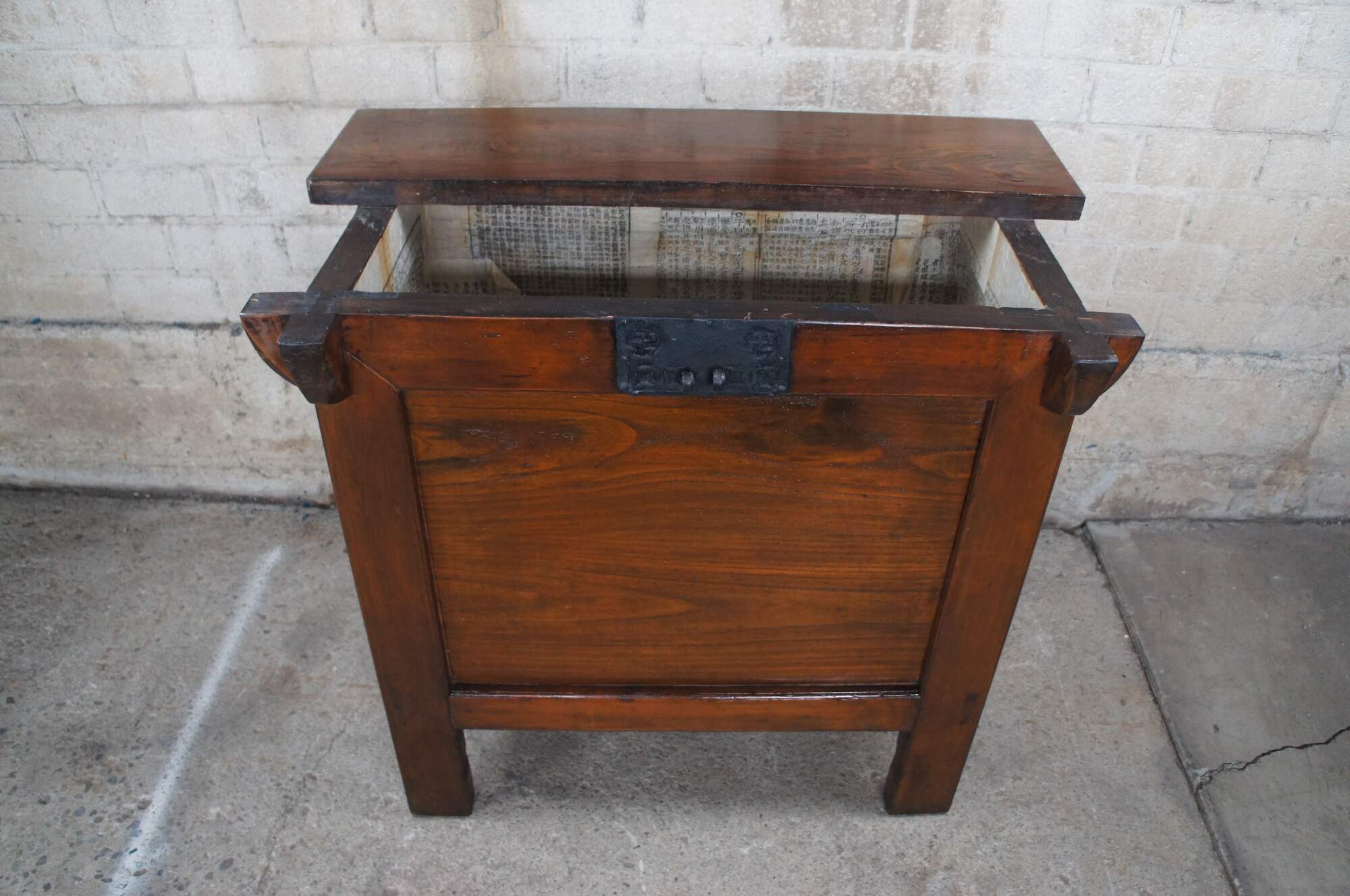 20th century Korean elm rice bin or cabinet. A rectangular form made from elm with a removable top for storage. The interior is paperlined with calligraphy. The chest is made using mortise and tenon joinery. Features a working iron fish lock.