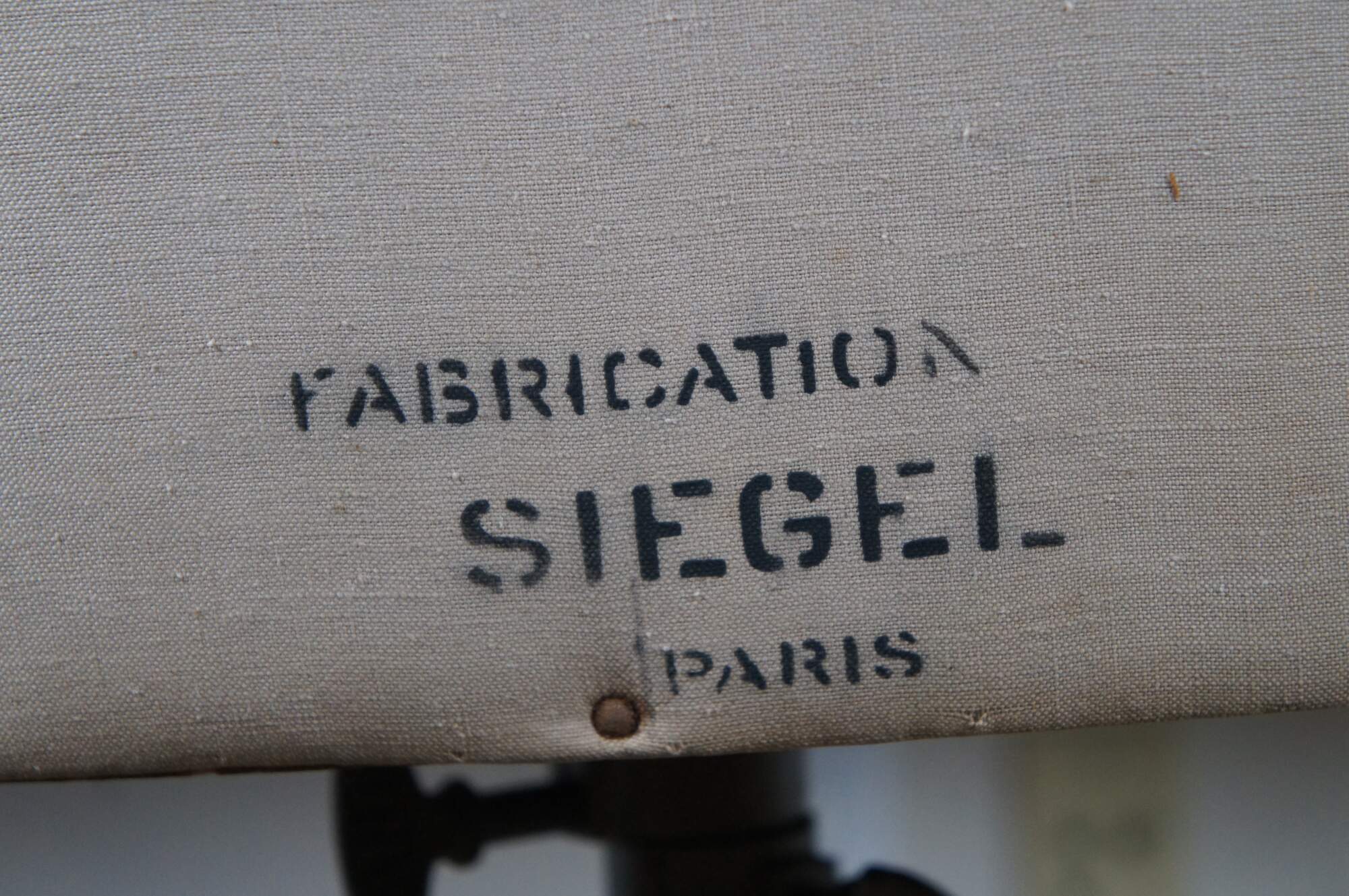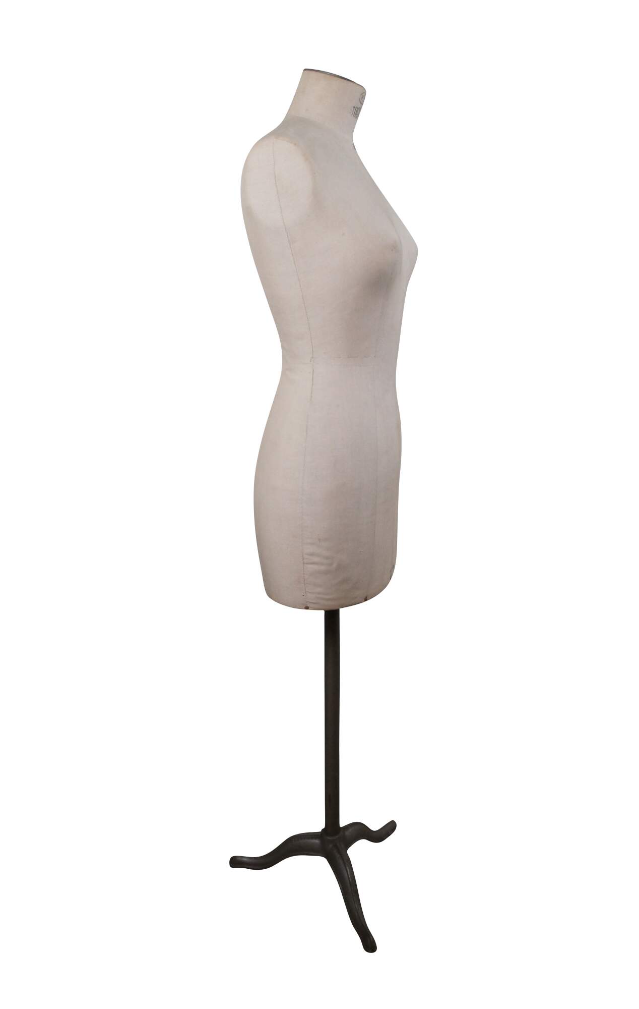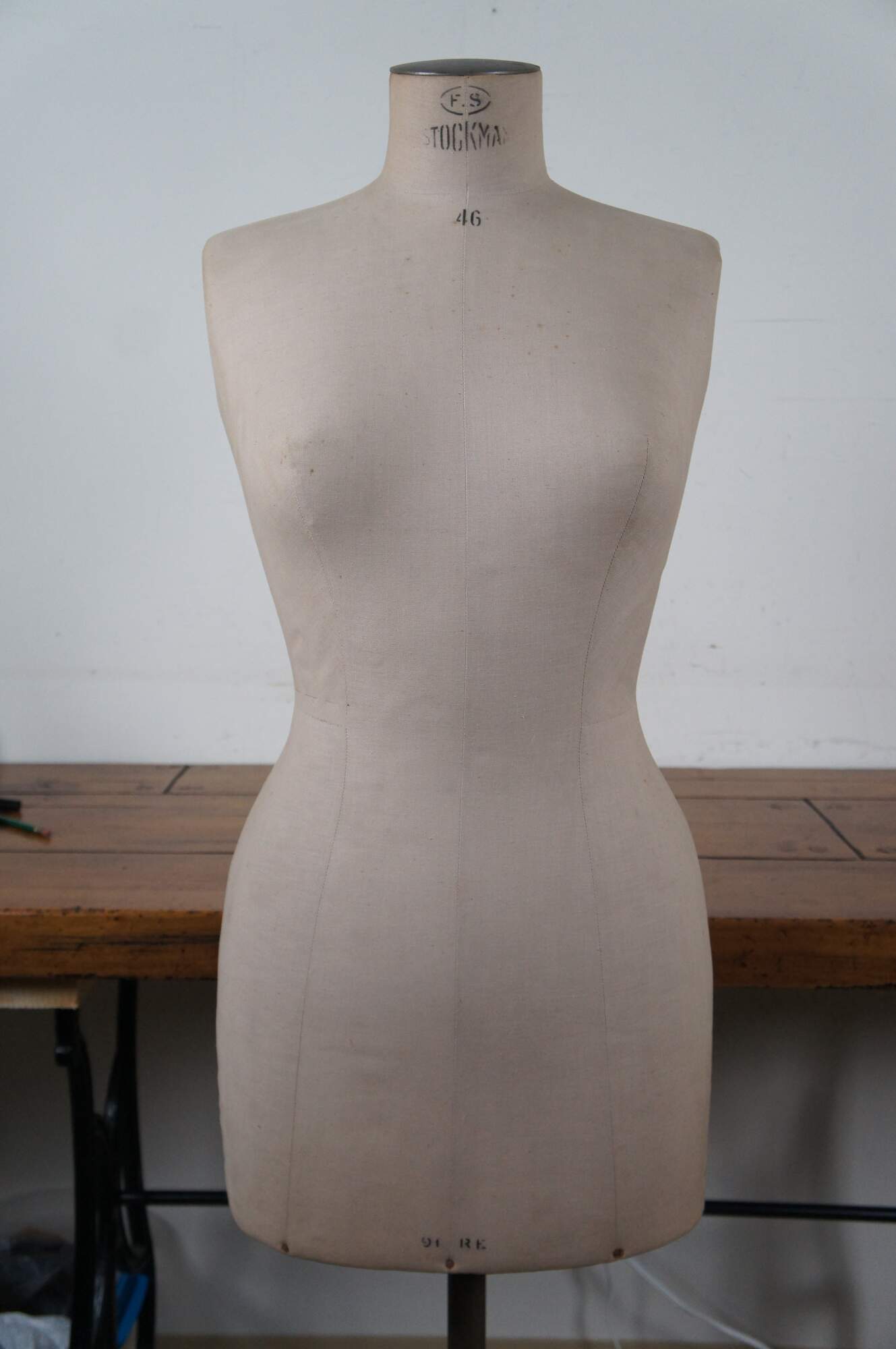 Vintage Frederic Stockman & Siegel dress form / sewing model. Size number 46. Paper mache bust, with padded linen covering, and original adjustable metal/iron base. Stamped F.S. Stockman 46 at the neck, 91 RE at lower front, and Fabrication Siegel Paris at lower back. Base and adjustment screw also marked Stockman. Measurements: Shoulders - 15” / Bust - 38” / Waist - 27” / Hips – 38”