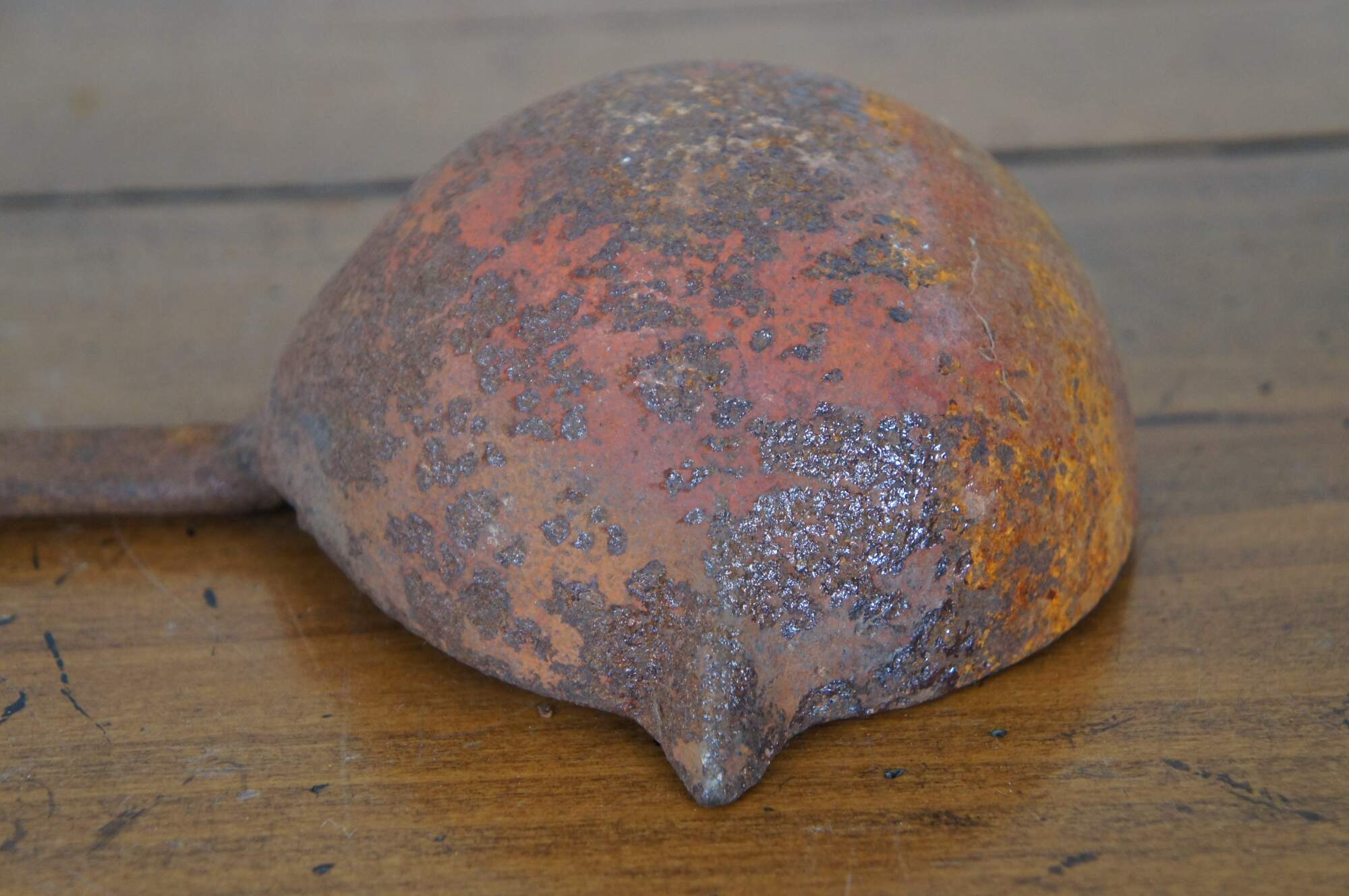 Antique cast iron lead casting / melting ladle with precision double pour spouts and hole in handle end for hanging.