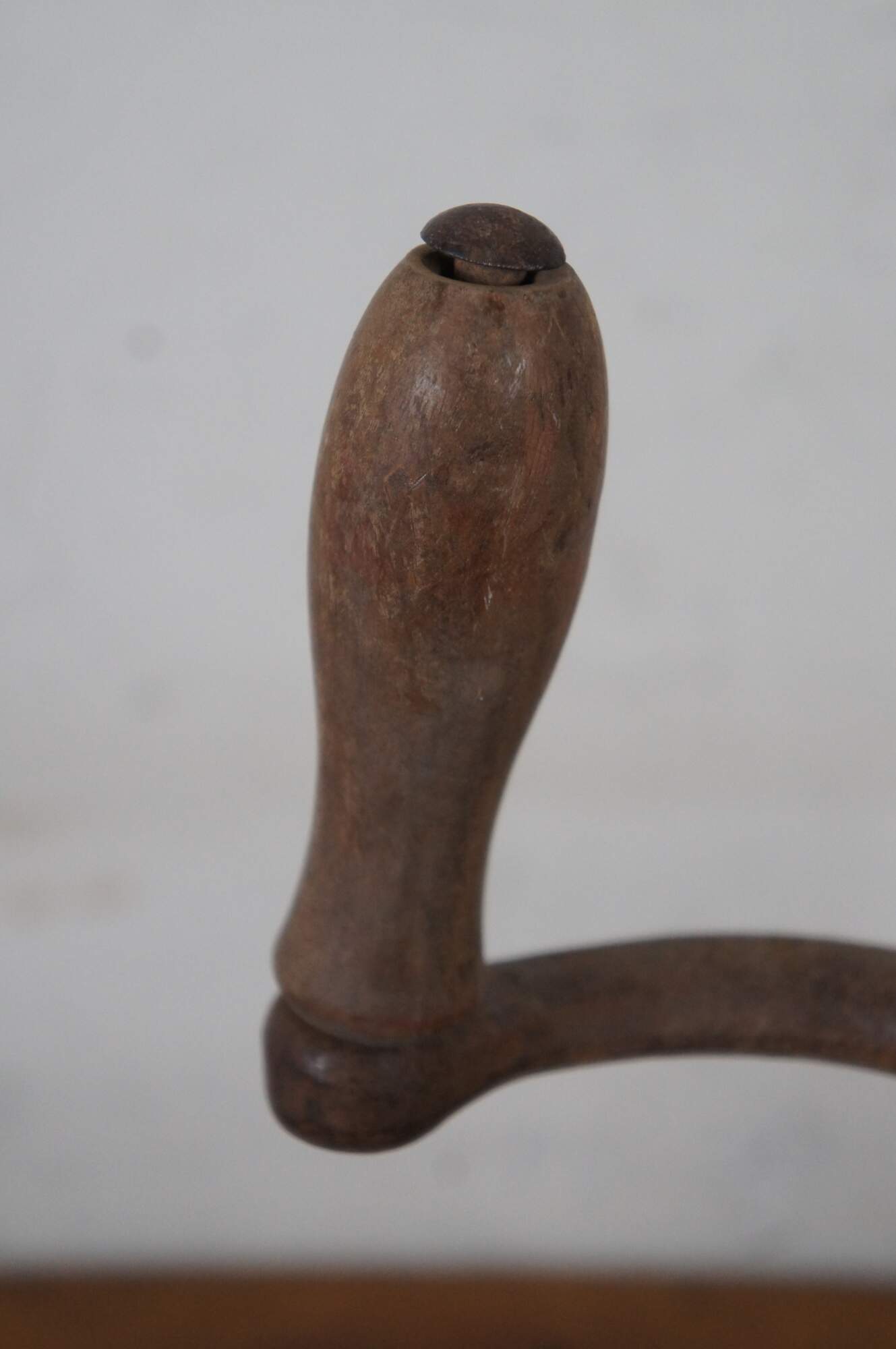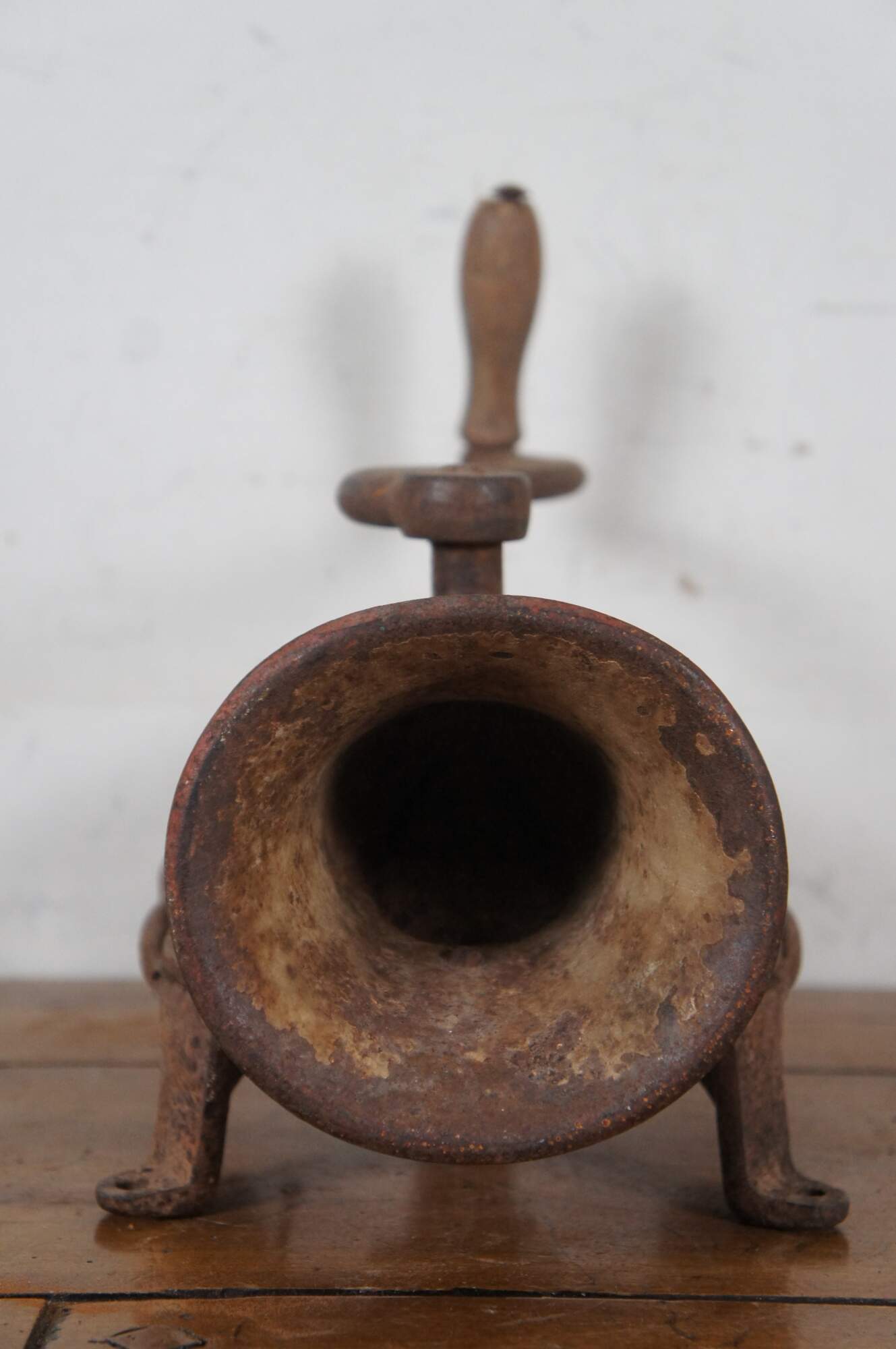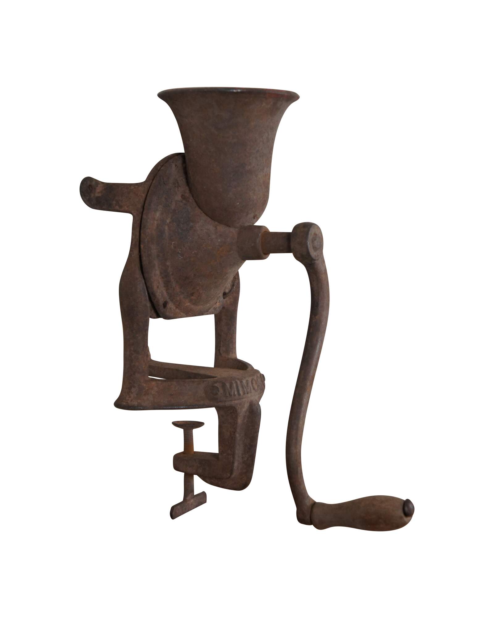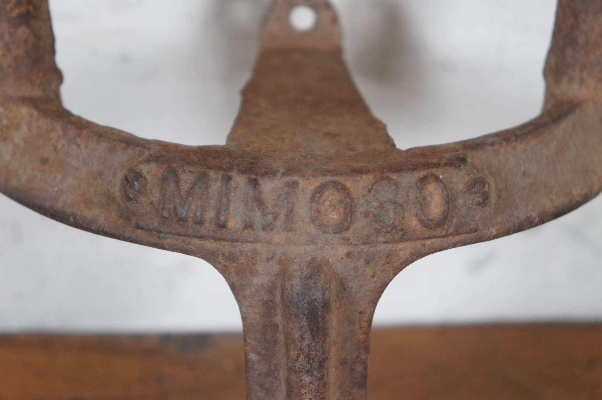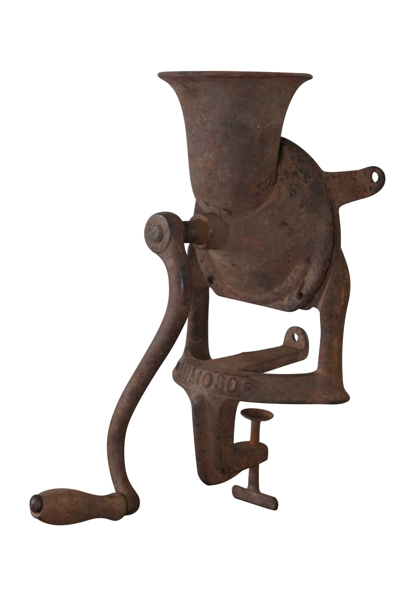 Antique Mimoso number 4 wall / table mount coffee grinder. Made of iron with turned wood grip on the handle.
