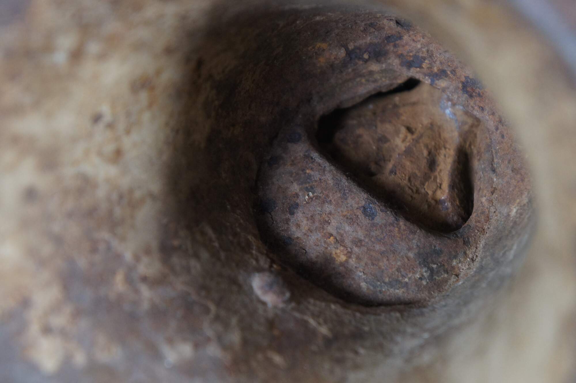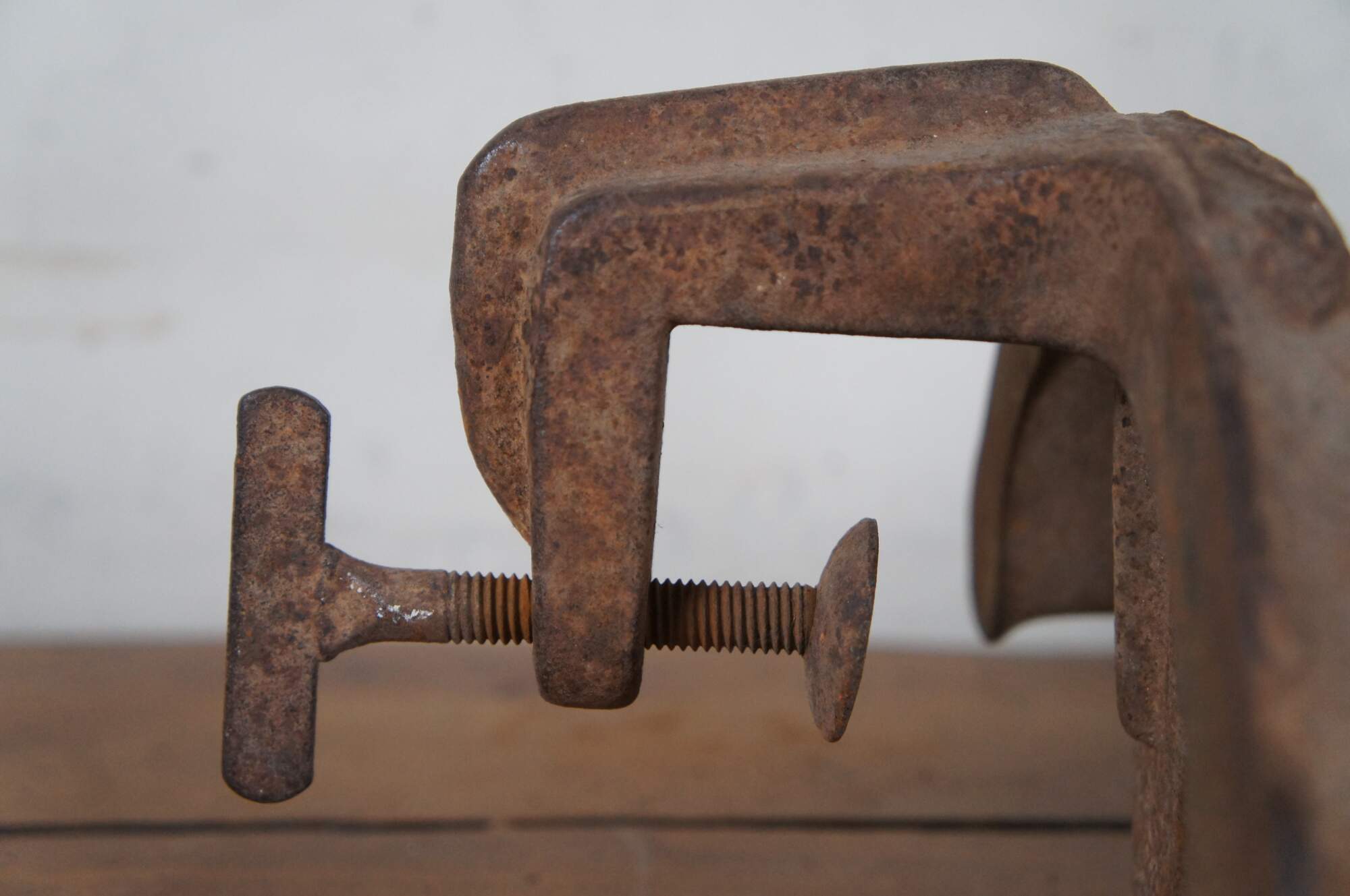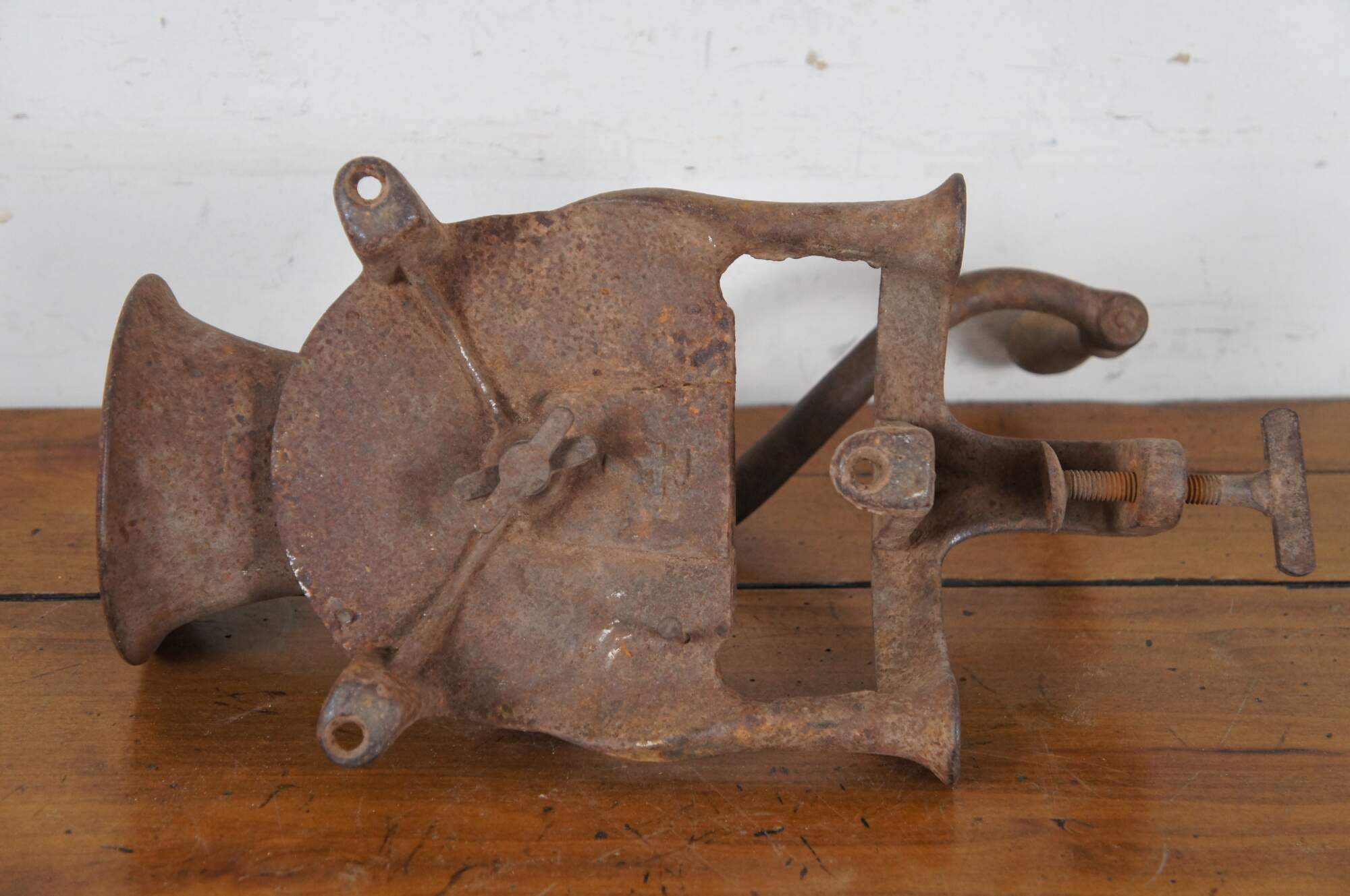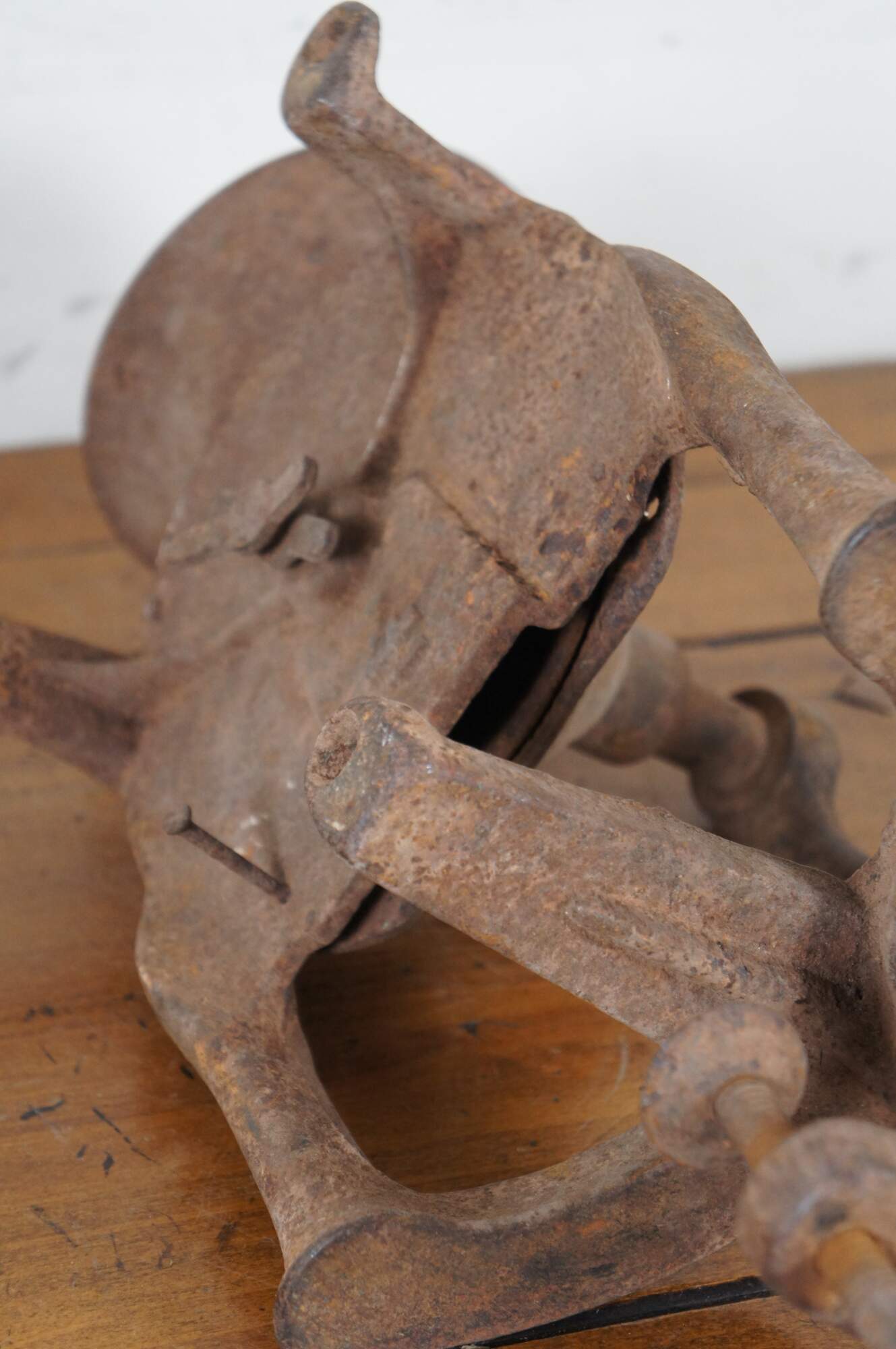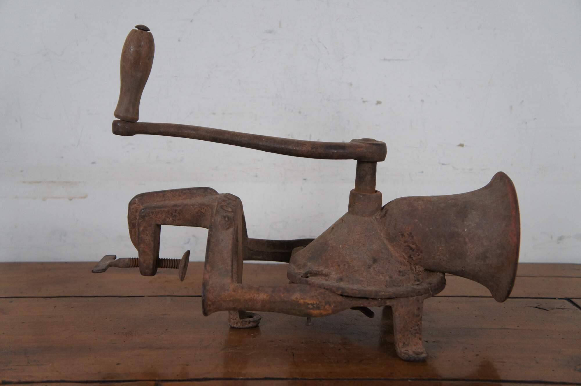 Antique Mimoso number 4 wall / table mount coffee grinder. Made of iron with turned wood grip on the handle.