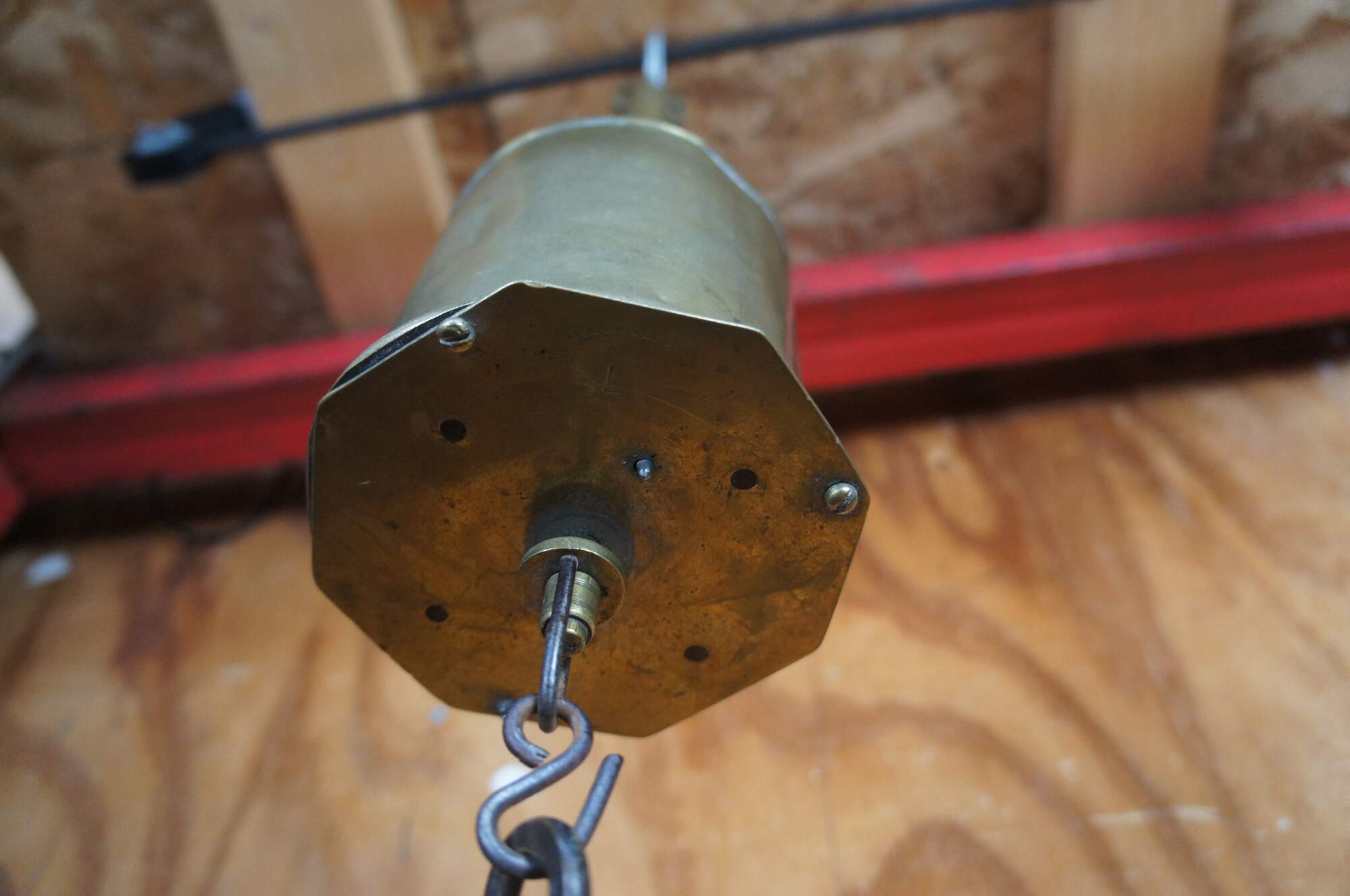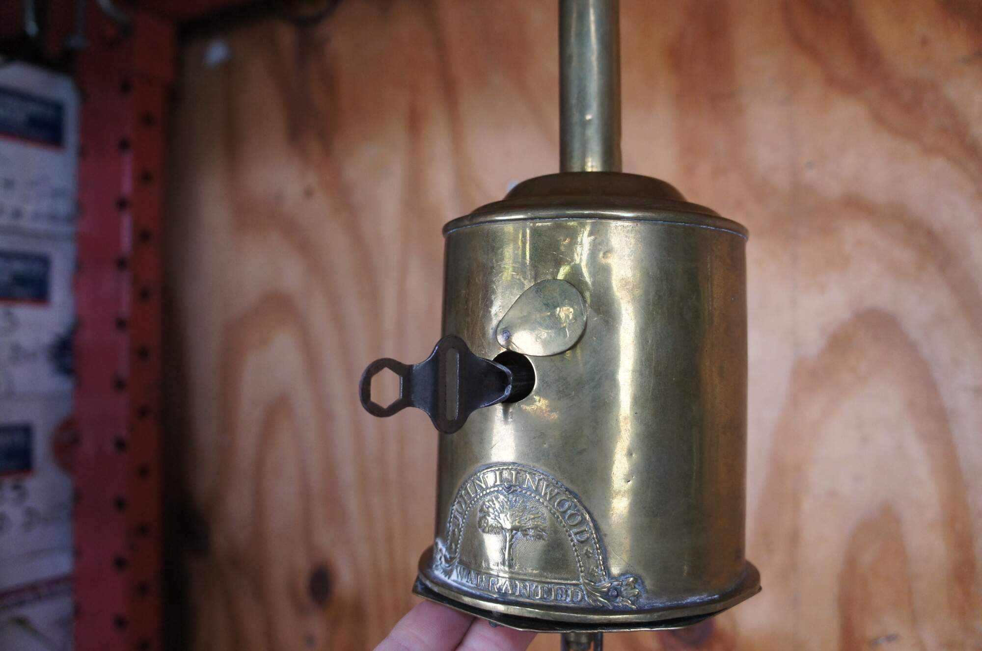 Antique John Linwood clock works Bottle-jack or meat-jack (also called roasting jack or spit jack). Made from brass and used for rotating meat on a spit. The case is shaped like a bottle with clockwork motor in a cylinder on an octagonal base with hanging loop at top and unique multi hook system for meat below. Keyhole and cover along side of cylinder.