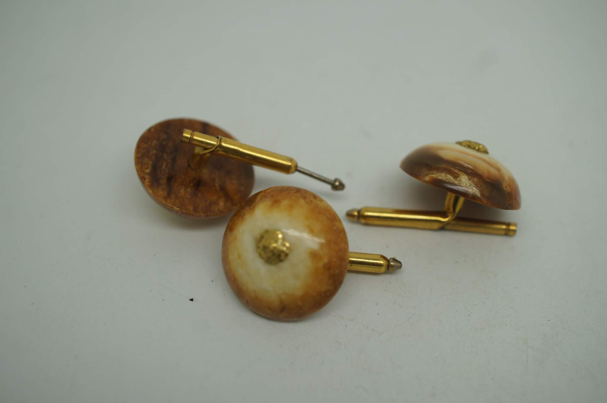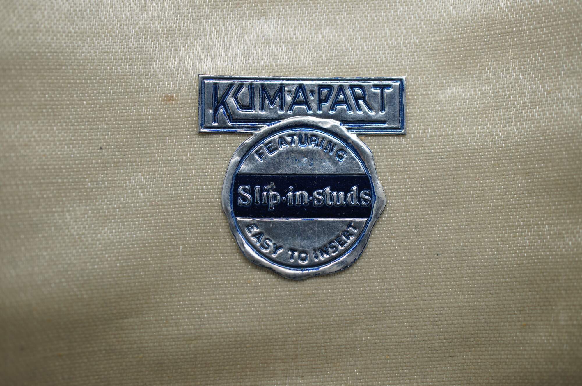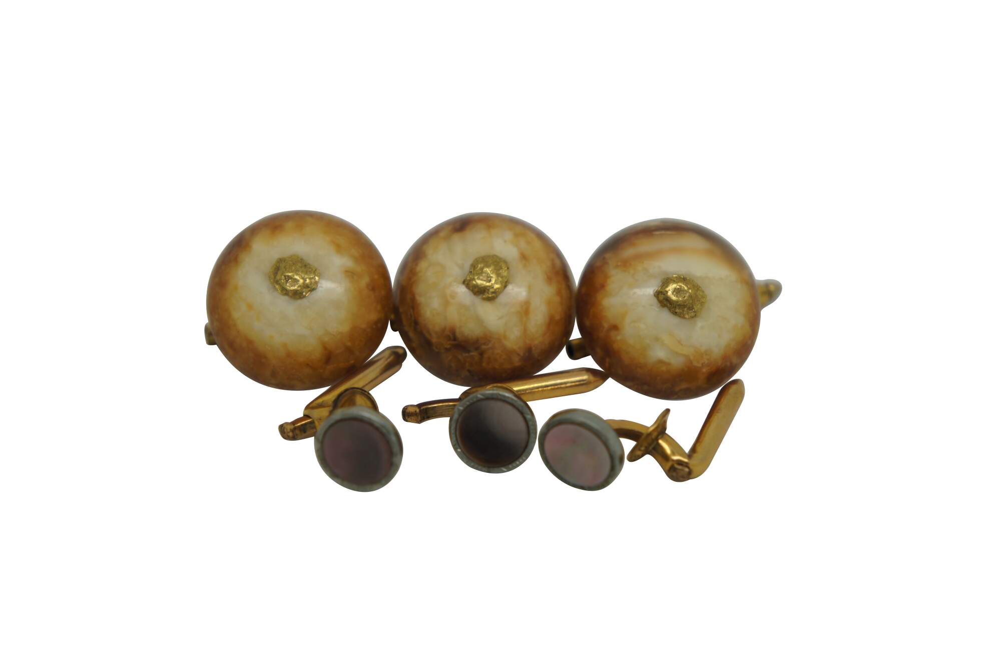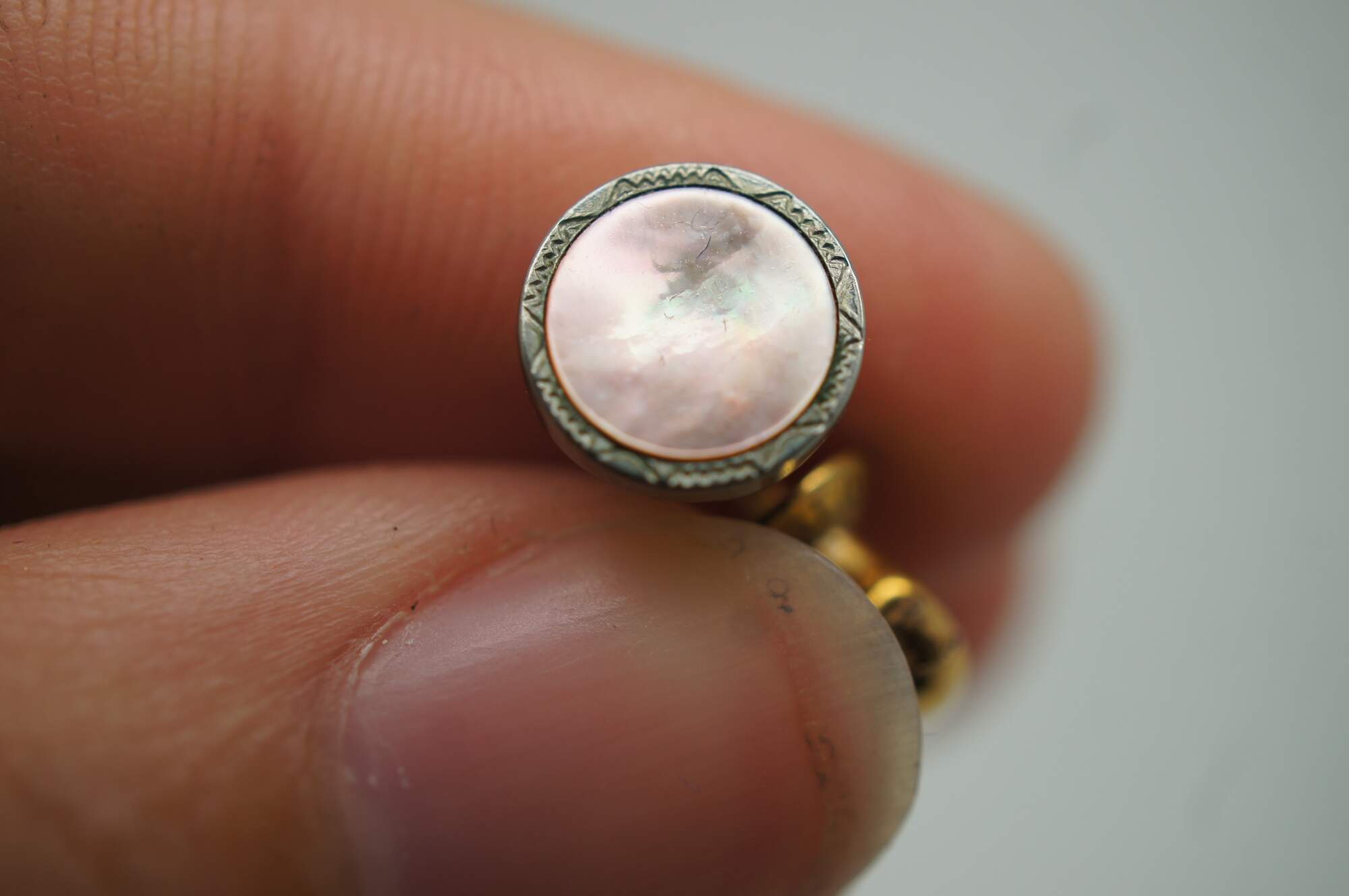 Lot of 6 antique 1920’s shirt studs in a Kum-a-part Slip in Studs box. Three are dome shaped white and brown stone accented with a gold nugget at the center. The other three feature mother of pearl discs framed in a silver tone frame etched with a geometric zig-zag. Patent Dec. 7, 1926. No matching cufflinks.