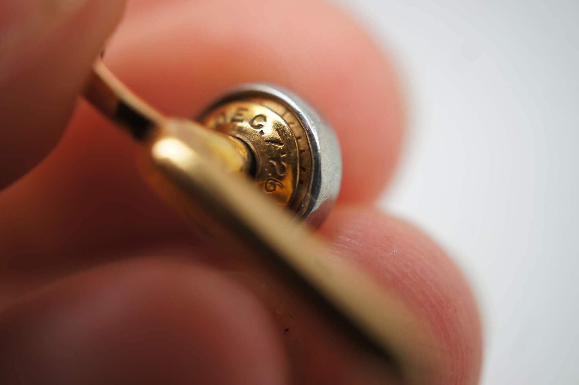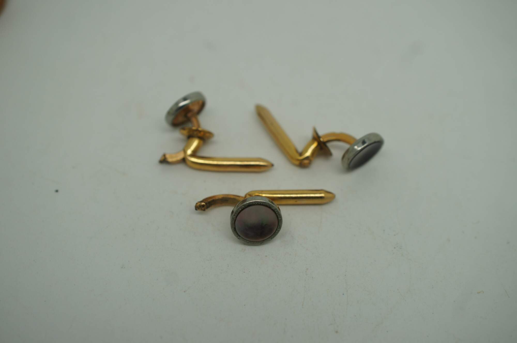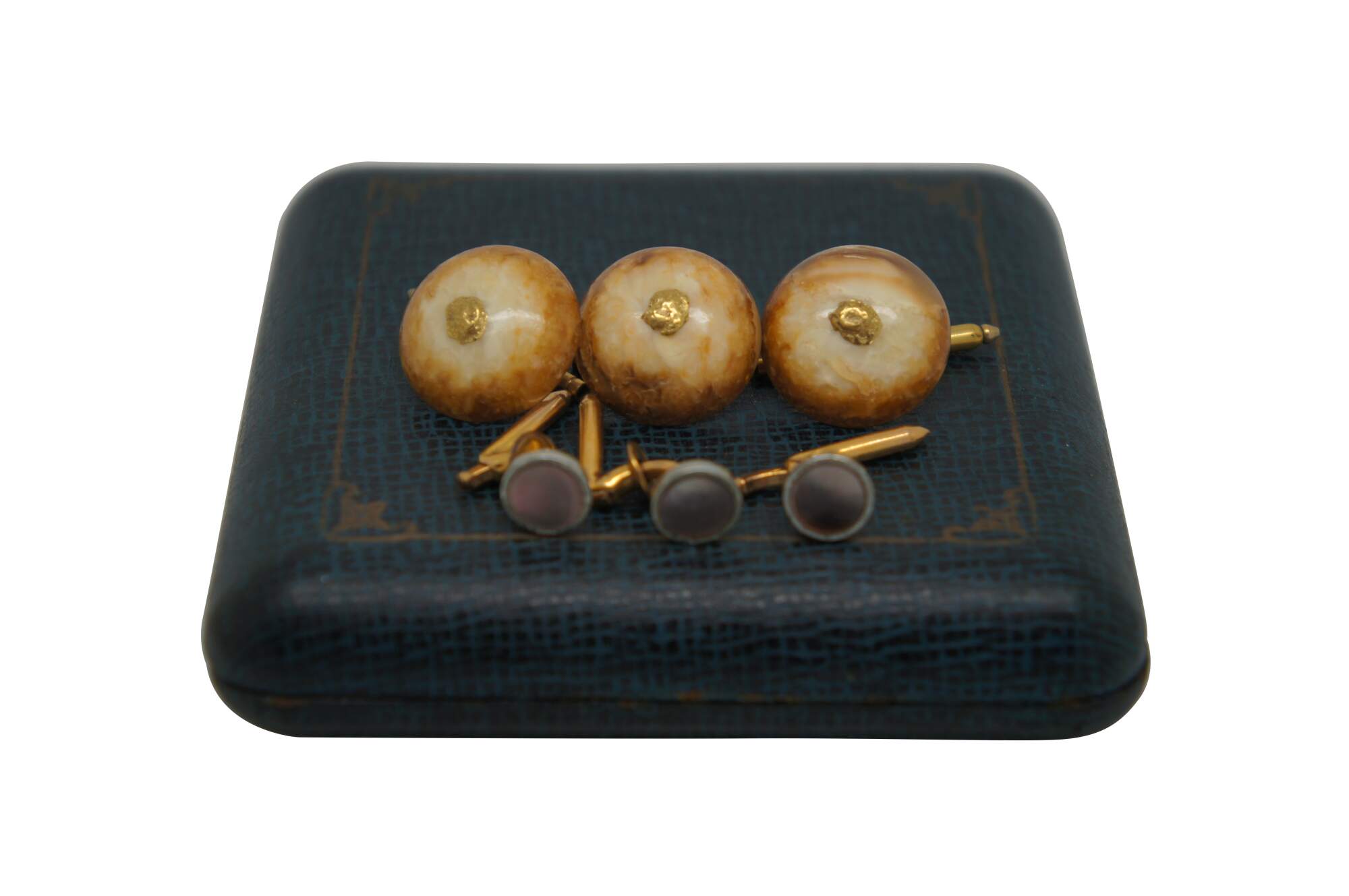 Lot of 6 antique 1920’s shirt studs in a Kum-a-part Slip in Studs box. Three are dome shaped white and brown stone accented with a gold nugget at the center. The other three feature mother of pearl discs framed in a silver tone frame etched with a geometric zig-zag. Patent Dec. 7, 1926. No matching cufflinks.
