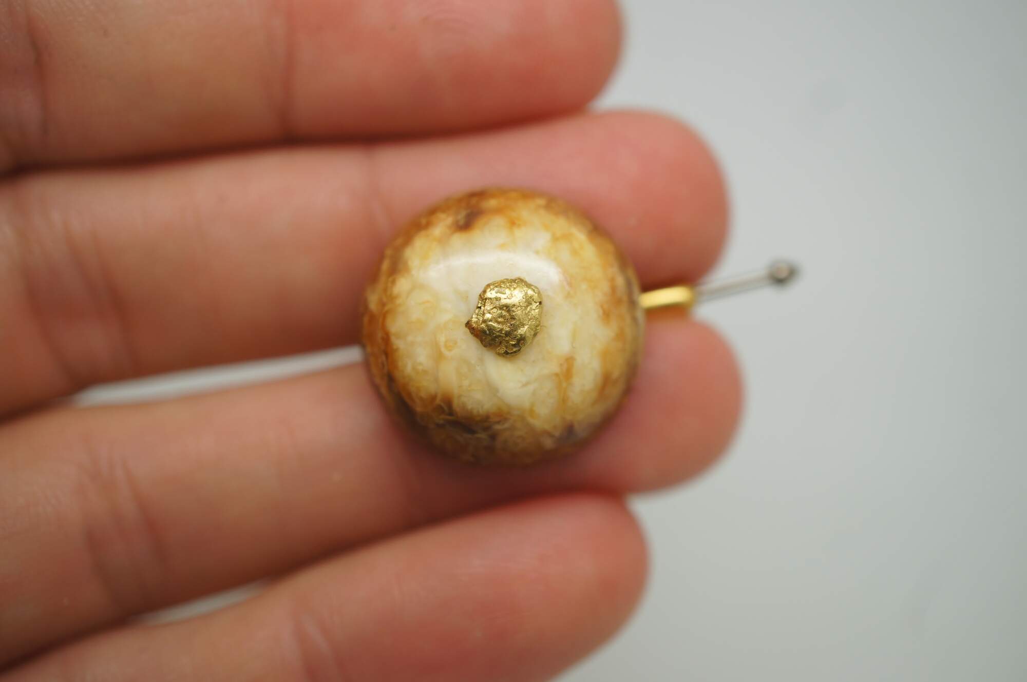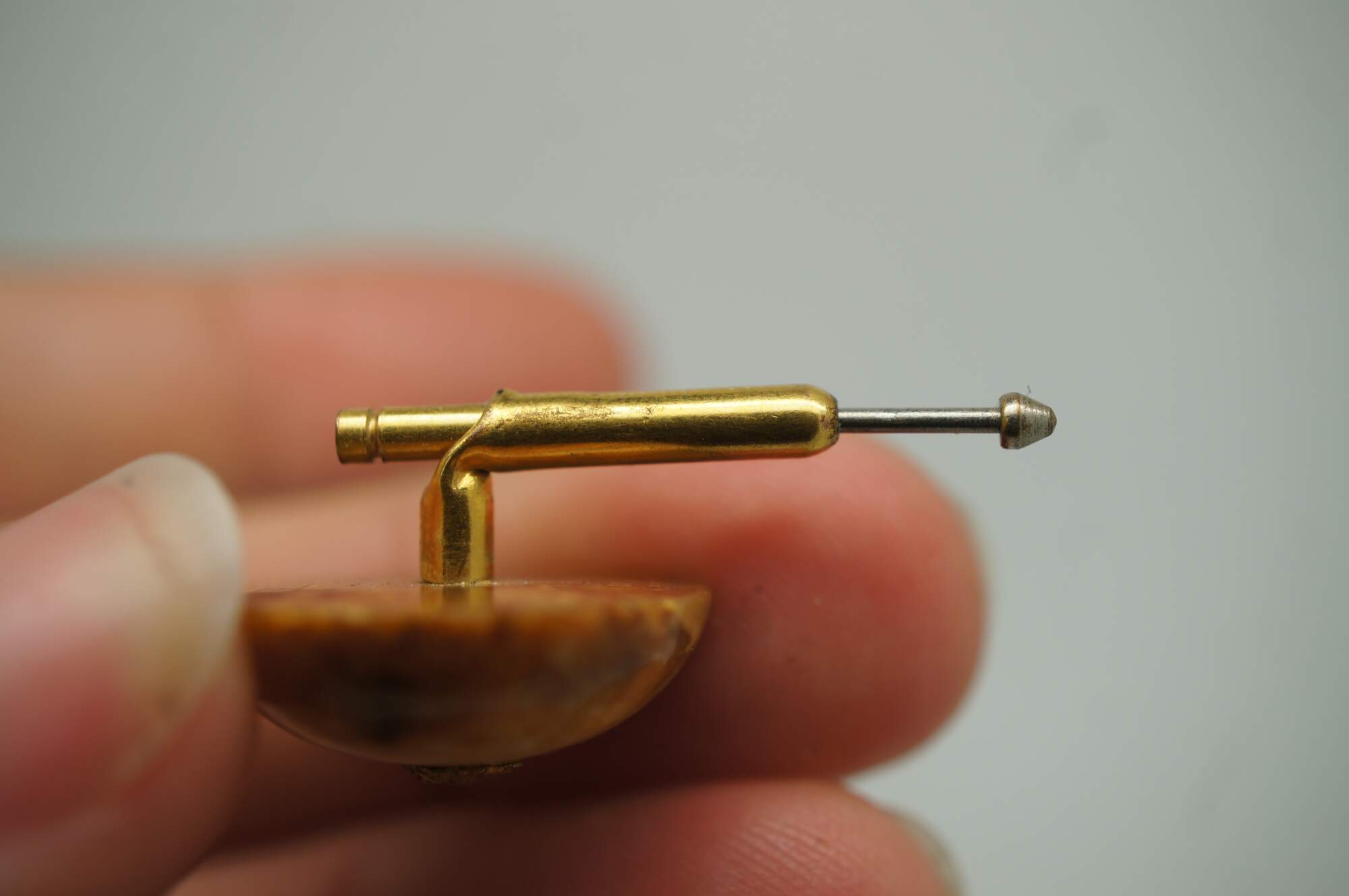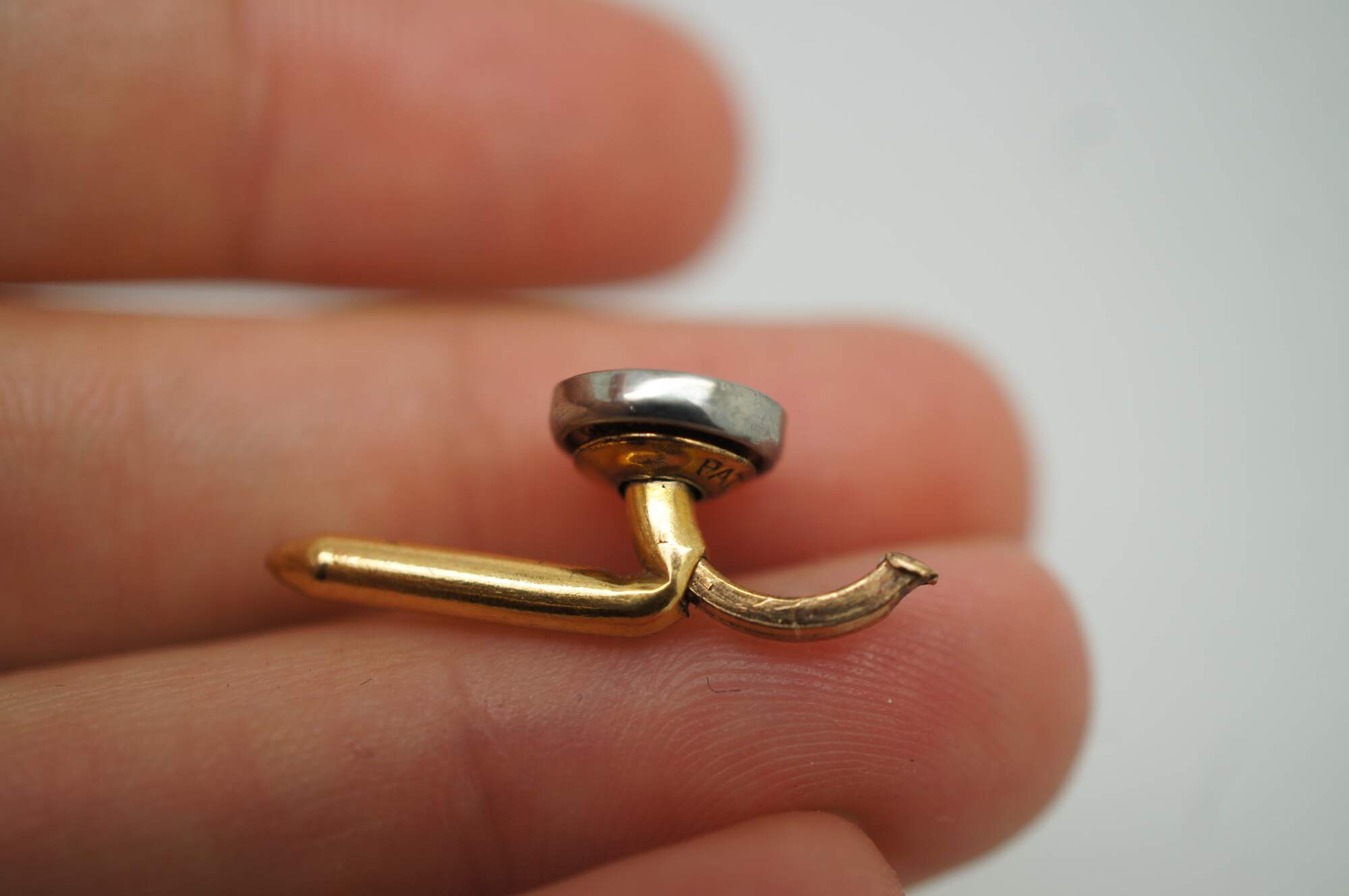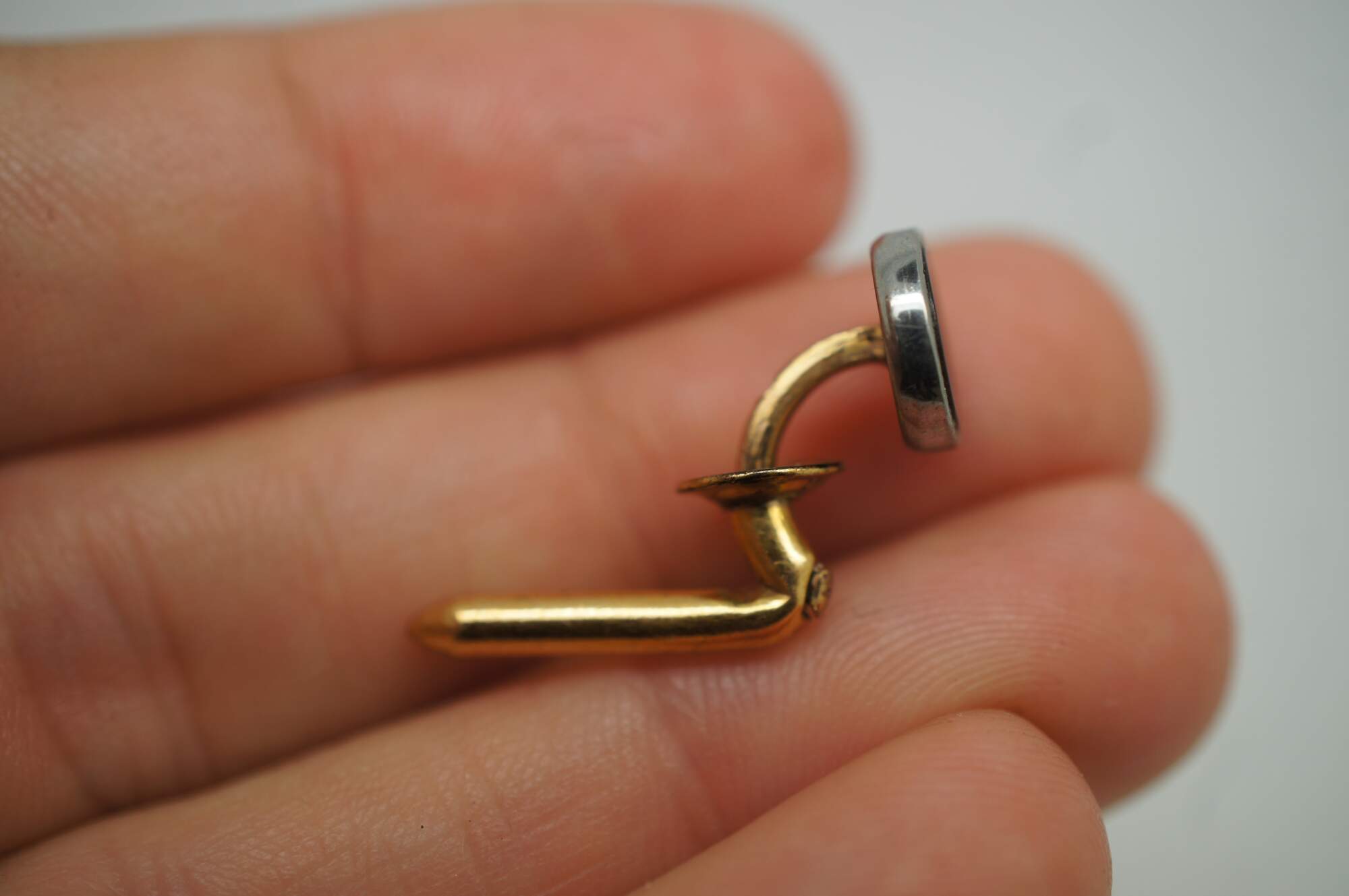 Lot of 6 antique 1920’s shirt studs in a Kum-a-part Slip in Studs box. Three are dome shaped white and brown stone accented with a gold nugget at the center. The other three feature mother of pearl discs framed in a silver tone frame etched with a geometric zig-zag. Patent Dec. 7, 1926. No matching cufflinks.