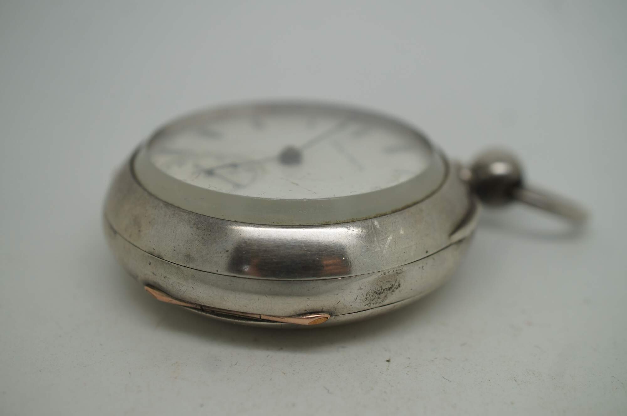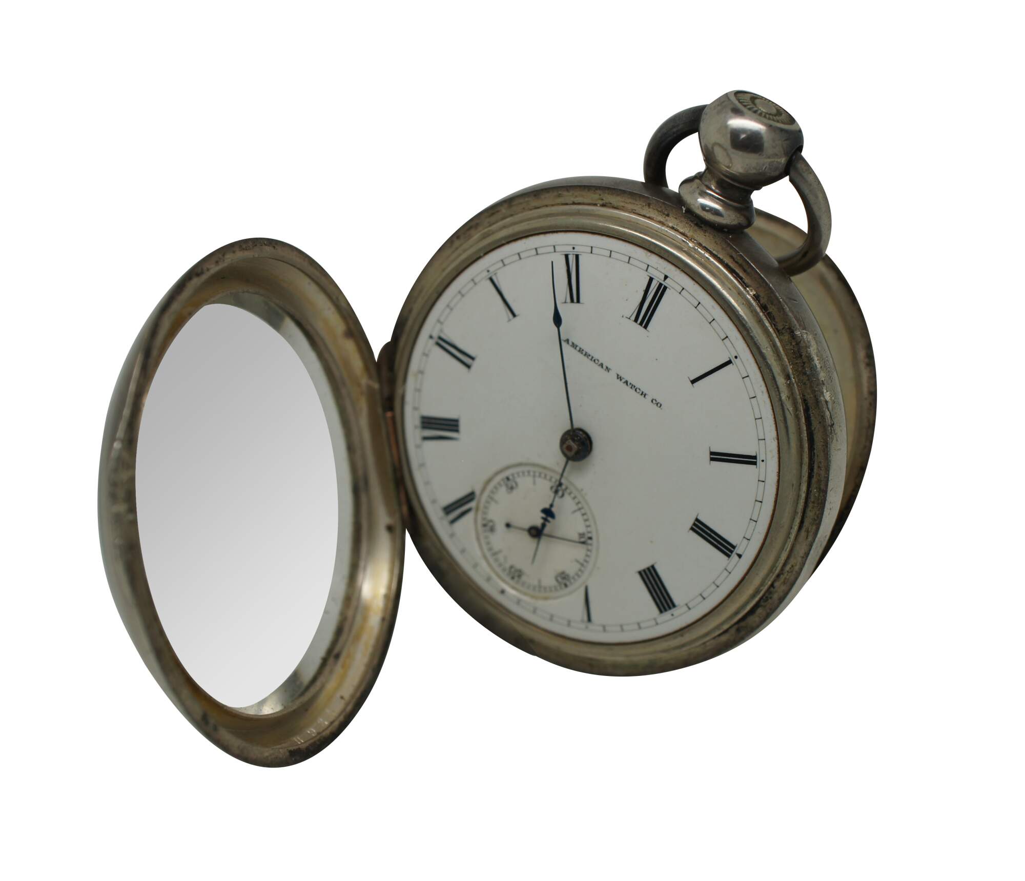 Antique late 1870’s American Watch Company key wound pocket watch. White porcelain face with black Roman numerals; second counting sub-dial with Arabic numerals. No key. Parts not tested.