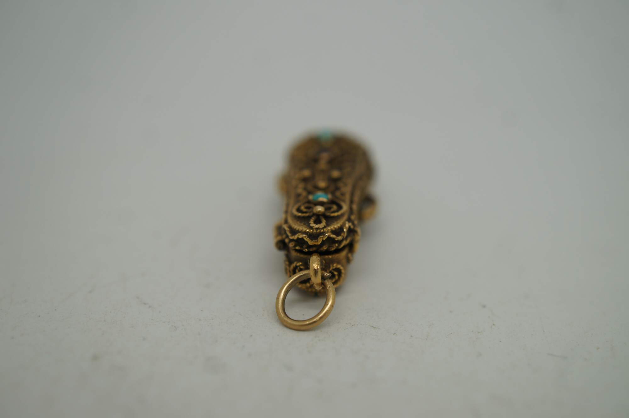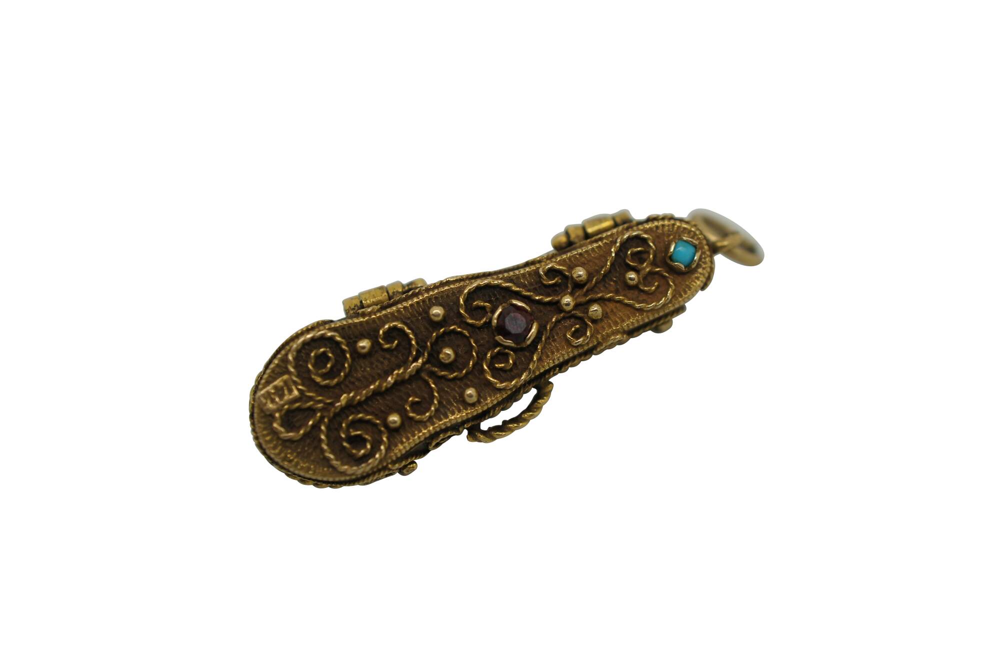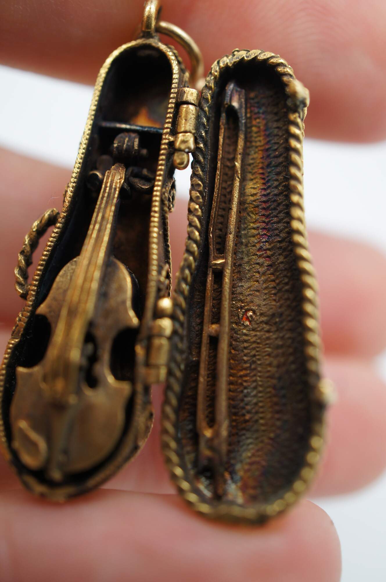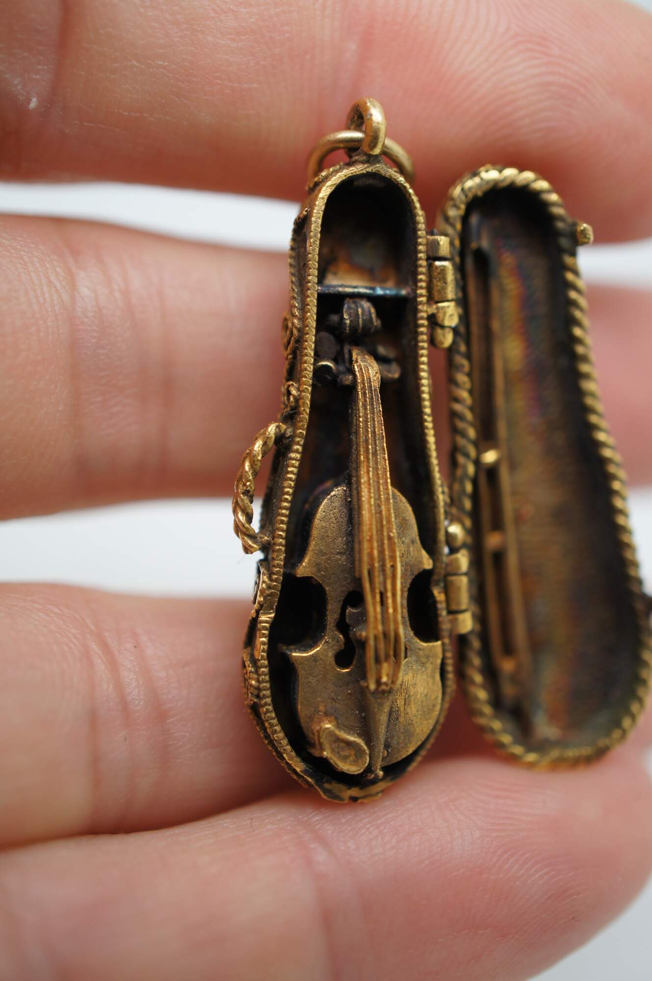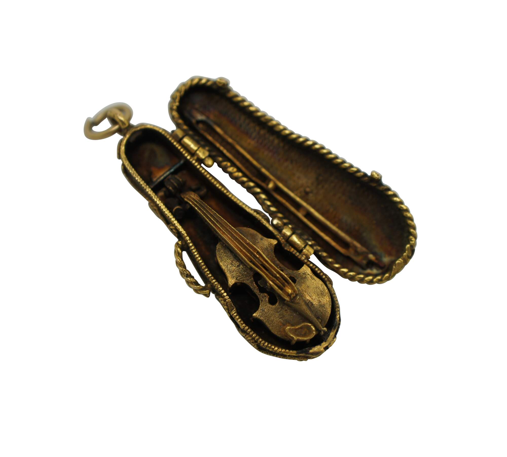 Vintage 14k yellow gold 3D articulating (opening) violin instrument with bow and filigree case.