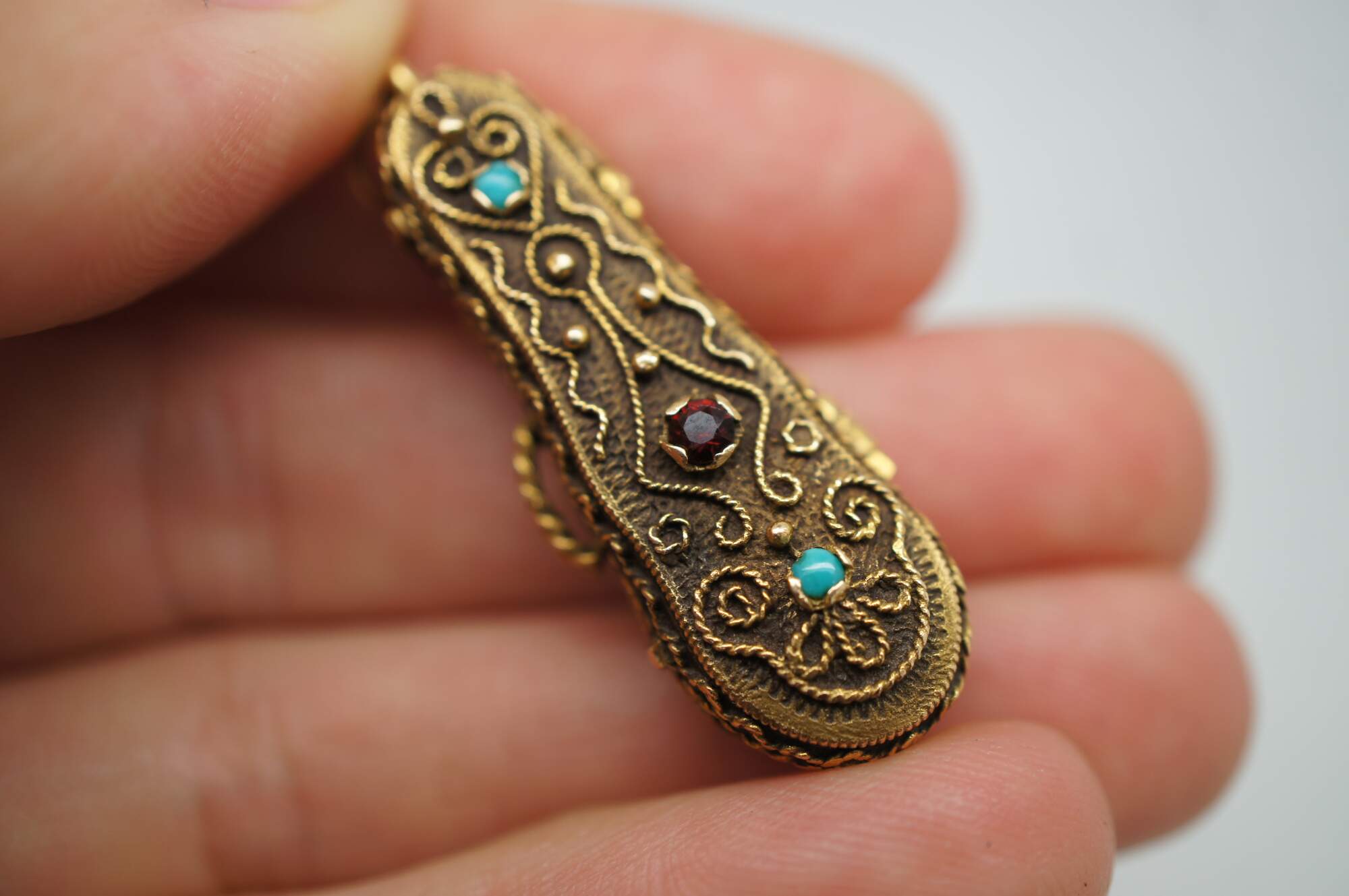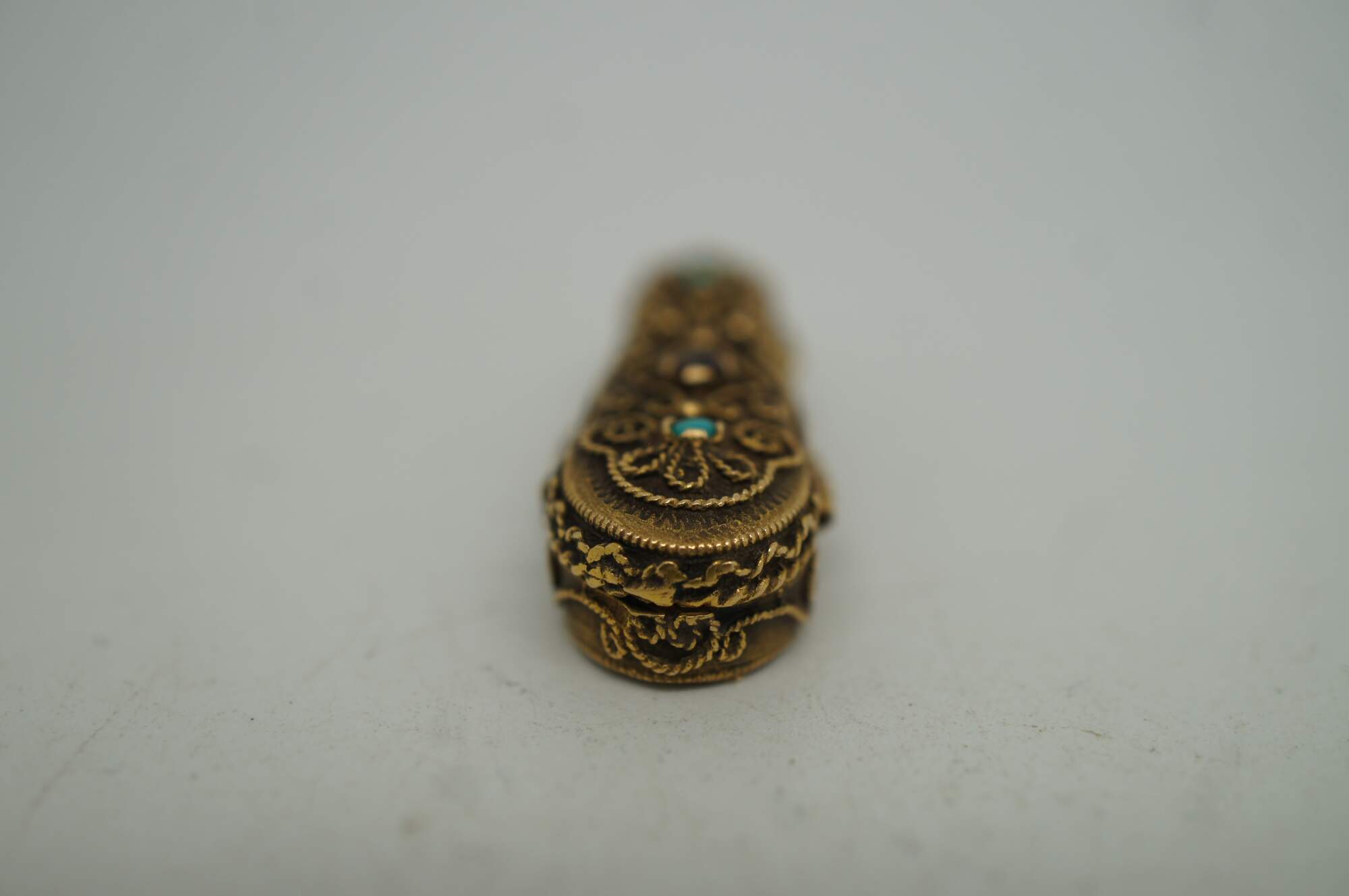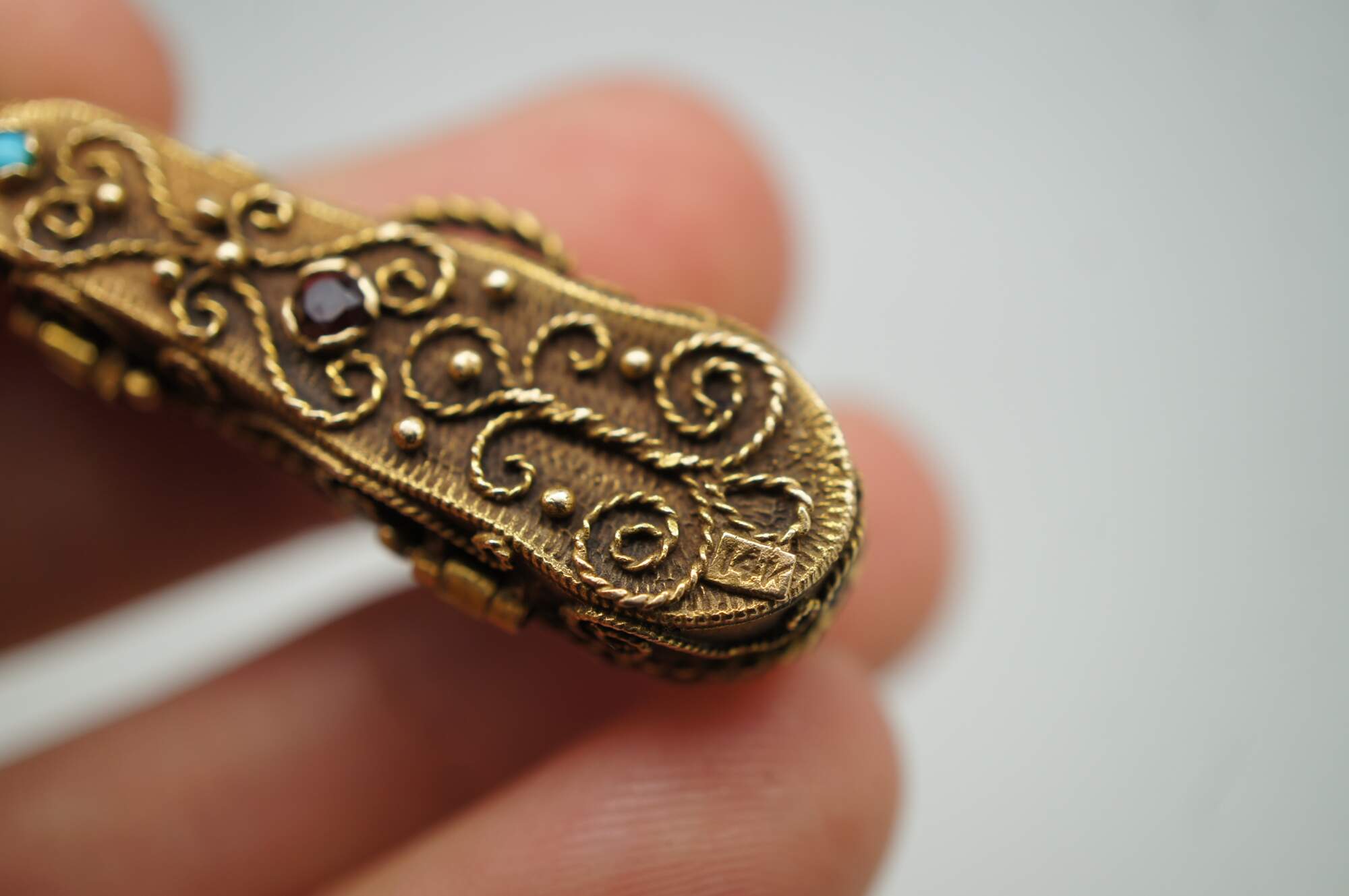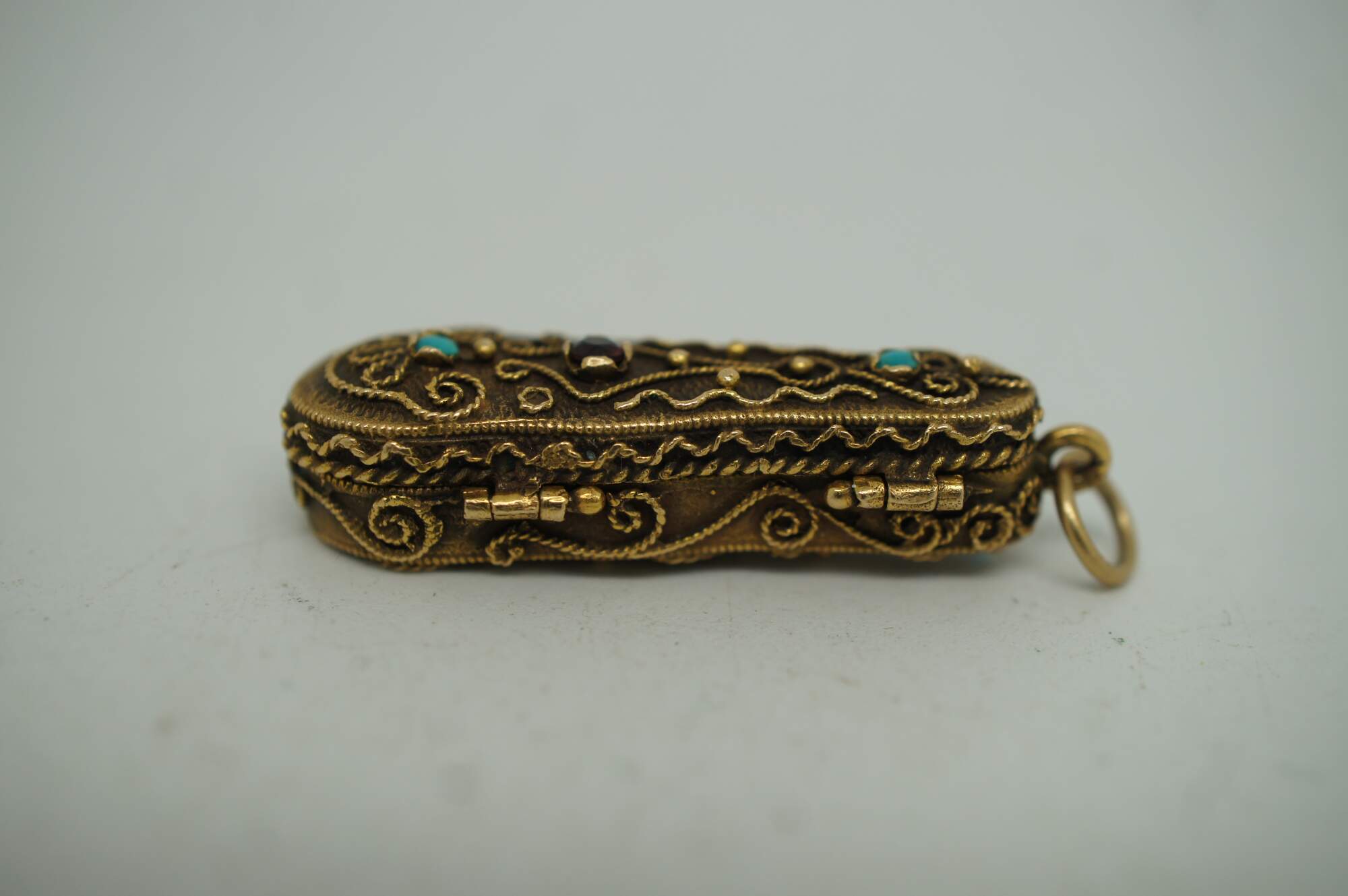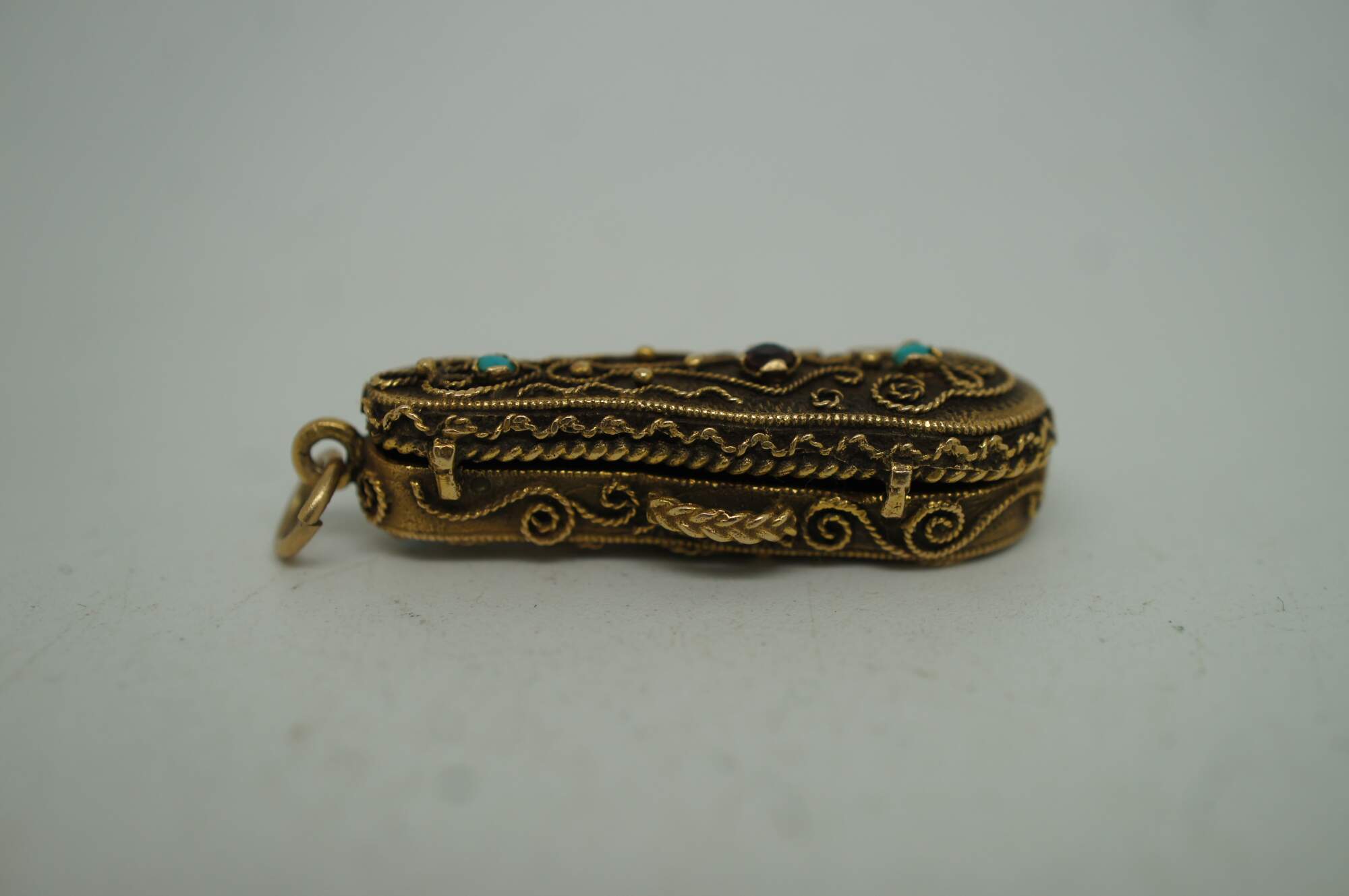 Vintage 14k yellow gold 3D articulating (opening) violin instrument with bow and filigree case.