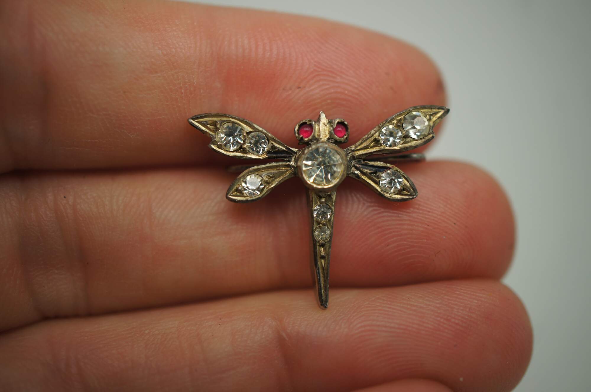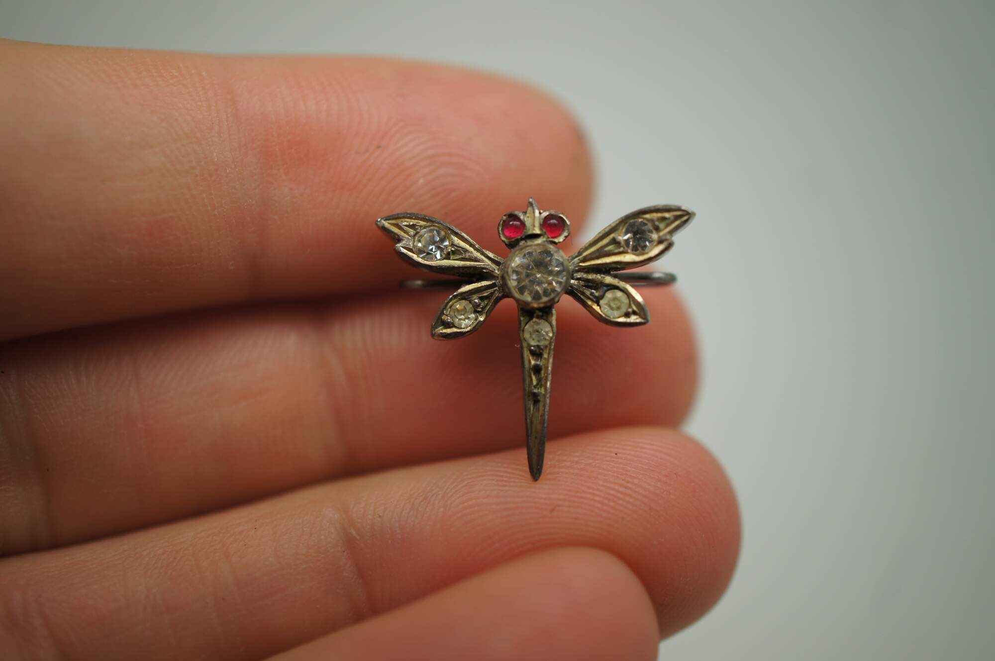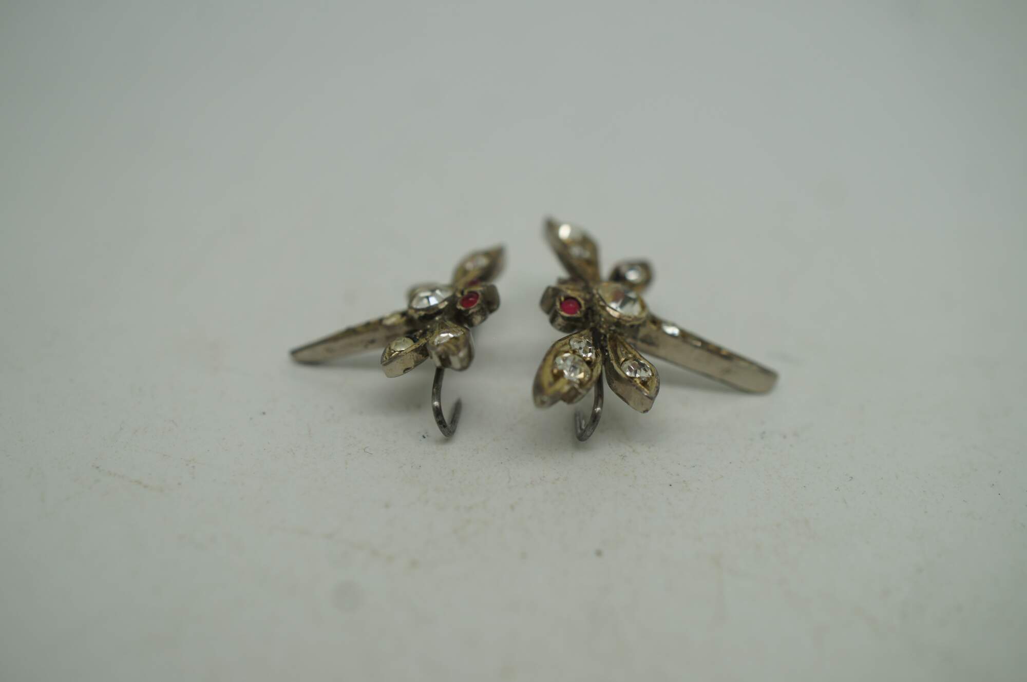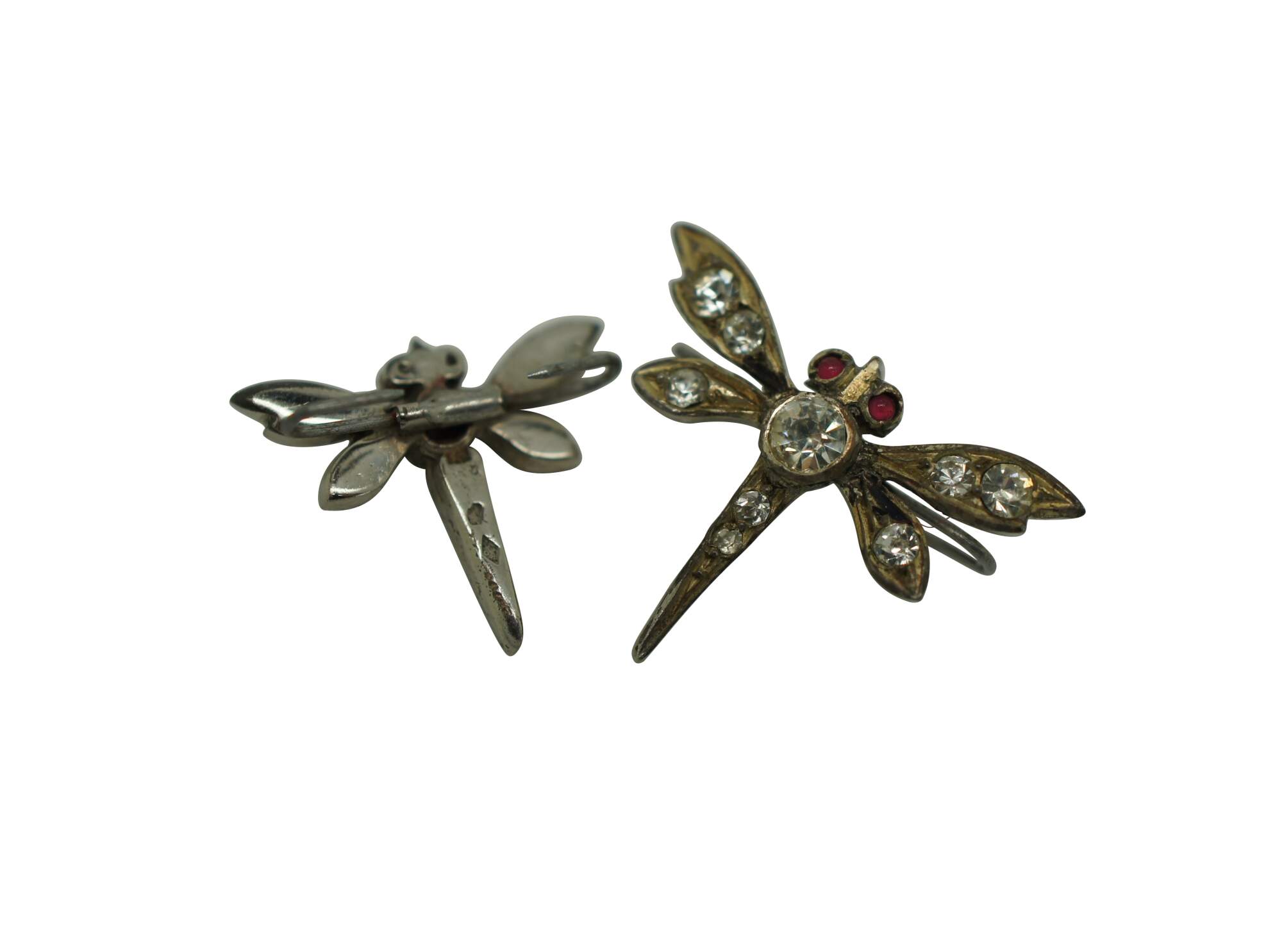 Two vintage lingerie clips featuring a dragonfly with faux ruby eyes and faux diamond studded body.