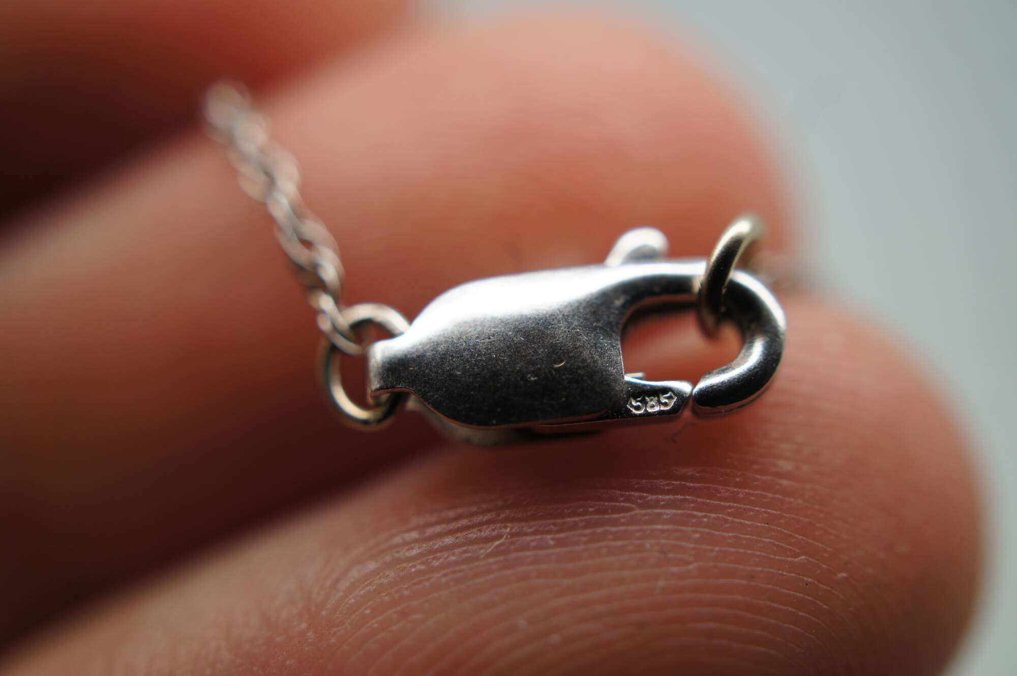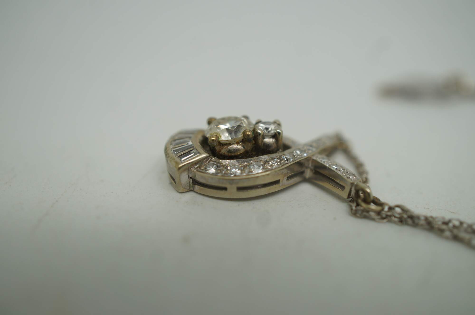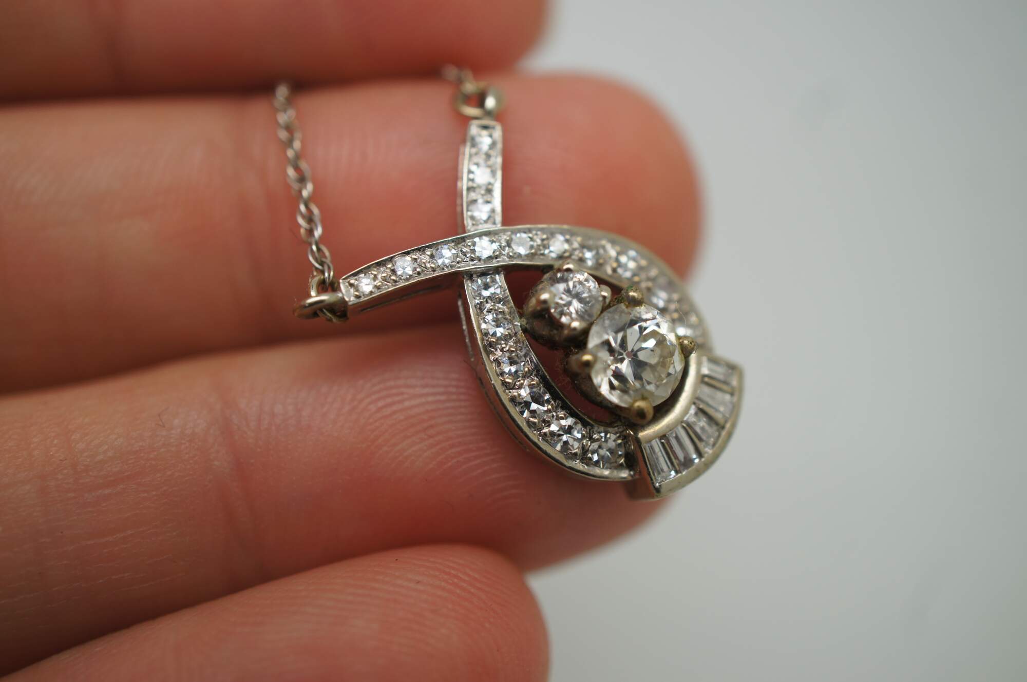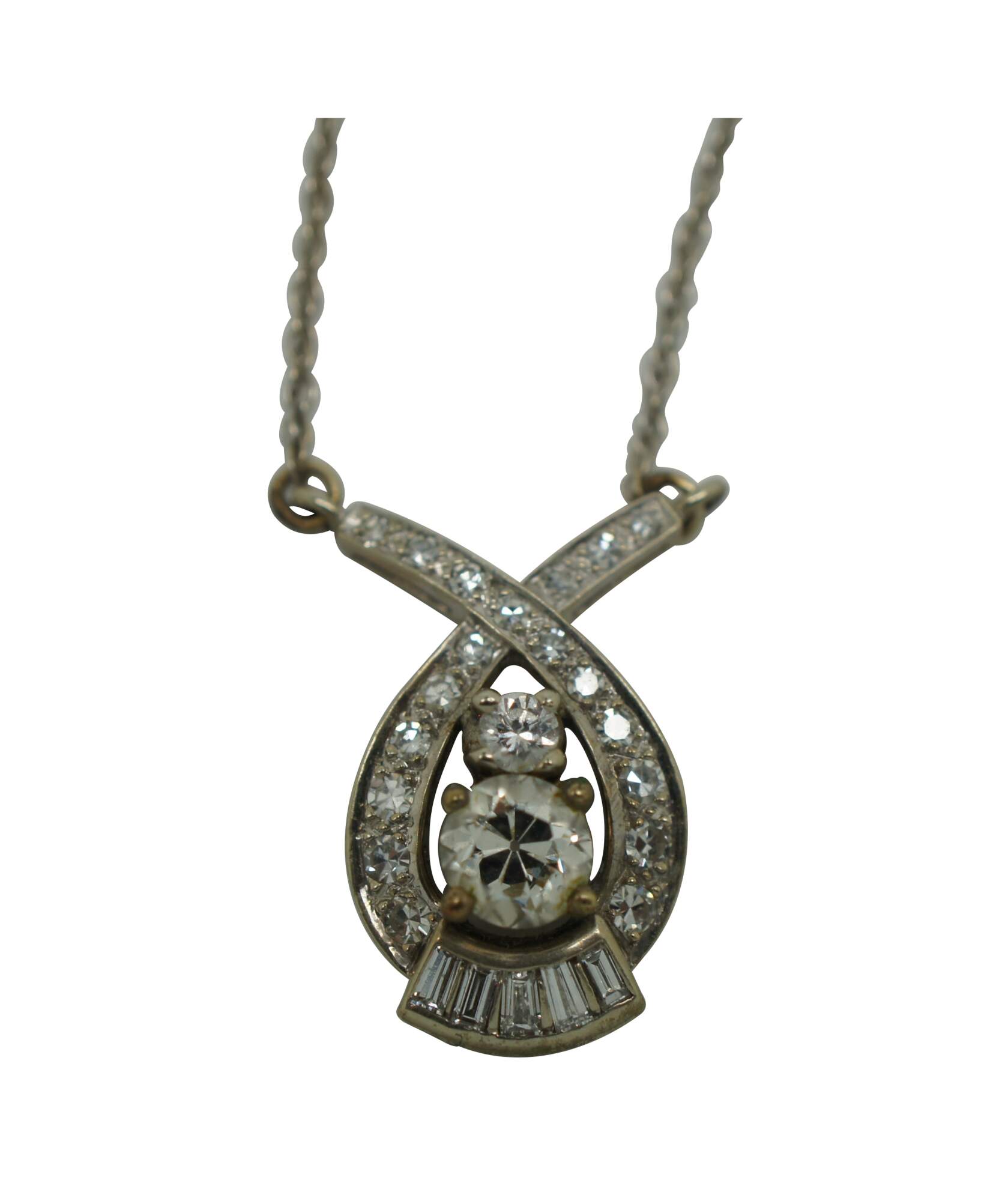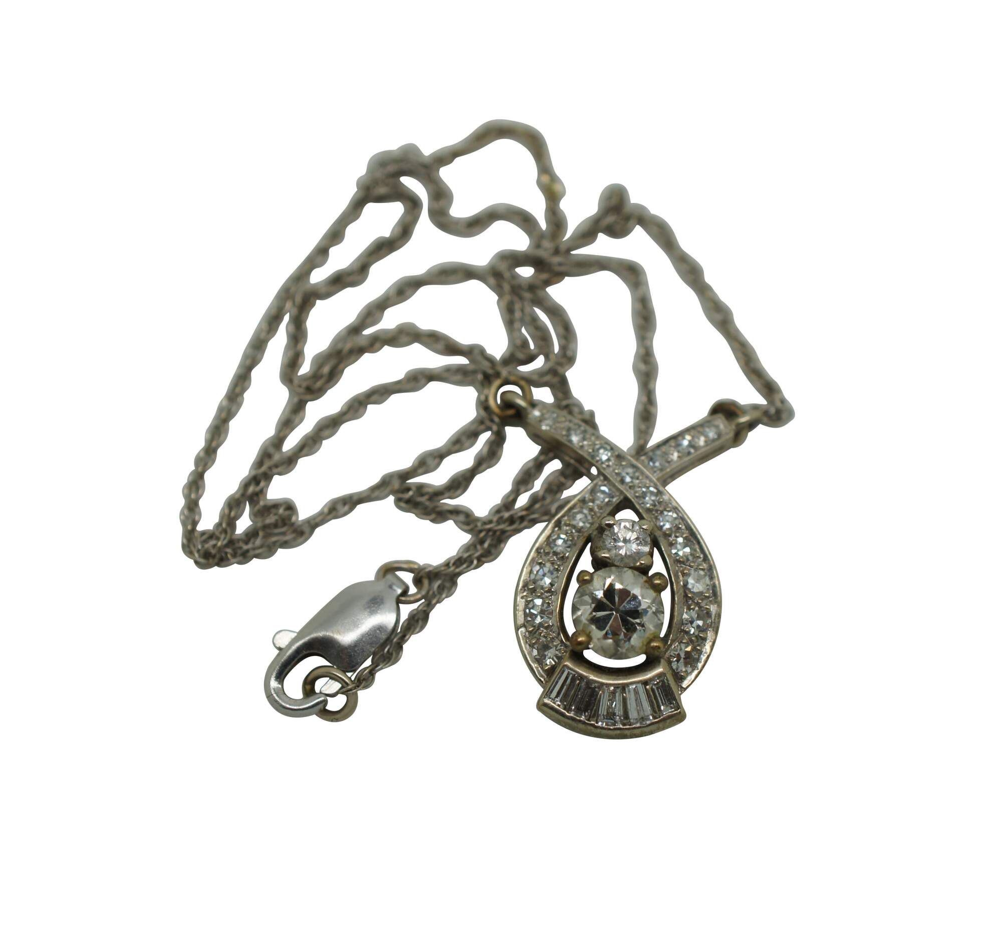 Vintage 14k white gold pendant necklace in the shape of a teardrop with crossed arms at the top, and a rectangular bow at the base, studded with 24 diamond chips with 2 larger stones stacked in the center. Hung on a delicate 2mm rope chain. Marked 585 on chain clasp. 2 largest diamonds – 4.8mm (approx 0.45 ct) and 2.7 mm (approx 0.08 ct).
