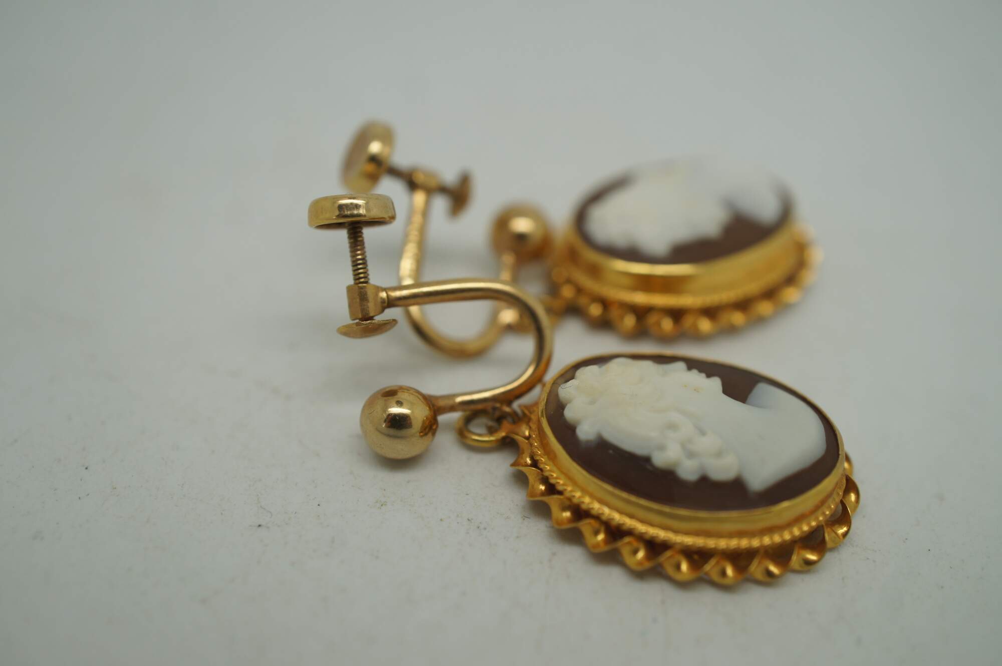 Vintage Art Nouveau style 10k yellow gold screw back earrings with dangling brown and white carved shell cameos in rope twist edges frames. Screw back marked BDA 10K.