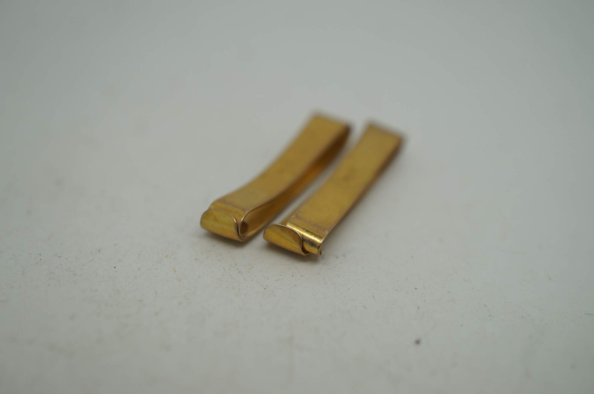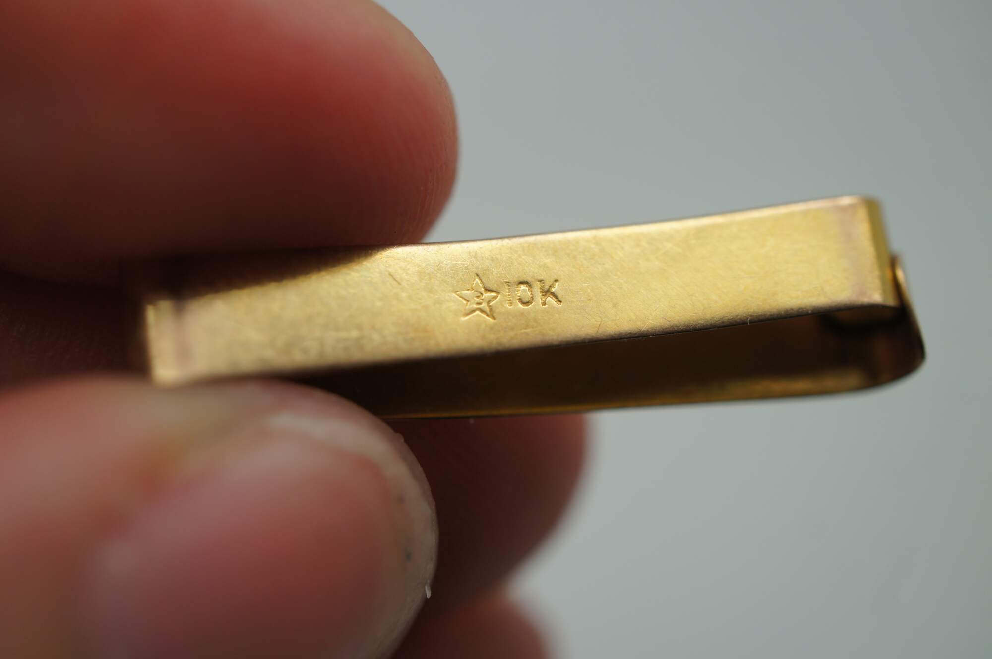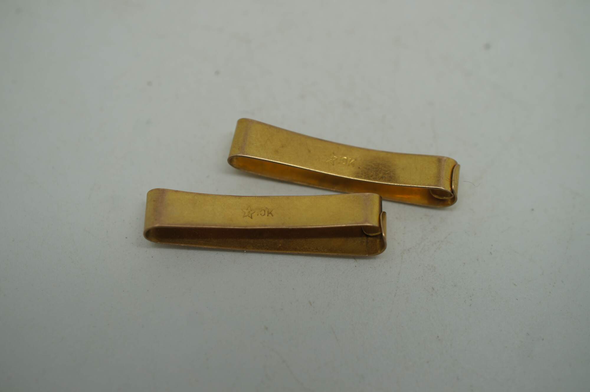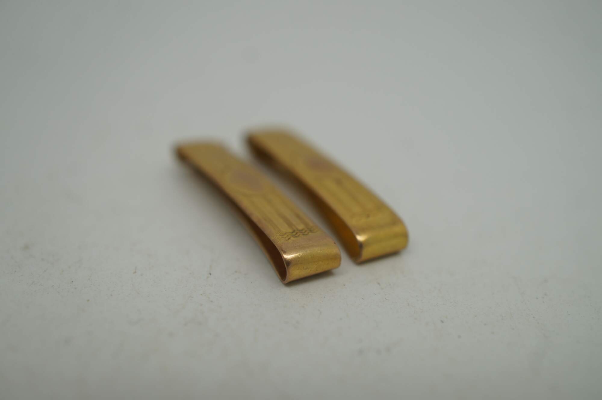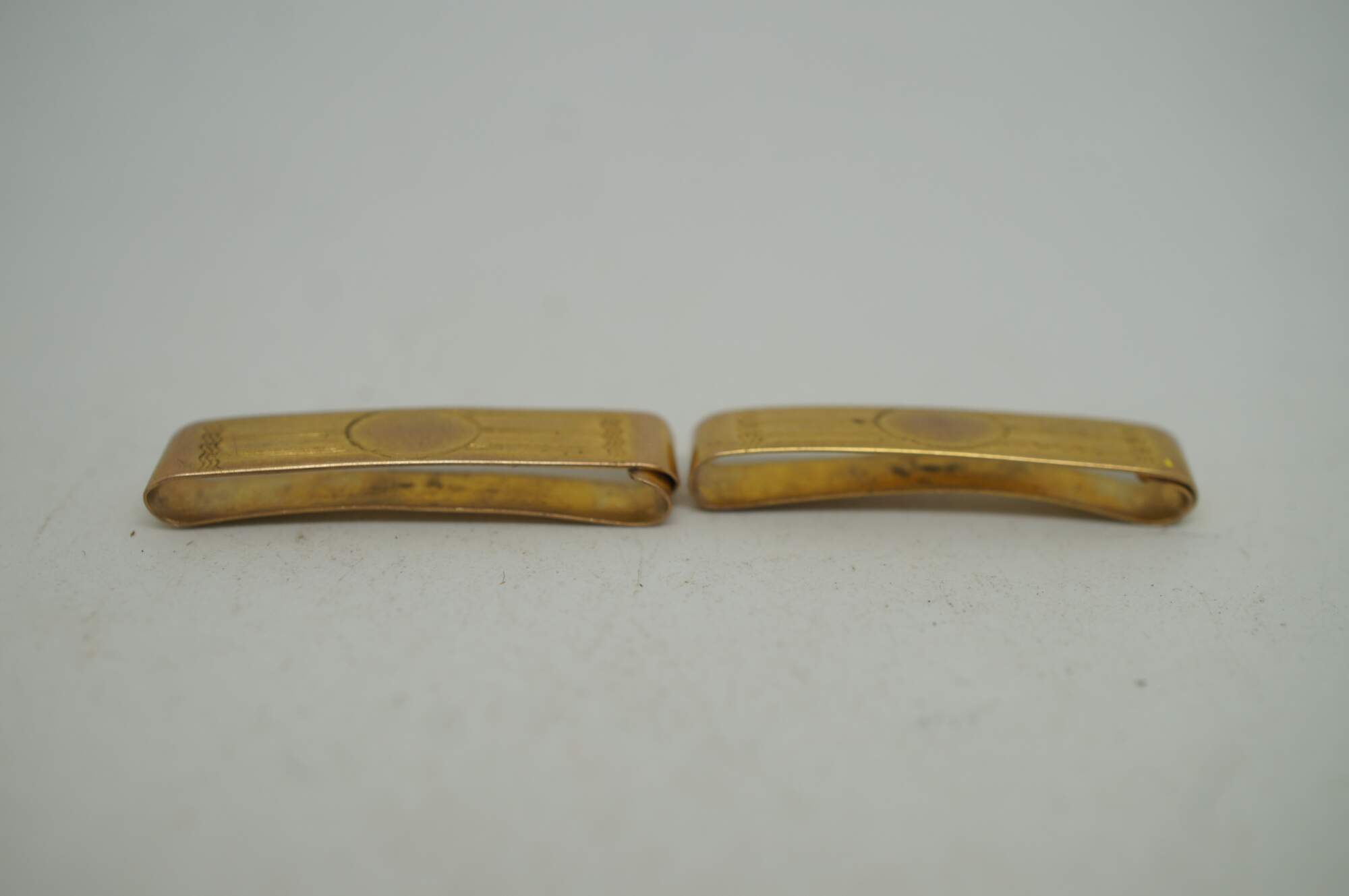 Pair of early 20th century Ballou & Co 10k yellow gold tie bar / clasps etched with a simple, classic motif of an oval backed with stripes and waving lines.