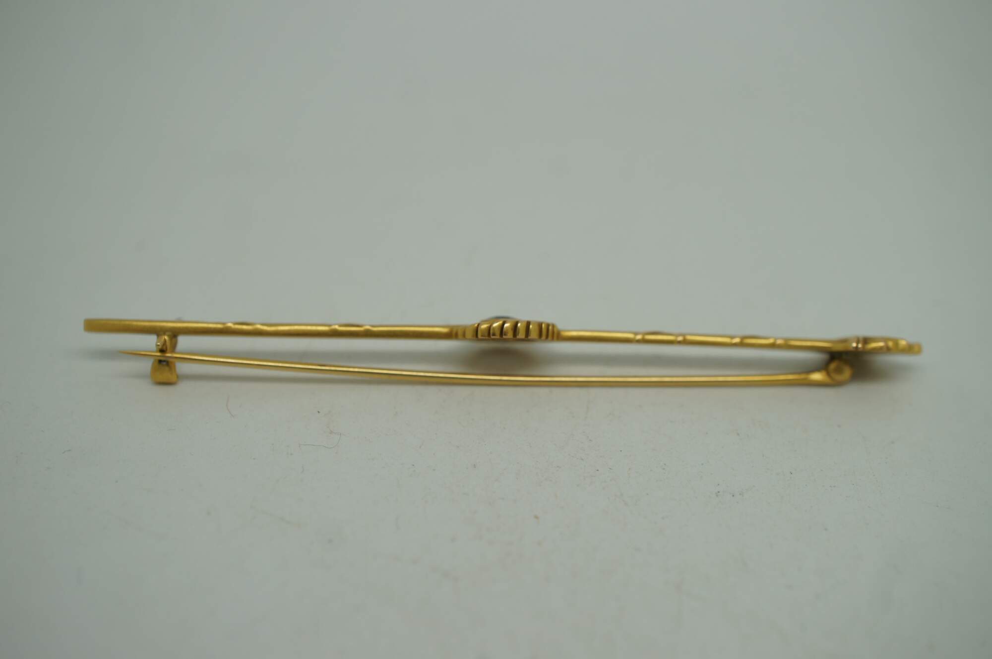 Antique art deco 14K yellow gold pin / brooch by Roger Jones Manufacturing Co, in the shape of a long neoclassical torch (torchiere) with a laurel wreath at the center framing a round cut blue sapphire.