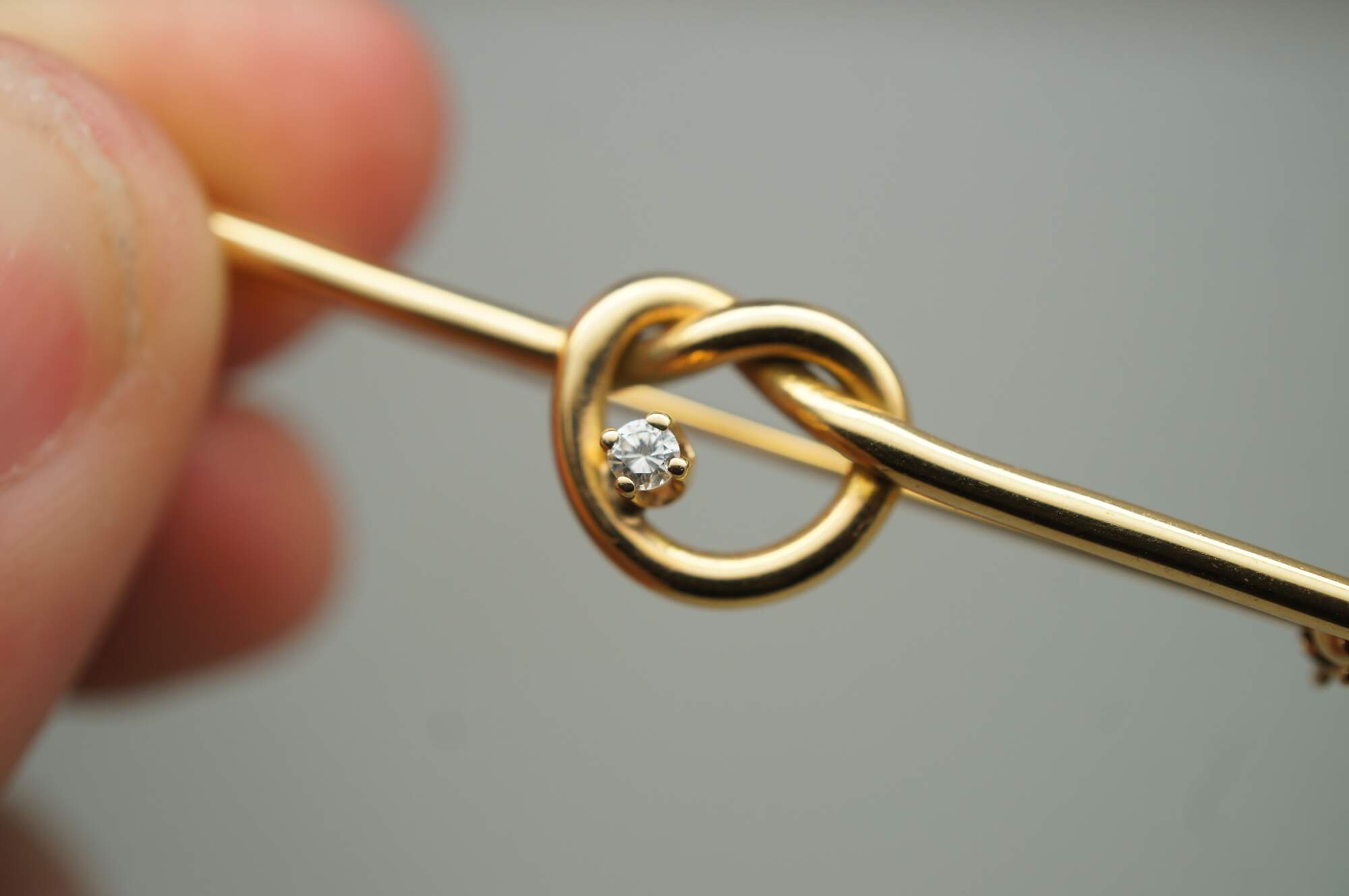Vintage 14k yellow gold bar pin / brooch with a pretzel shape twist / knot at the center accented with a diamond. Straight pin back.