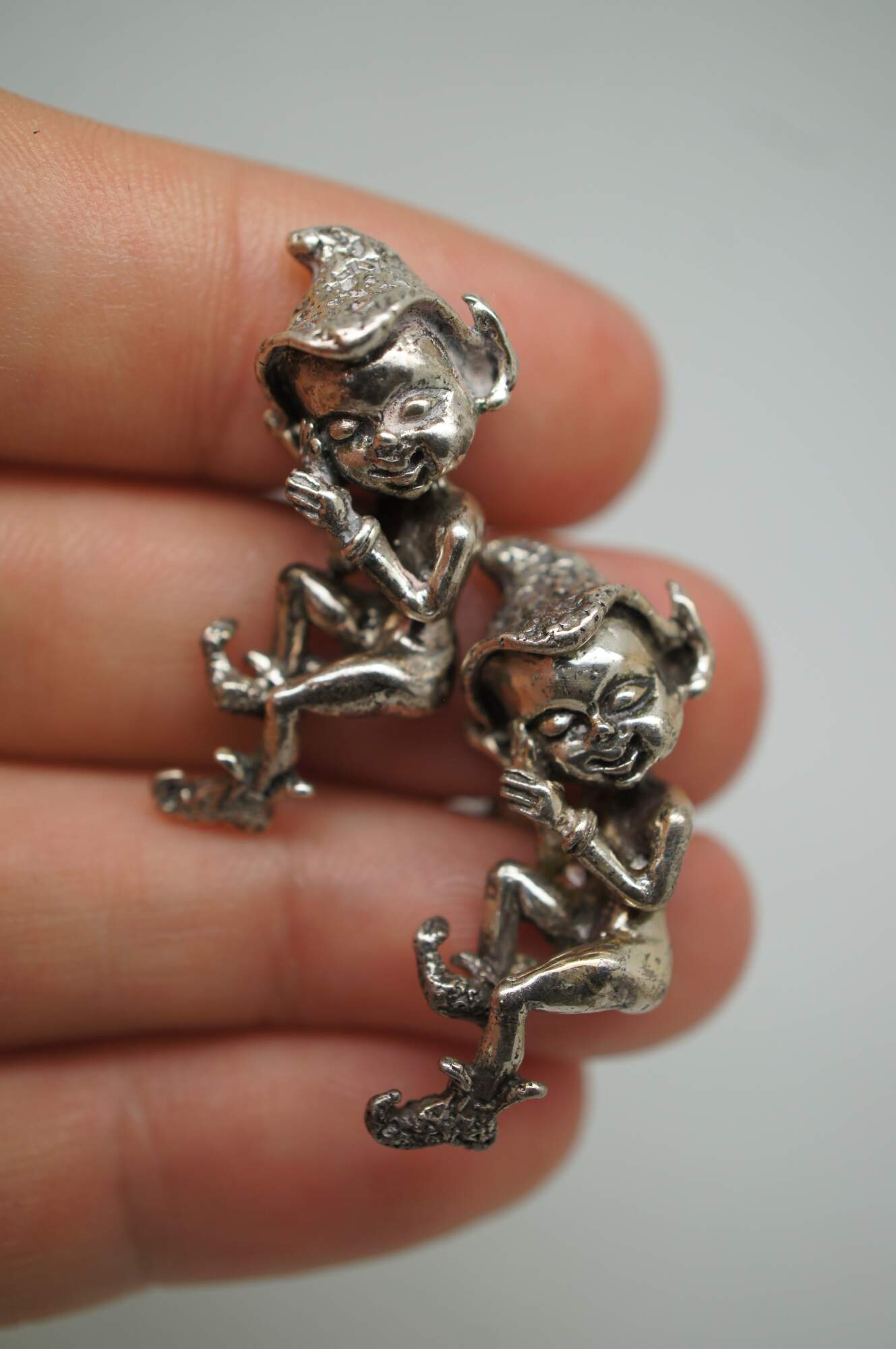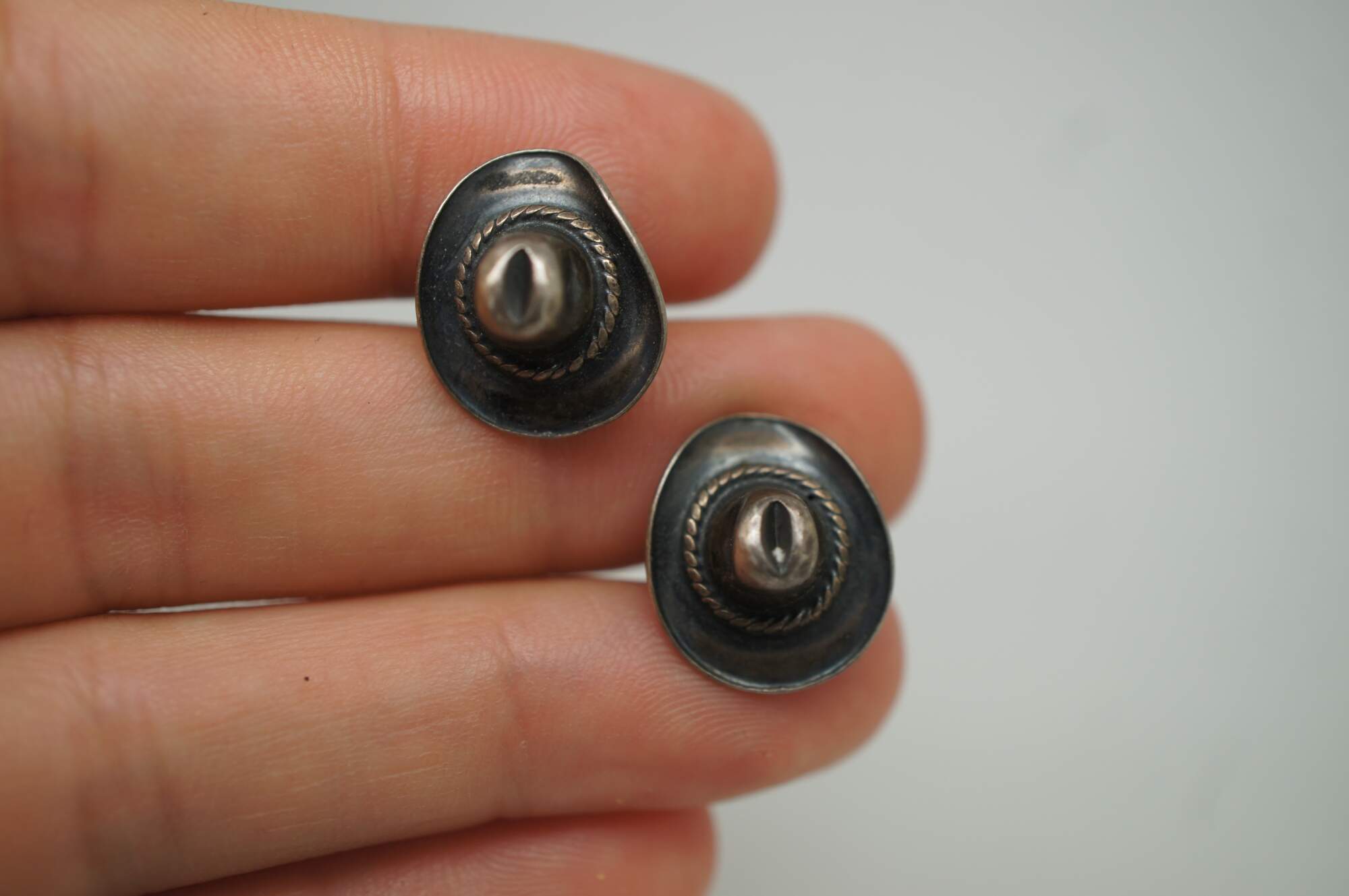 Lot of 5 pairs of vintage sterling silver cufflinks, primarily featuring Southwest or Mexican styling. Lot includes: smiling suns by Hogan Bolas; diamonds inlaid with turquoise / enamel; roadrunners with inlaid turquoise / enamel; cowboy / Stetson hats; and elves / sprites.