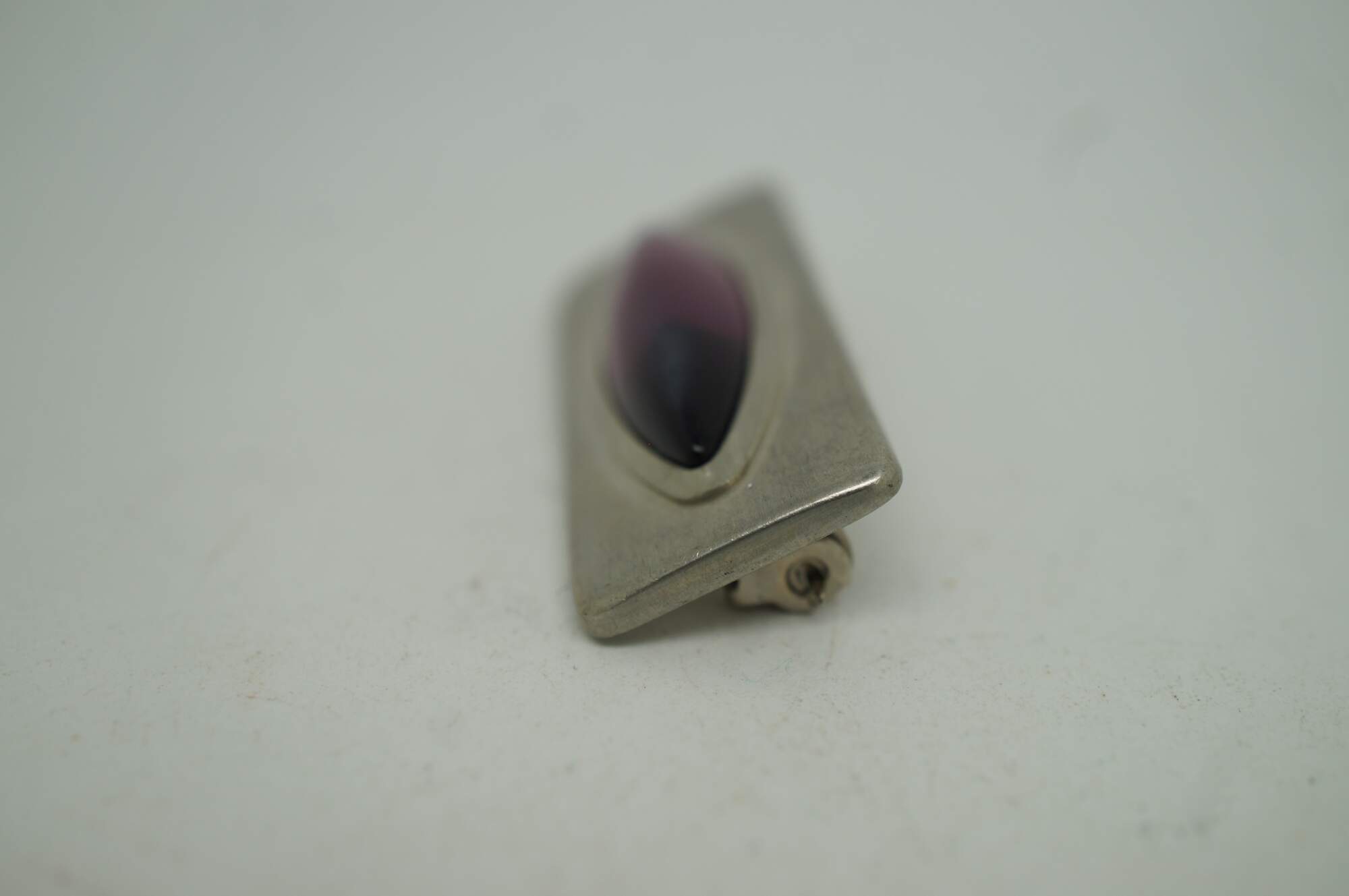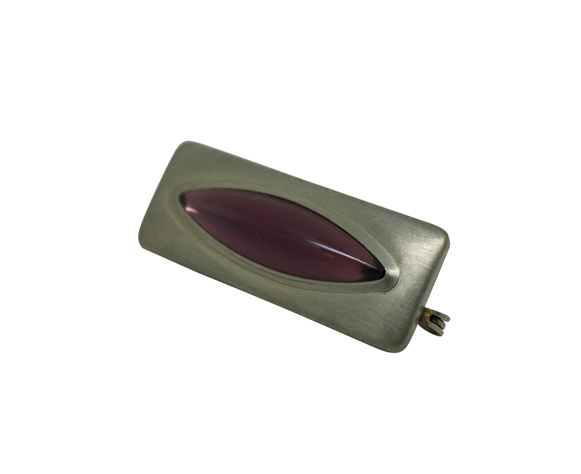 Mid Century Danish pewter pin / brooch – rounded rectangle shape with almond shaped purple cabochon rhinestone. Straight pin back. Marked Jorgen Jensen Denmark 230.