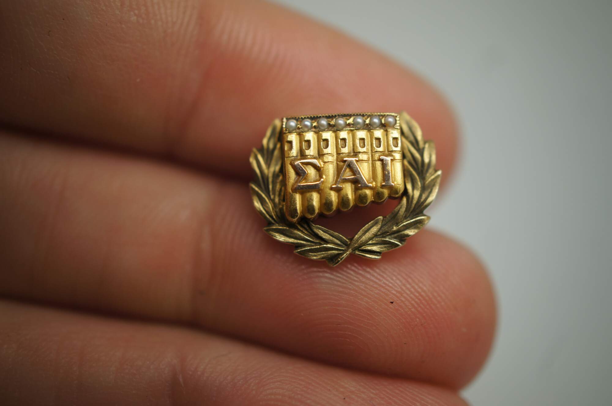 Vintage 1960’s 10k gold Patroness Badge / lapel pin for Sigma Alpha Iota, an International Music Fraternity. Patroness Membership is for women who support the arts in the community, and have been invited by a college or alumnae chapter to join SAI. Engraved “P.Williams ΑΣ 11-7-65.” Makers mark shows a B in a shield topped by a Greek temple. Features a wreath with pan flute / panpipes / syrinx and seed pearls.