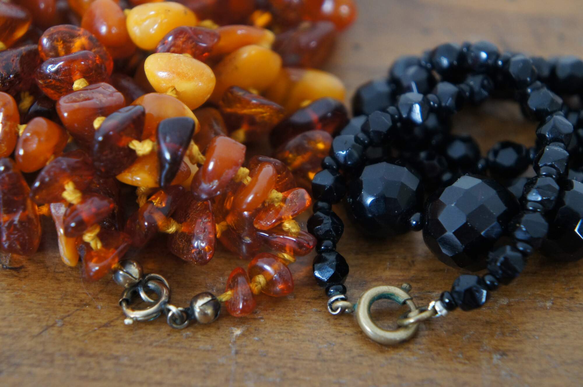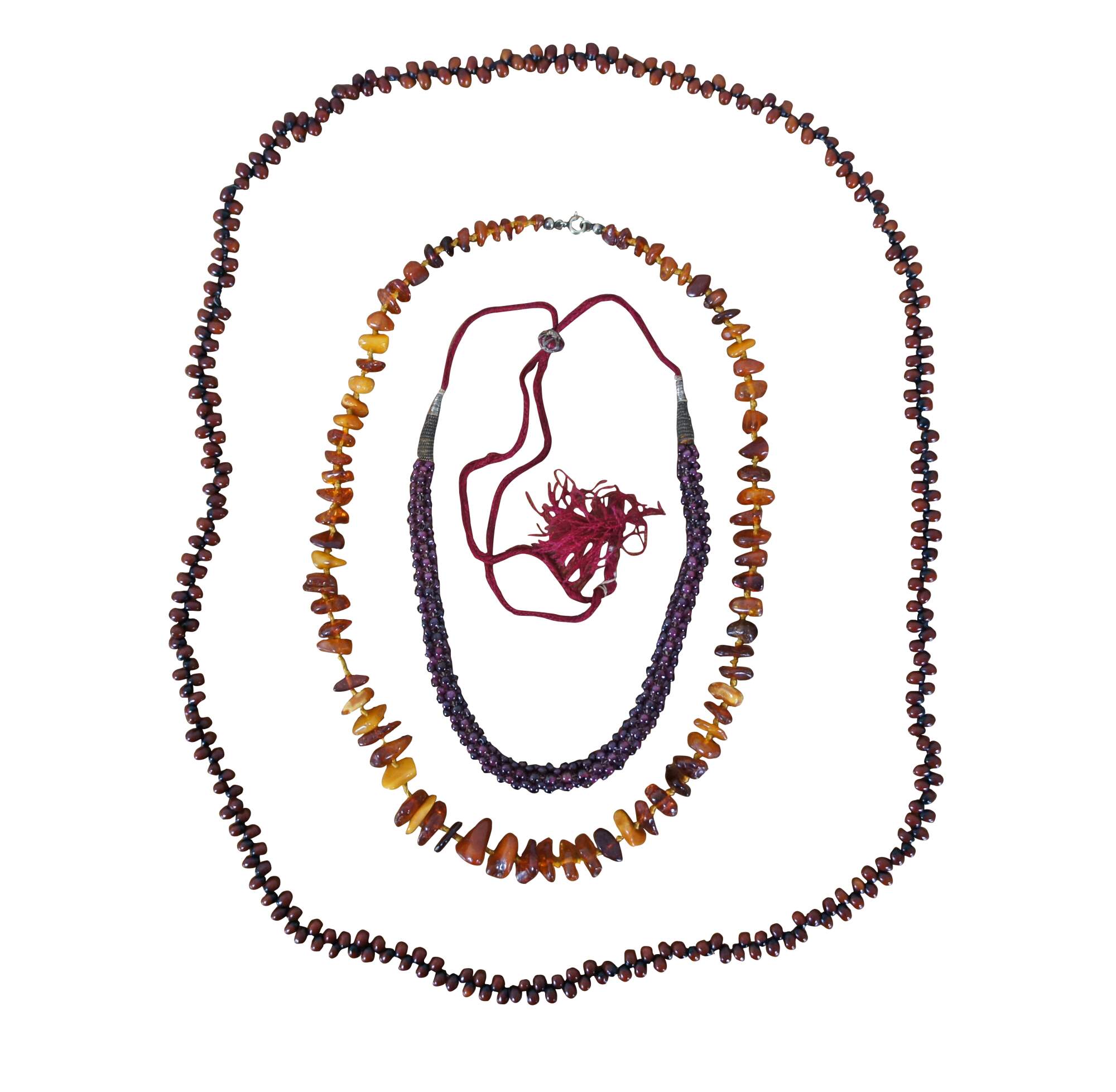 Lot of 6 vintage beaded necklaces including 2 turquoise colored stone nuggets on leather cord; one graduated, faceted, black plastic beads with spring ring clasp; butterscotch and amber faux stone beads on knotted yellow cord with spring ring clasp; purple seed bead rope with brass caps and adjustable red cord; and a single strand of brown and black seed shaped beads.