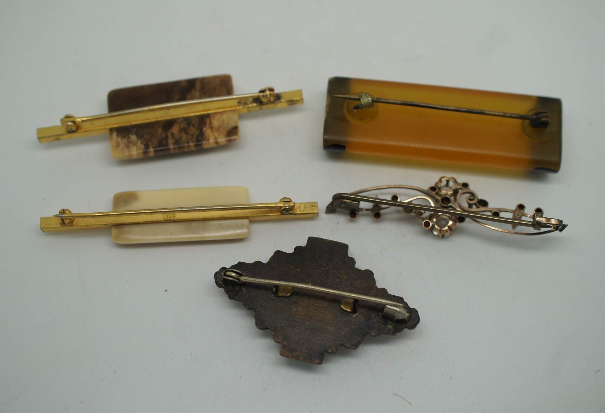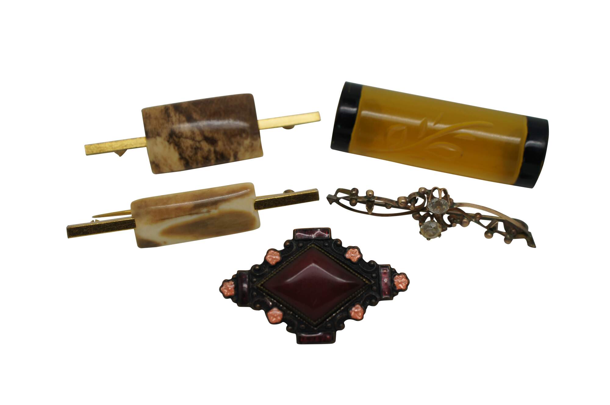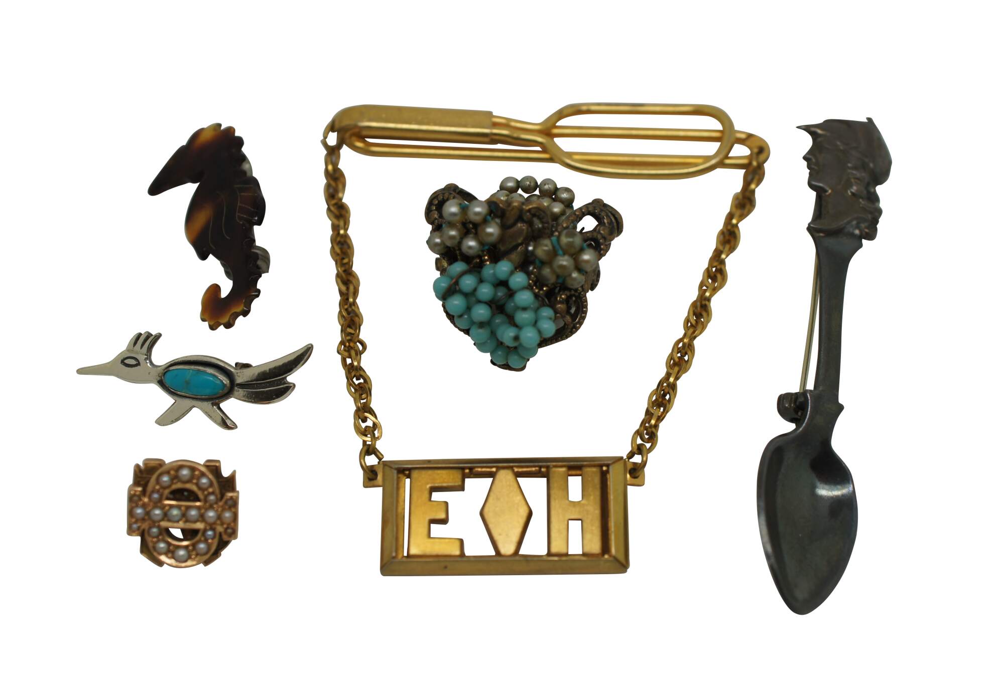 Lot of 11 vintage brooches, lapel pins and tie bar in a variety of styles. Lot includes: 2 gold tone bar pins with rectangular stone / agate; translucent yellow Bakelite/plastic pin carved with a leafy vine and black painted ends; swirling studded brass pin with two white rhinestones; Art Deco diamond shape pin with oxblood red carnelian glass; Swank gold tone tie bar with suspended initials EH; sterling silver miniature spoon pin topped with the head of Athena; carved tortoiseshell pattern plastic seahorse; cluster pin beaded with turquoise and pearl seed beads; sterling silver roadrunner with inlaid turquoise stone; and a gold tone Omega Iota lapel pin studded with seed pearls and initials NHW on back.
