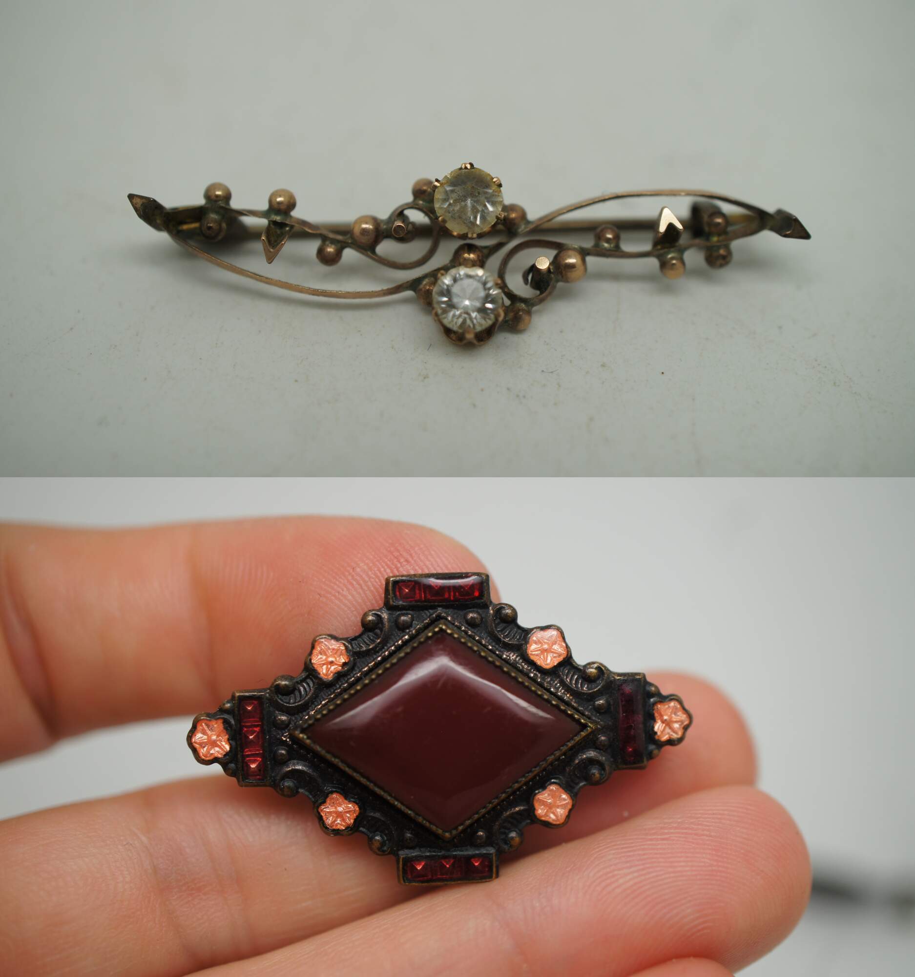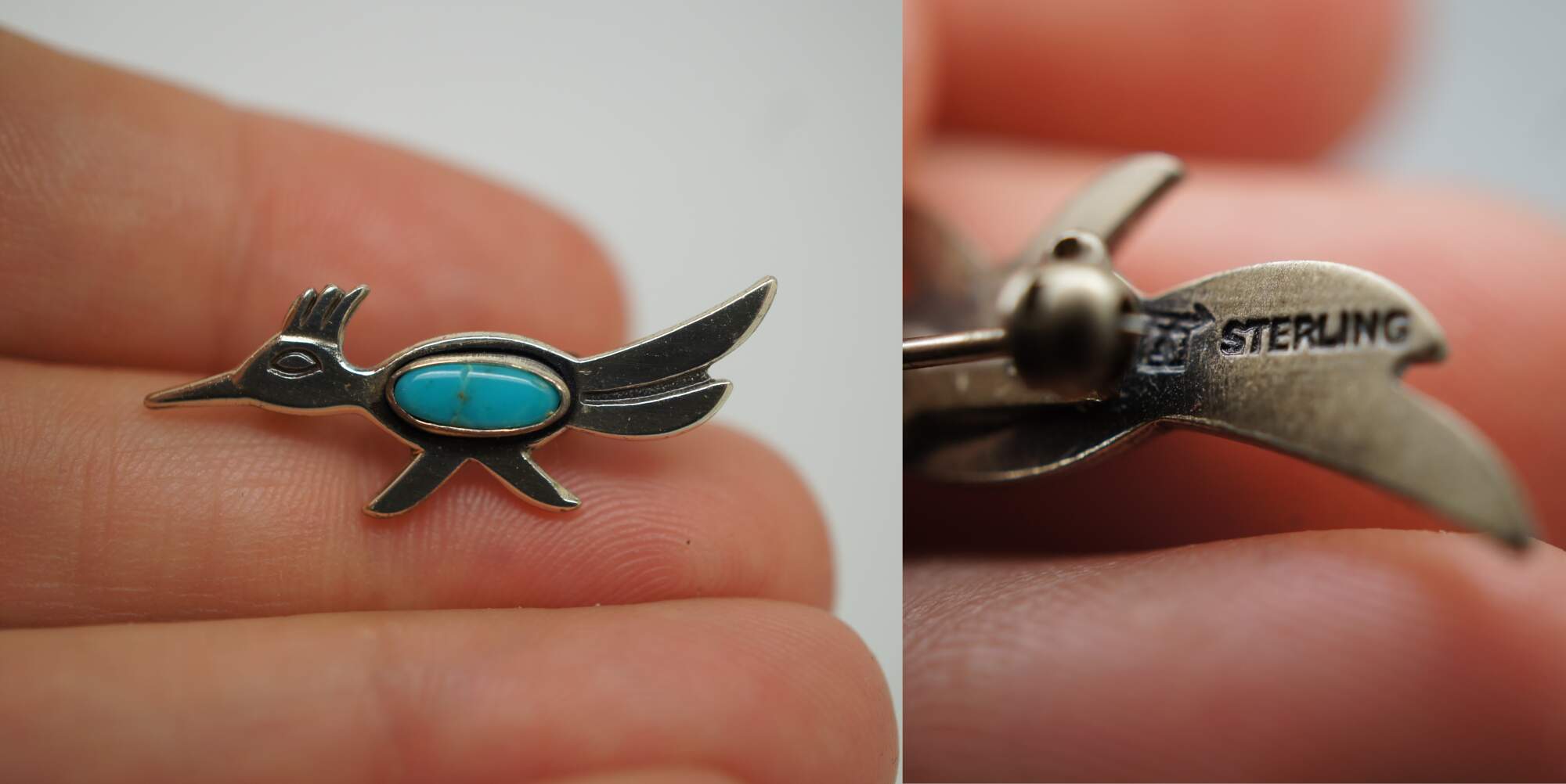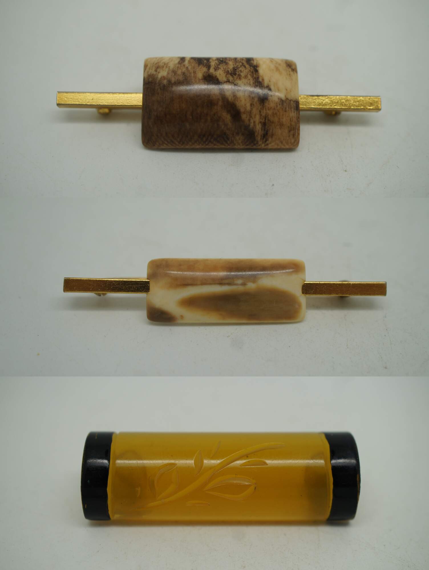Lot of 11 vintage brooches, lapel pins and tie bar in a variety of styles. Lot includes: 2 gold tone bar pins with rectangular stone / agate; translucent yellow Bakelite/plastic pin carved with a leafy vine and black painted ends; swirling studded brass pin with two white rhinestones; Art Deco diamond shape pin with oxblood red carnelian glass; Swank gold tone tie bar with suspended initials EH; sterling silver miniature spoon pin topped with the head of Athena; carved tortoiseshell pattern plastic seahorse; cluster pin beaded with turquoise and pearl seed beads; sterling silver roadrunner with inlaid turquoise stone; and a gold tone Omega Iota lapel pin studded with seed pearls and initials NHW on back.