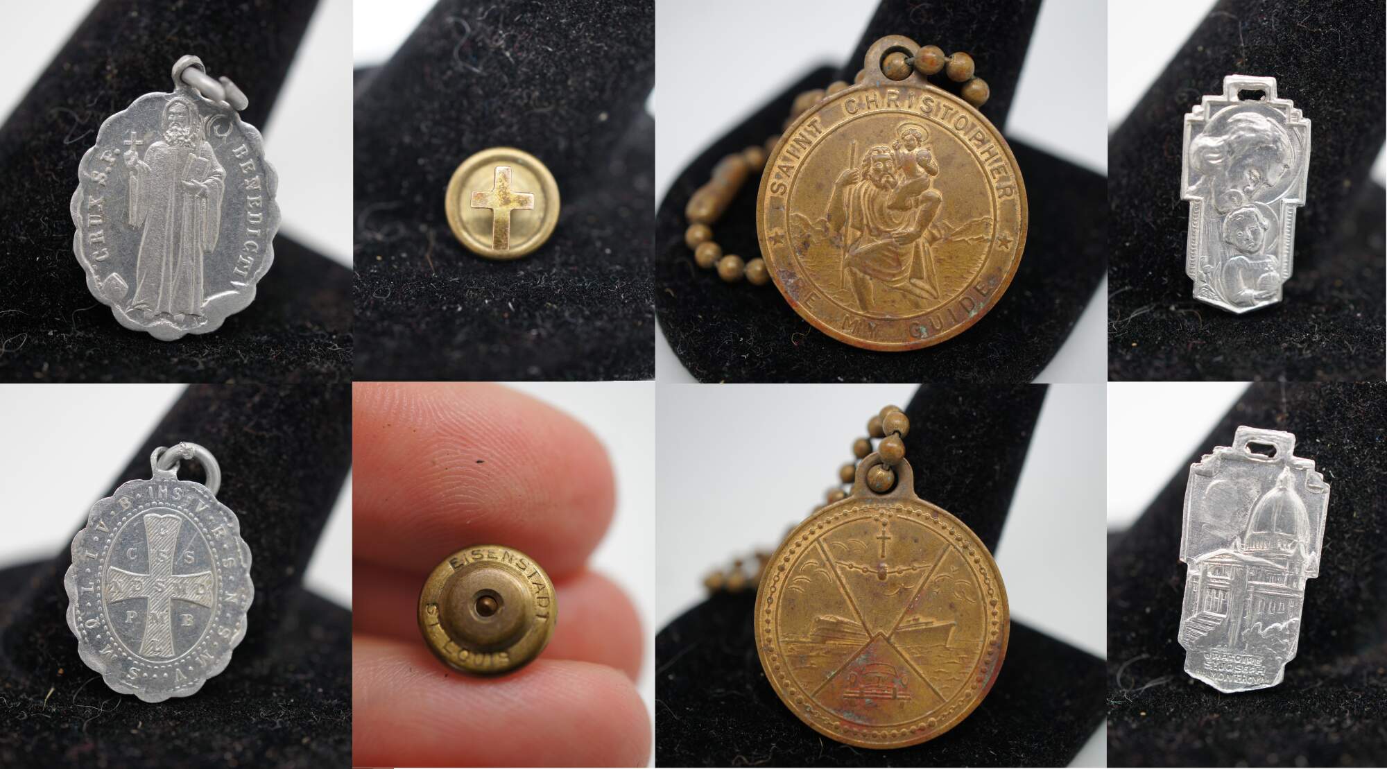 Assorted lot of 29 vintage and antique Christian / Catholic saint medals – including St Benedict, St Christopher, St Joseph, St Anthony, St Jude, The Infant of Prague, St Gerard, and several manifestations of the Virgin Mary / Miraculous Medals - pins, and pendants representing generic Christian motifs and specific churches / church organizations.