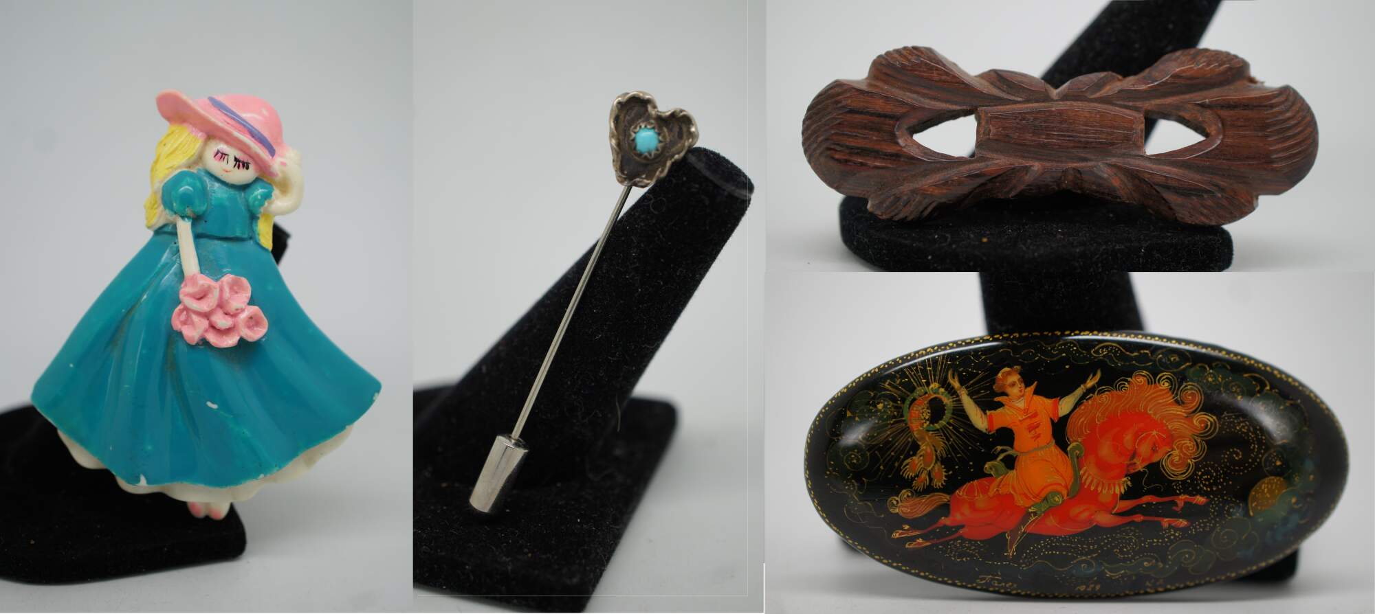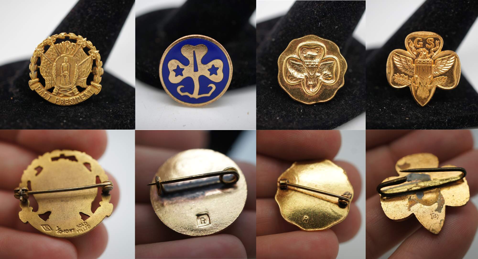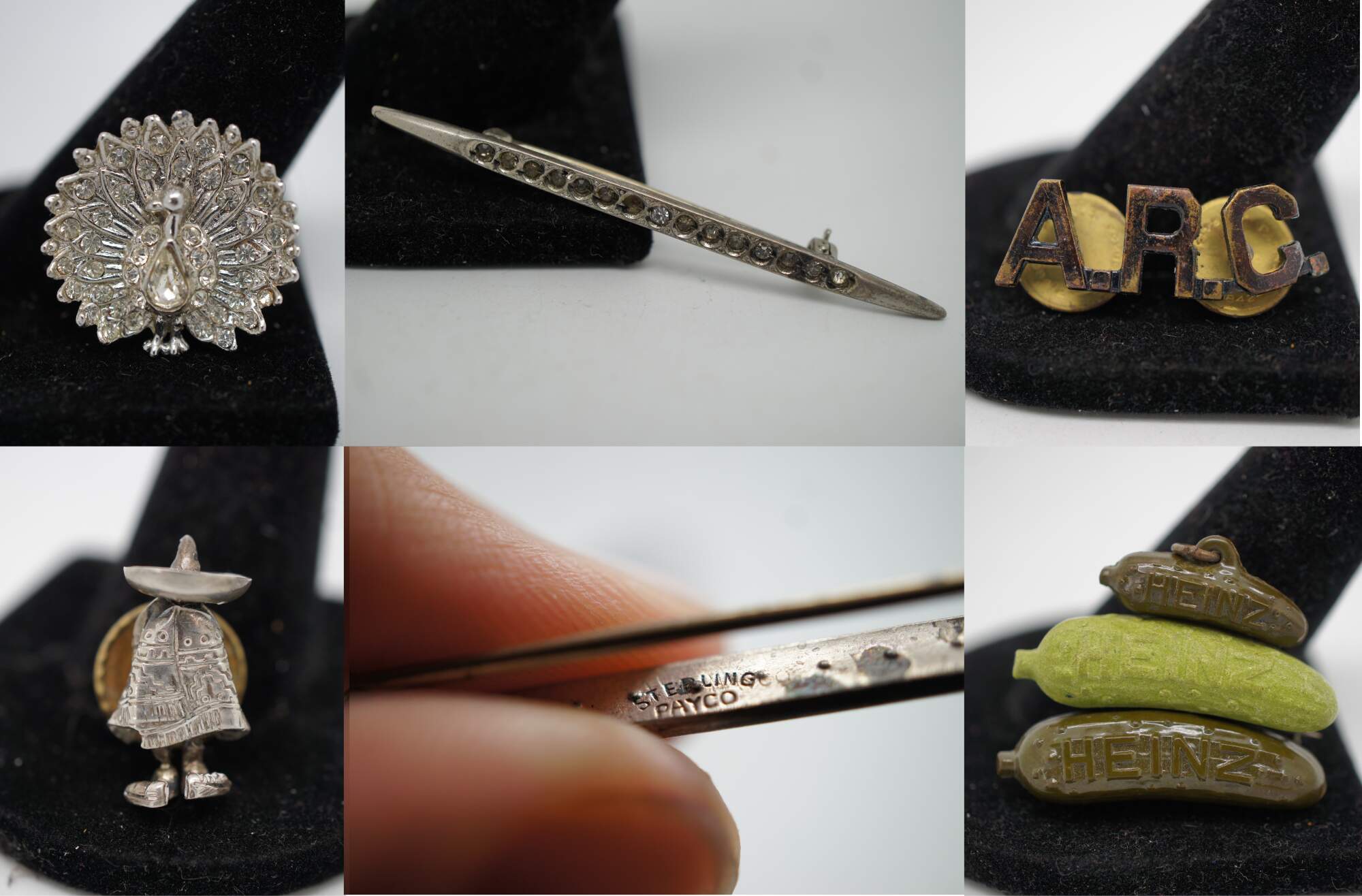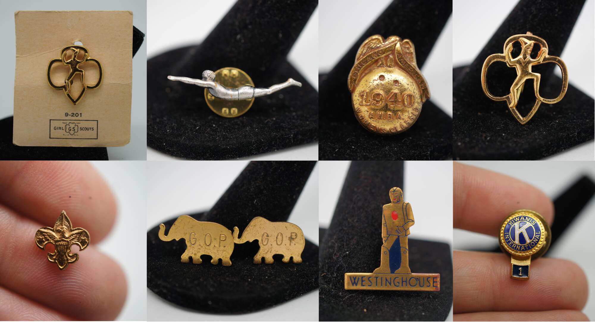 Assorted lot of 39 vintage pins and brooches in a variety of styles, materials and themes including Girl Scouts and Boy Scouts, the G.O.P. Indian painted lacquer, carved wood, pickles, Westinghouse, Donkey, Fleur De Lis, Turkey, Elephant, Diving, Bowling, Eagles, future pilot, American Red Cross ARC, equestrian / horse / horseshoe and Hummel Festival commemorate pin.
