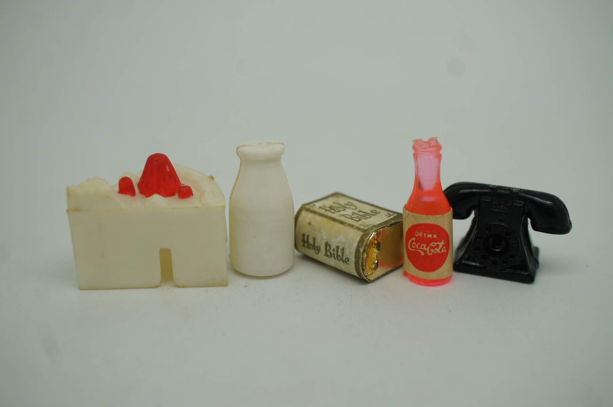 Lot of 27 vintage miniature dollhouse accessories / figurines in plastic and metal / pewter. Includes, tennis shoe, holy bible, bunny / rabbit, easter basket w eggs, camus cognac bottle and goblets, combs, planes, tray, candlestick, challis, telephone / phone, cannon, cake, milk and coca cola.