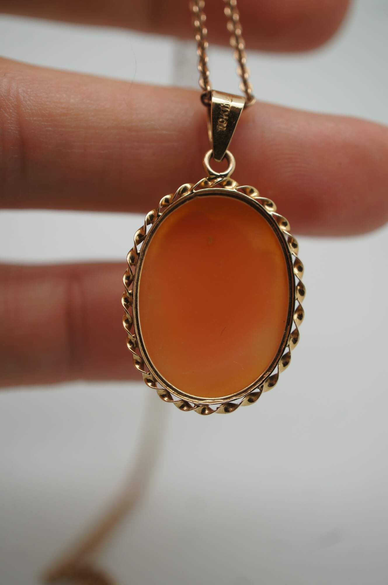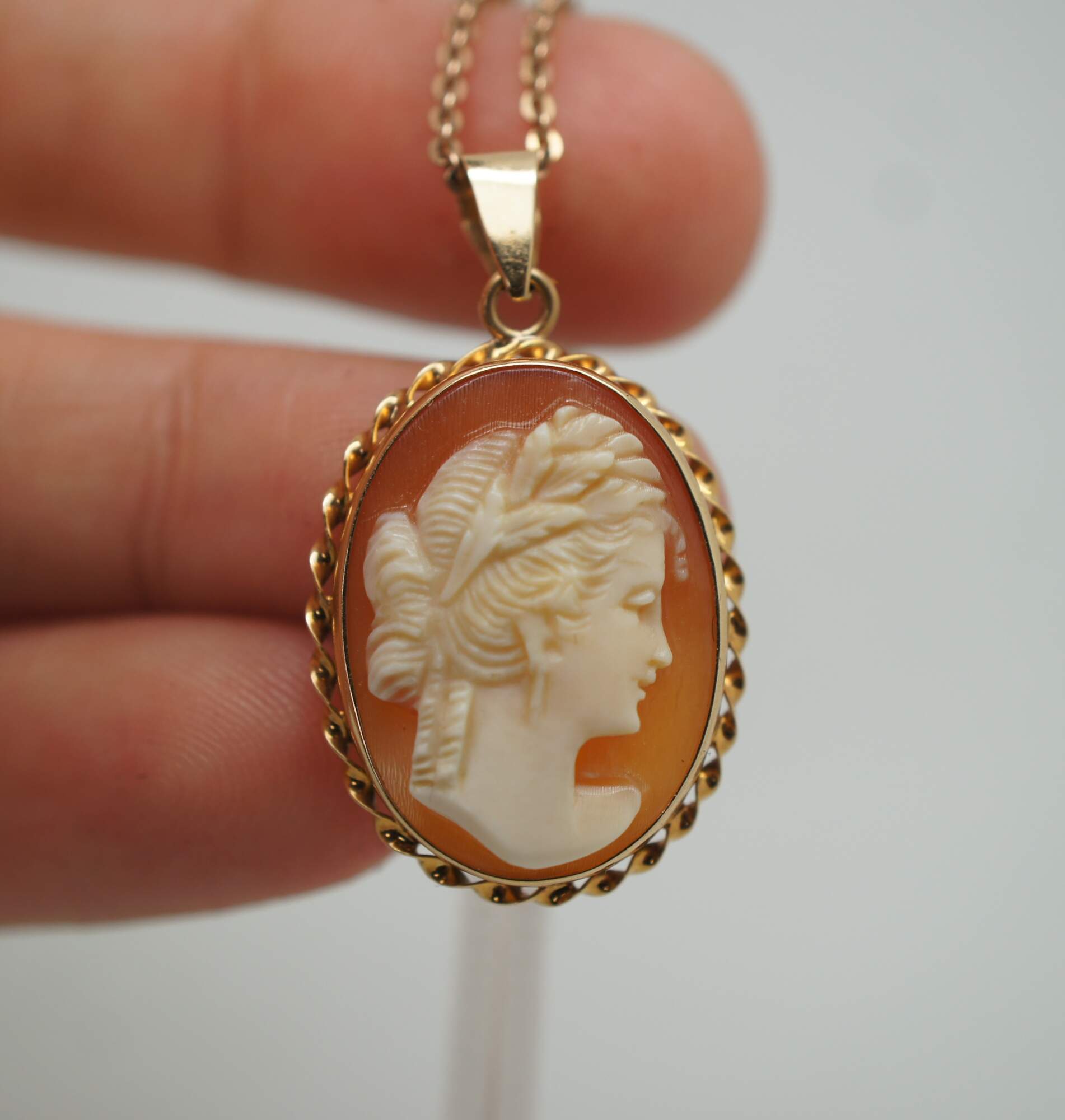 Early 20th century carved shell cameo pendant showing the bust / silhouette of a Neoclassical woman in a laurel wreath crown, framed in a 10k gold twisted frame and chain.