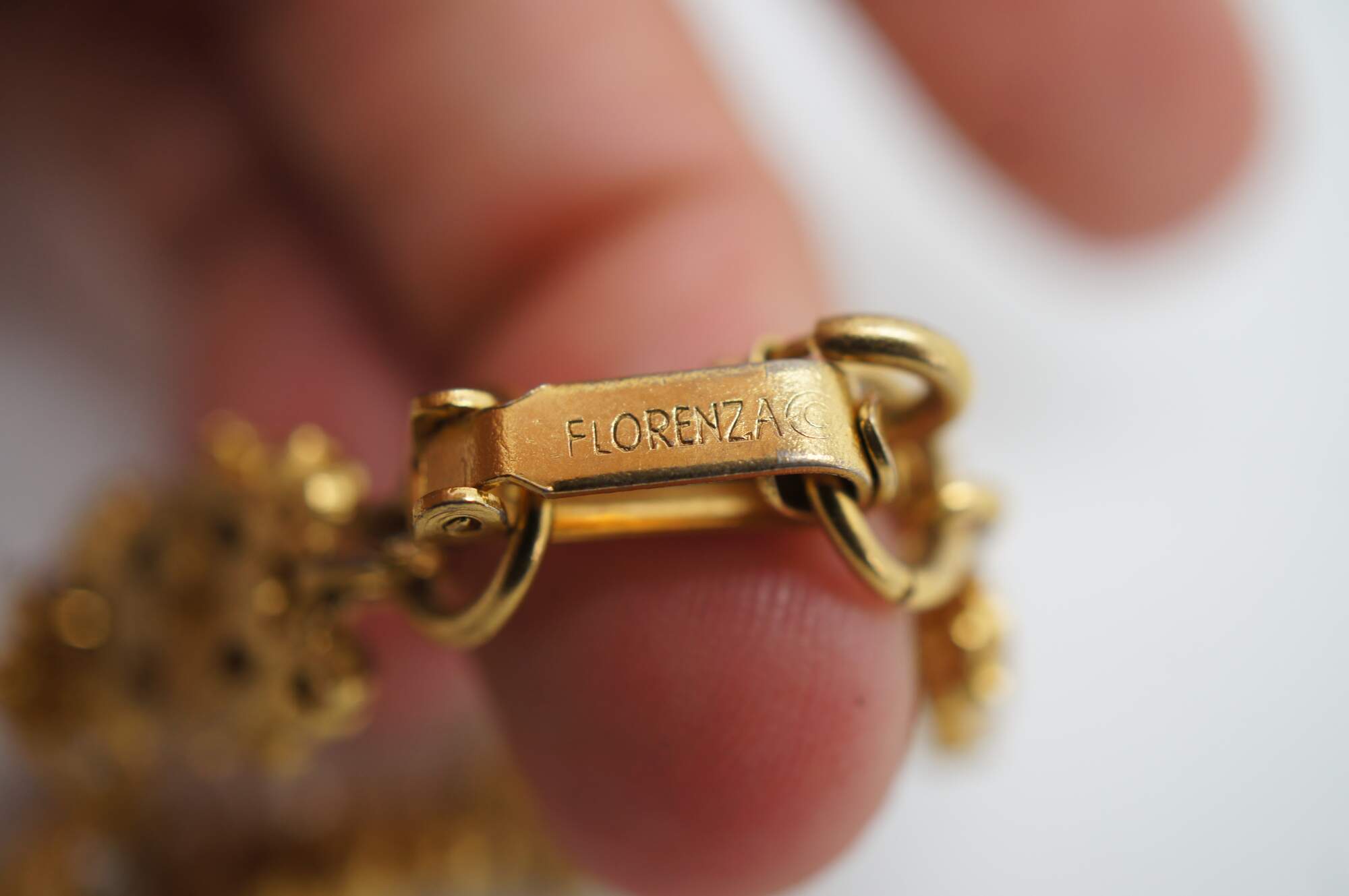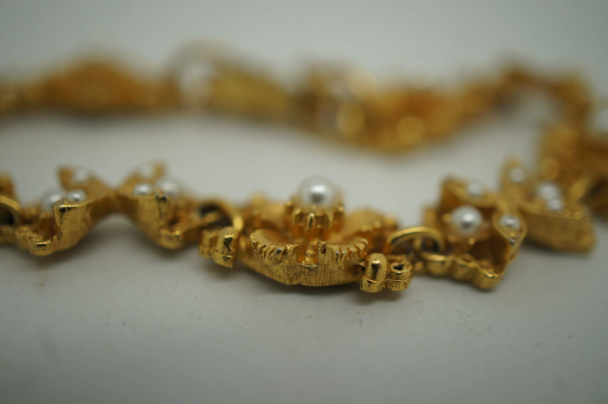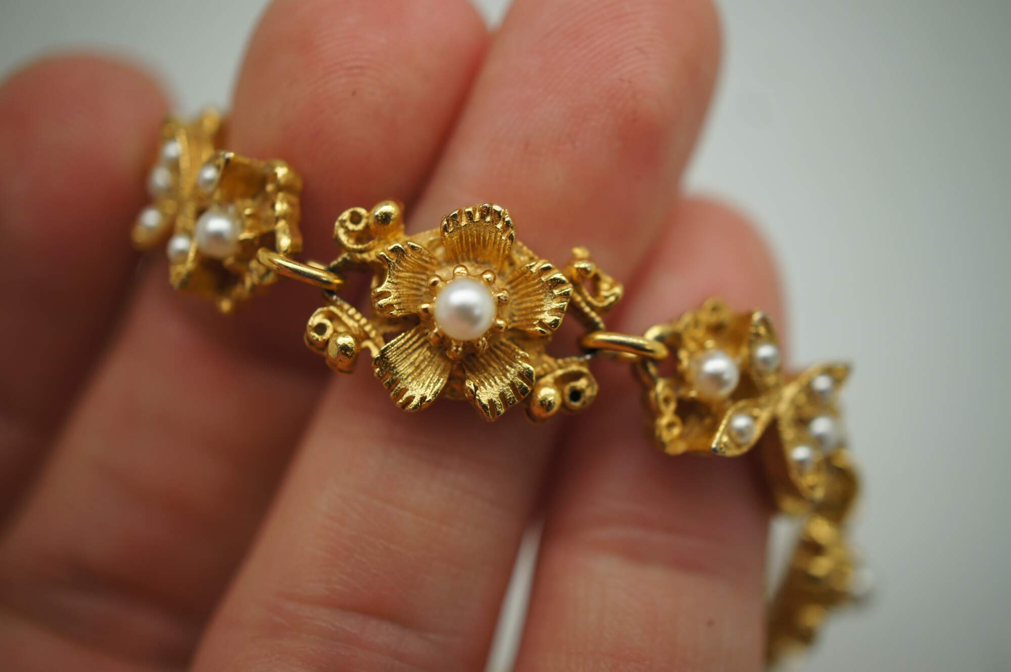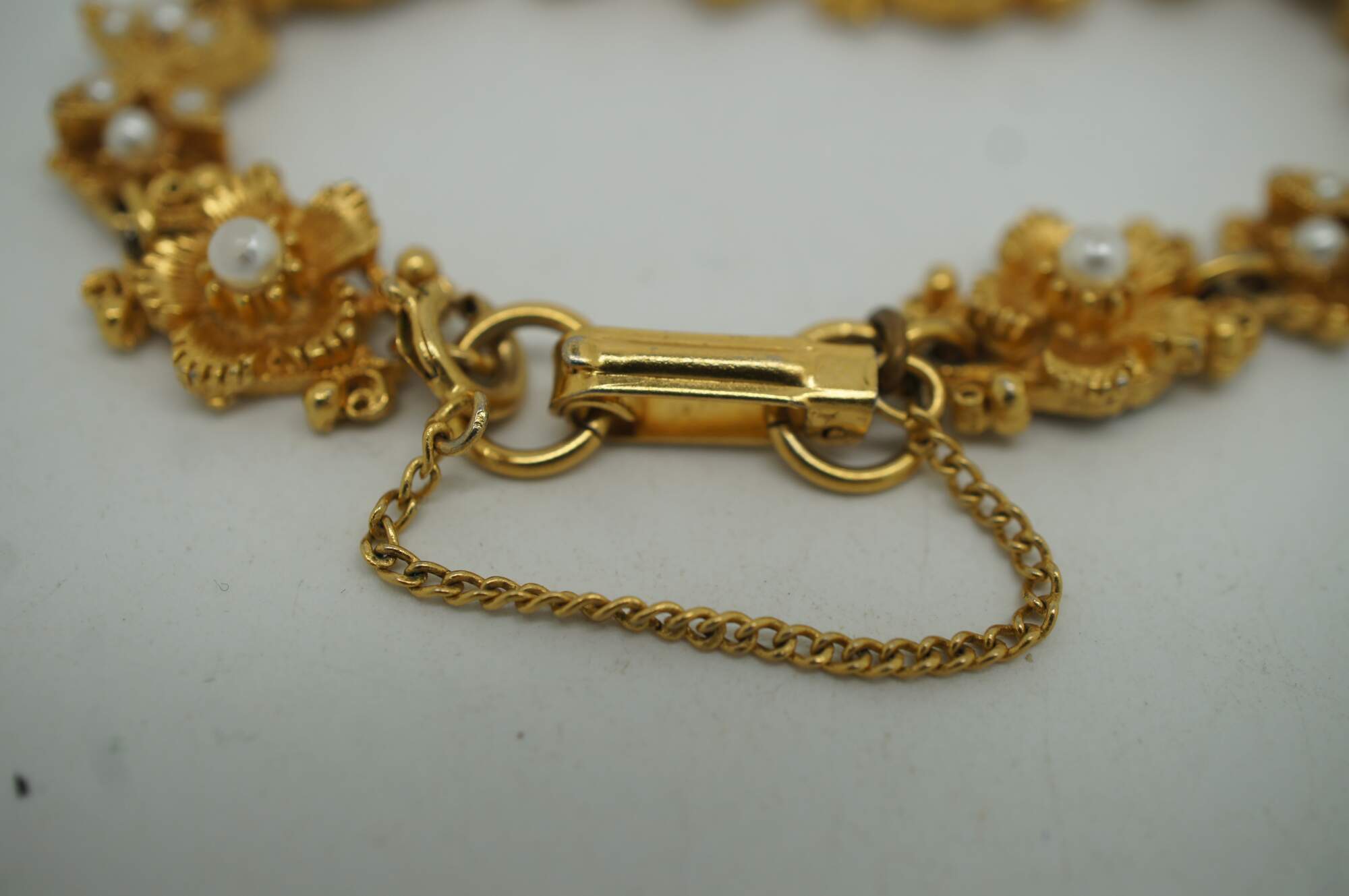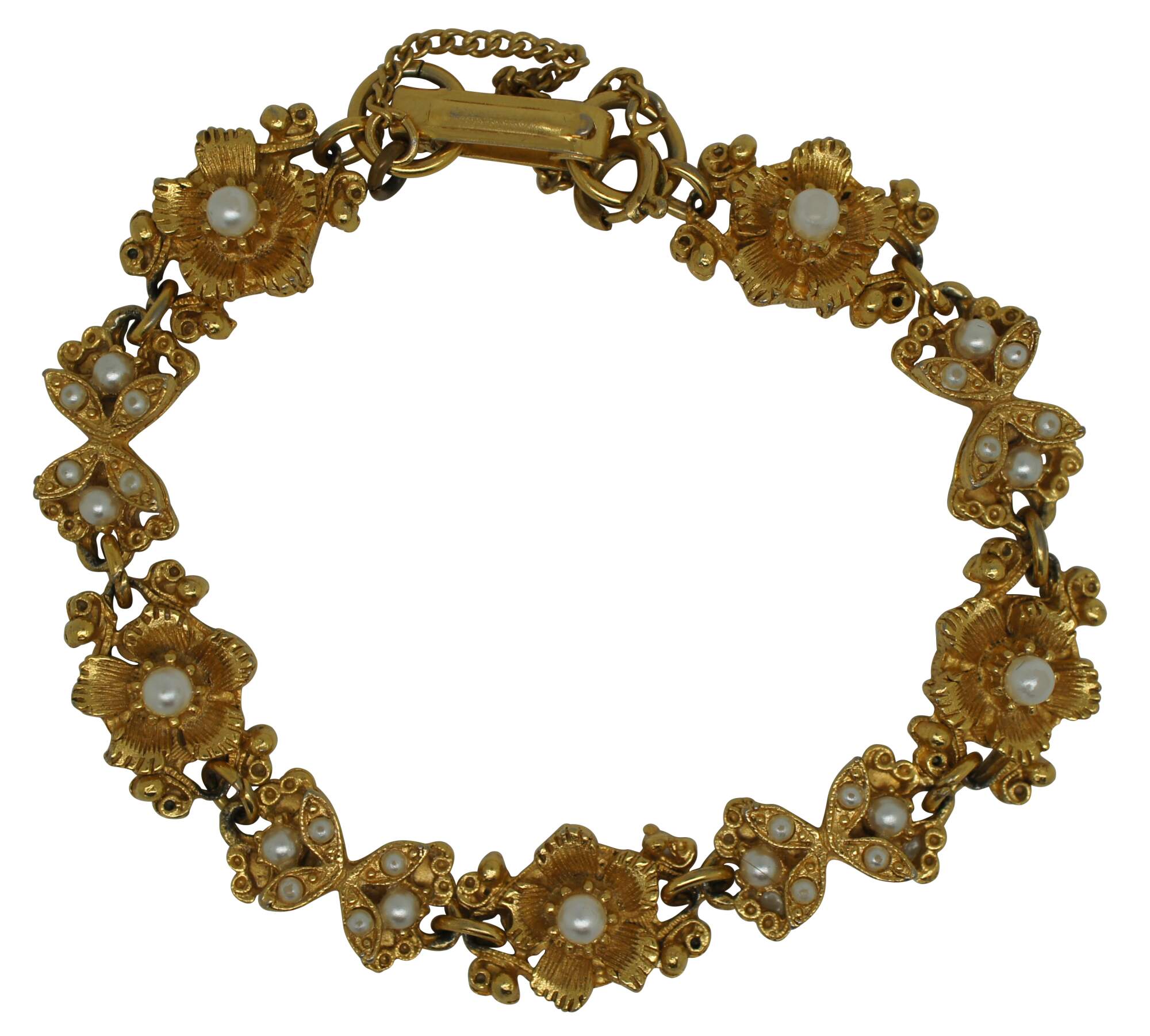 Vintage Florenza gold tone bracelet fashione of alternating bow and flower shaped accented with faux seed pearls.