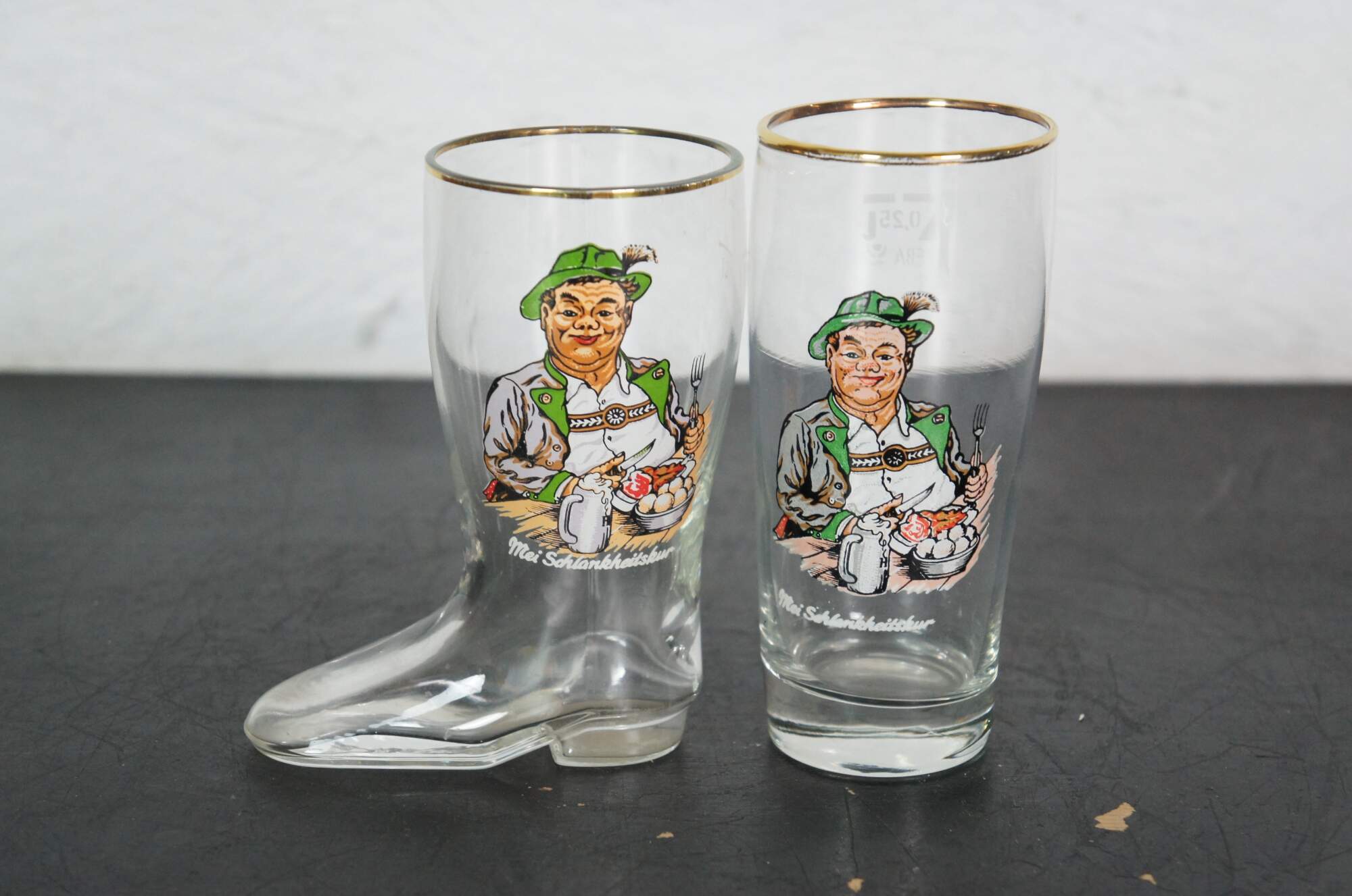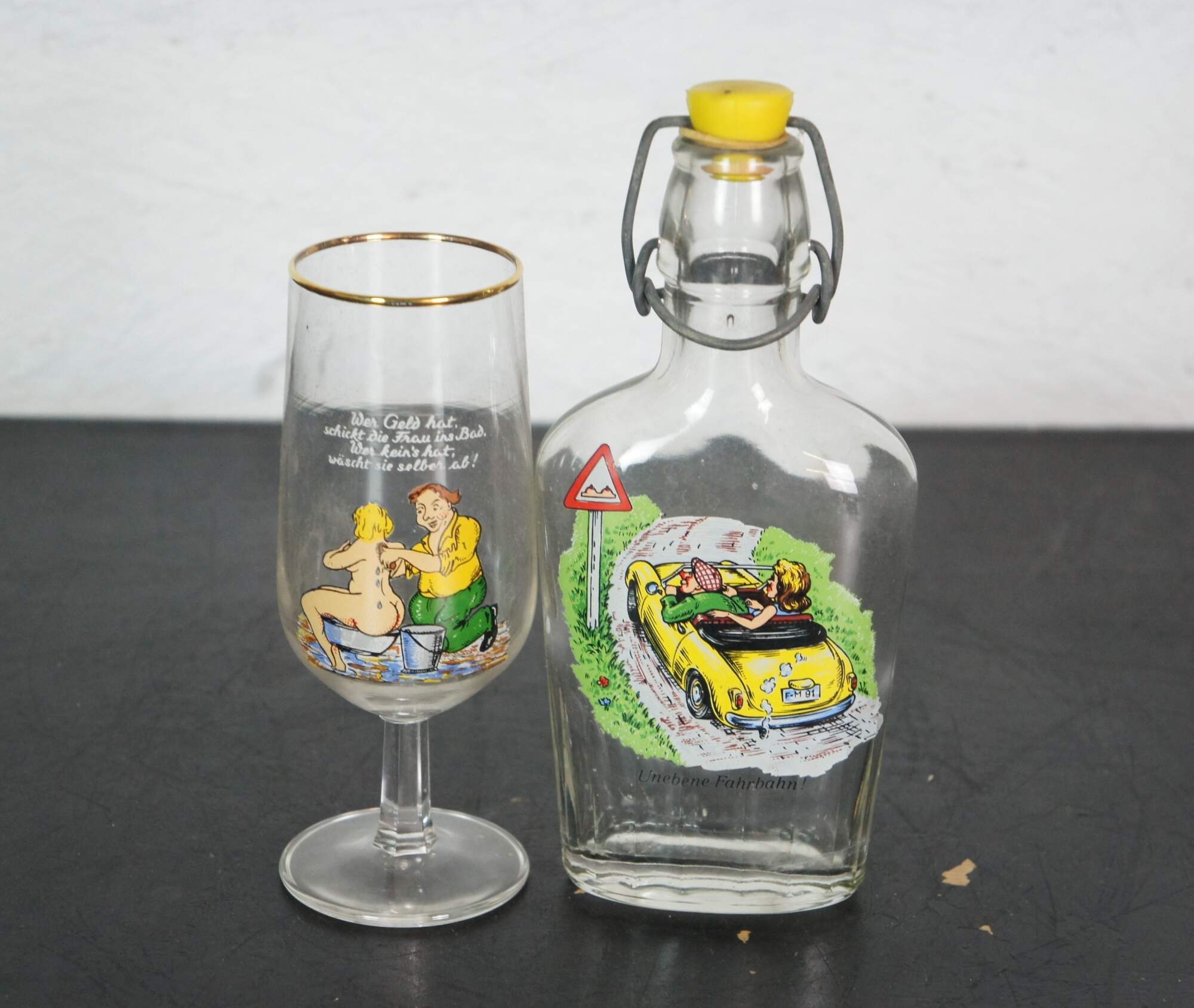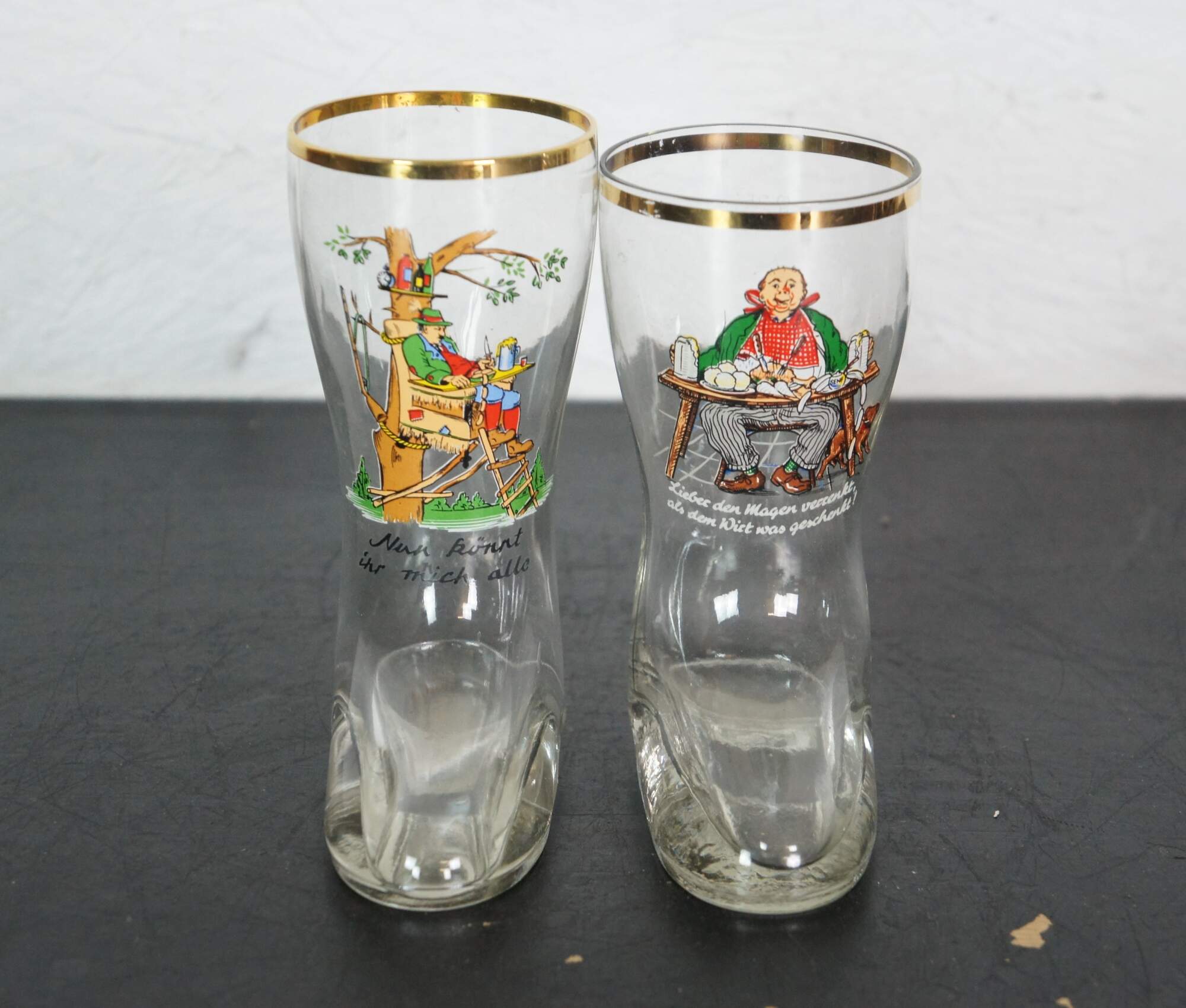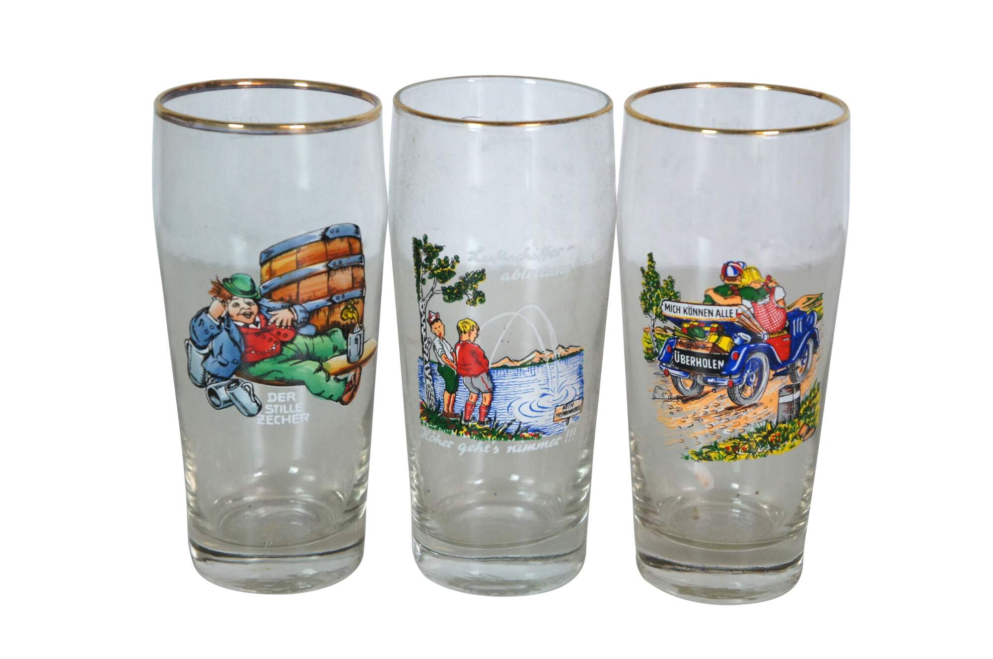 Lot of 23 circa mid-20th century German beer glasses featuring novelty / humorous / risque scenes and figures. Includes 5 boots, 1 goblet and 1 bottle flask.