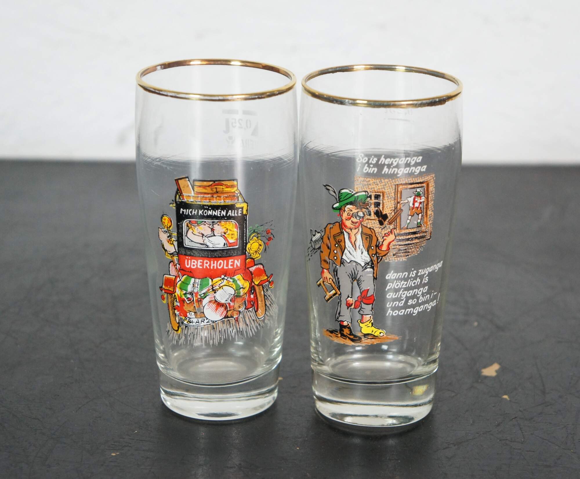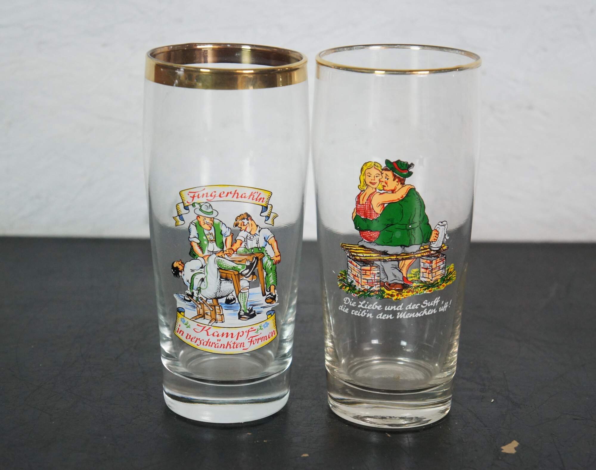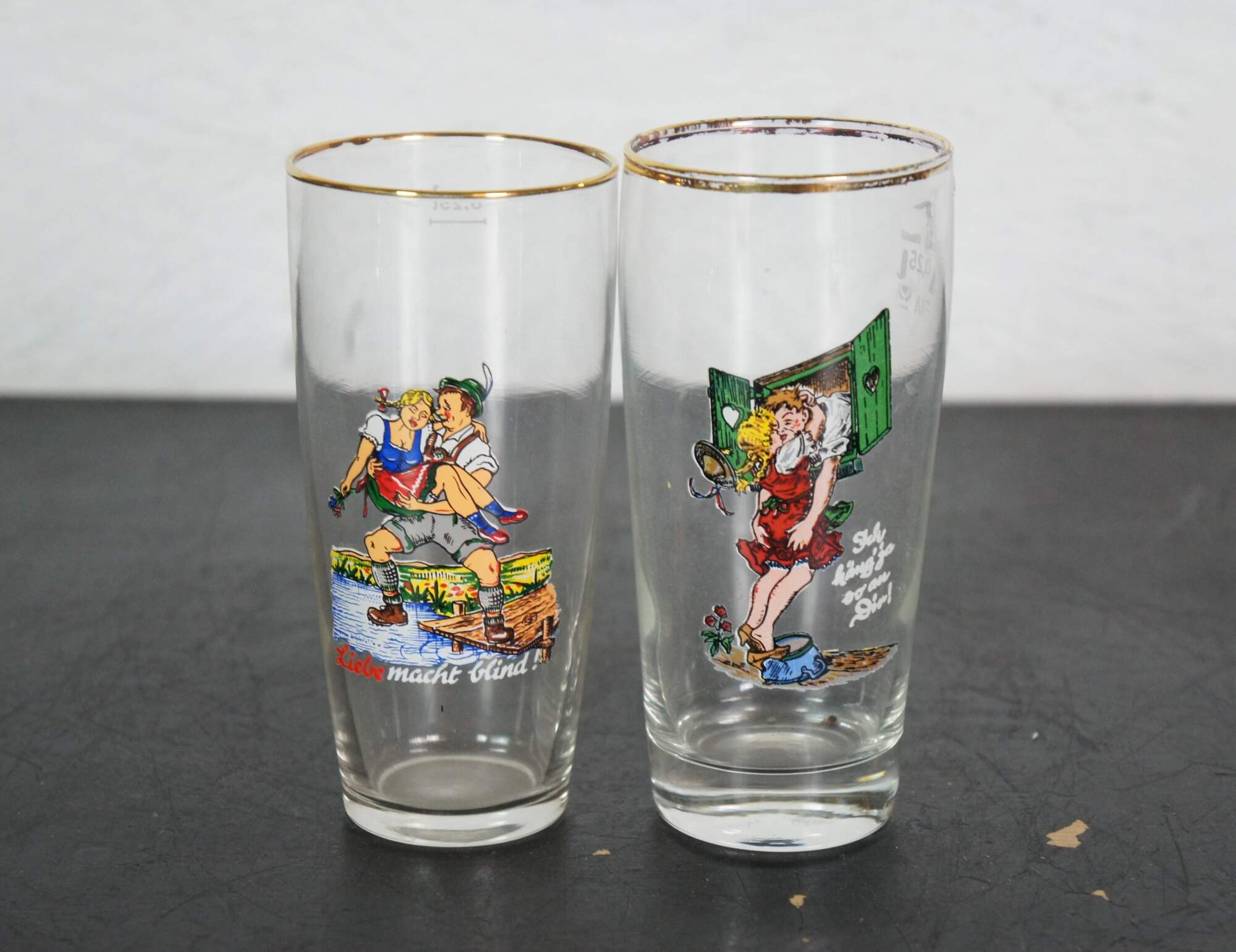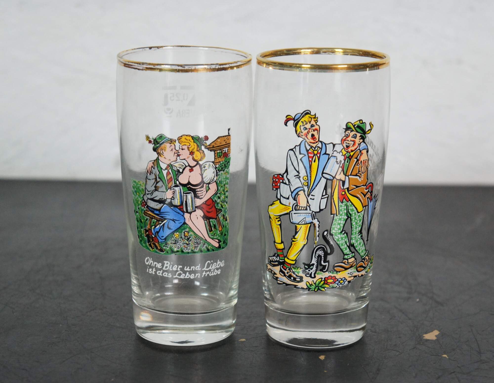 Lot of 23 circa mid-20th century German beer glasses featuring novelty / humorous / risque scenes and figures. Includes 5 boots, 1 goblet and 1 bottle flask.