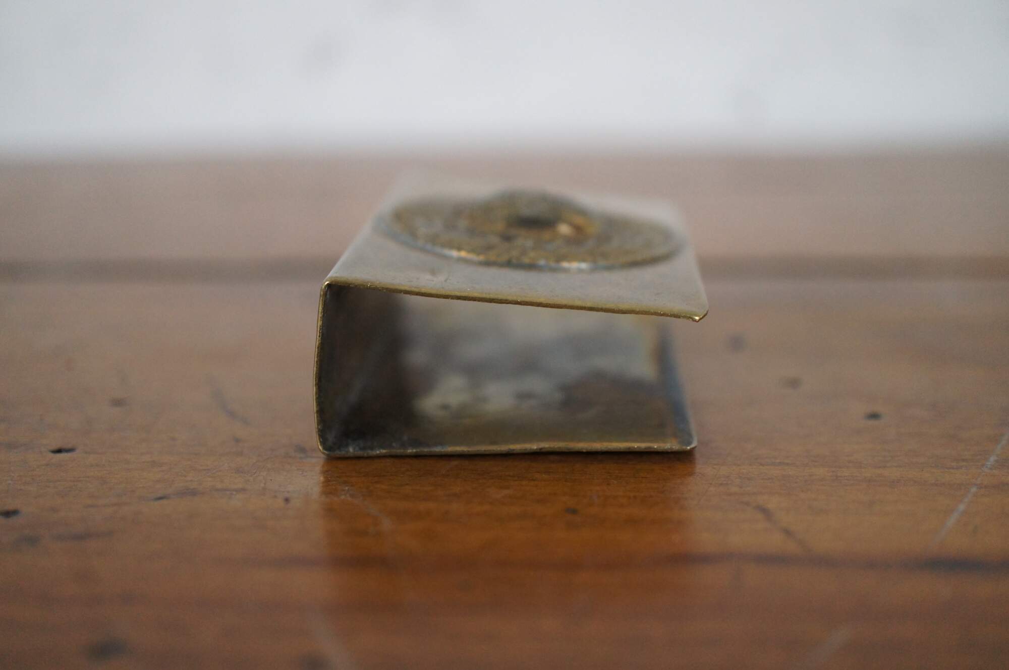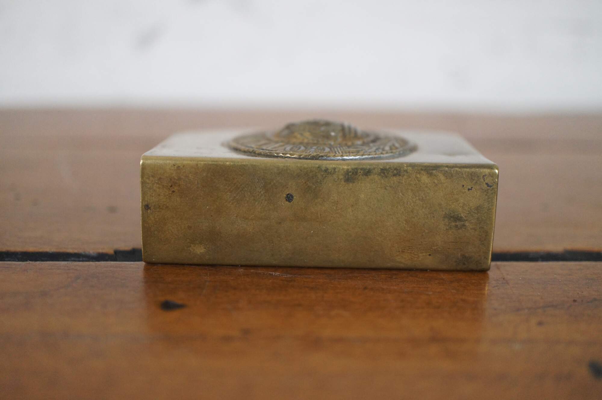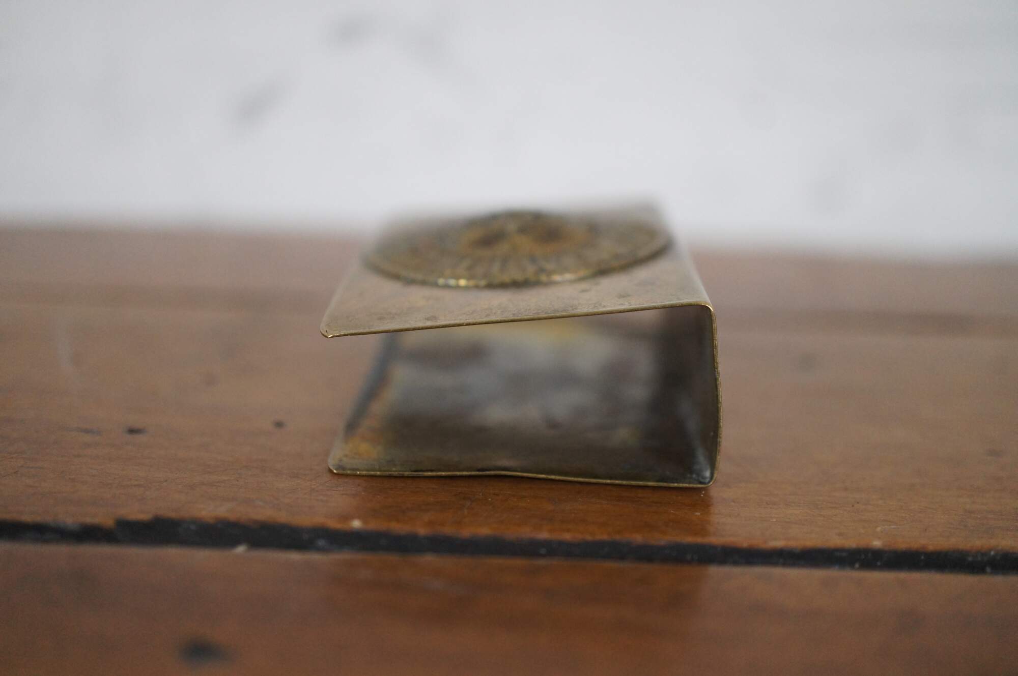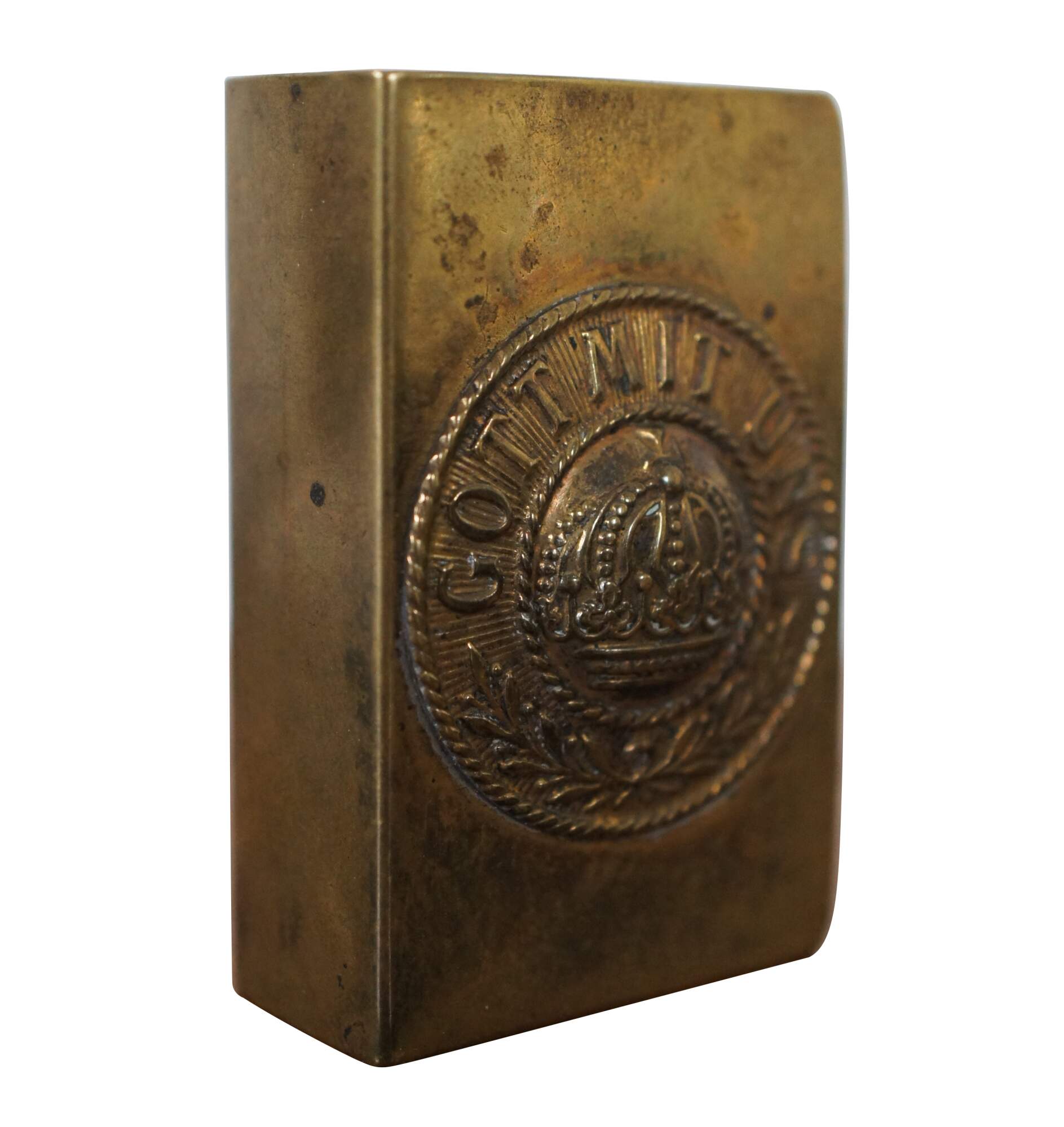 Antique World War I Prussian / German trench art matchbox holder, crafted from the Imperial Army brass belt buckle, featuring a medallion with rope twist edges and a crown at the center, ringed with the words Gott Mit Uns and olive branches.
