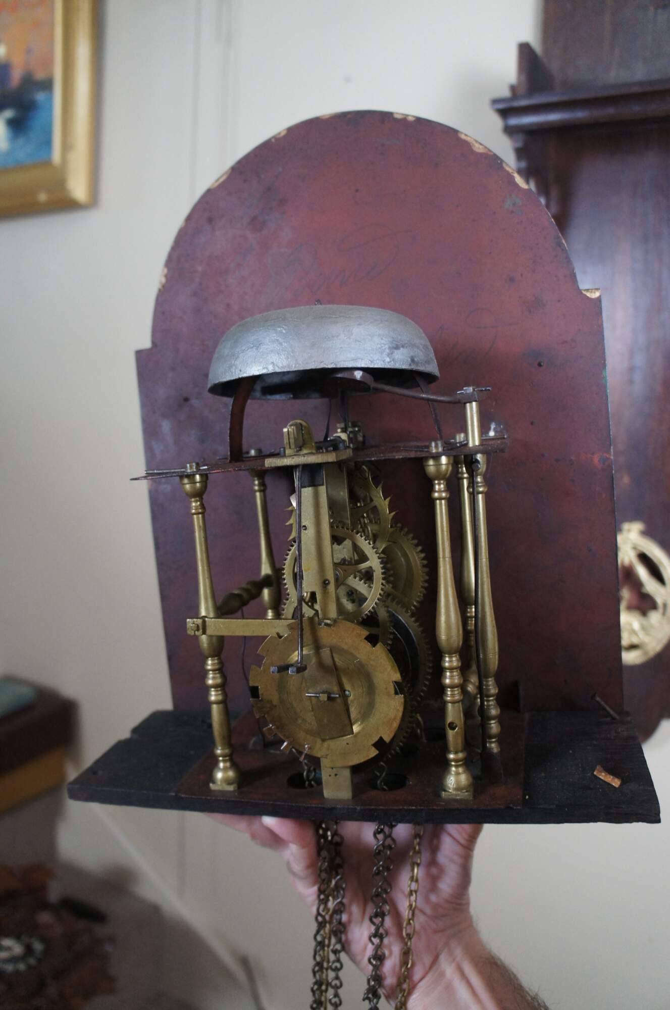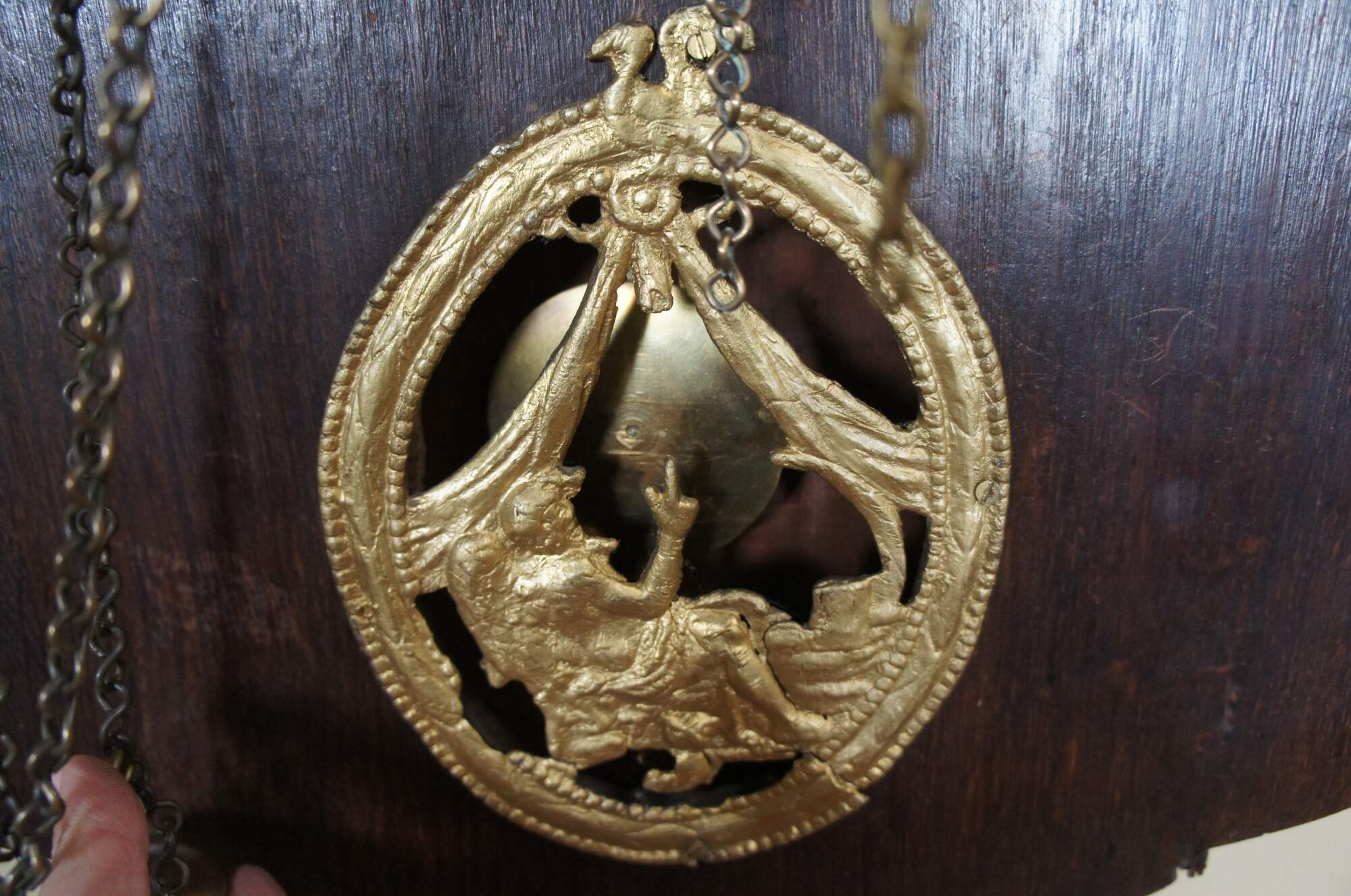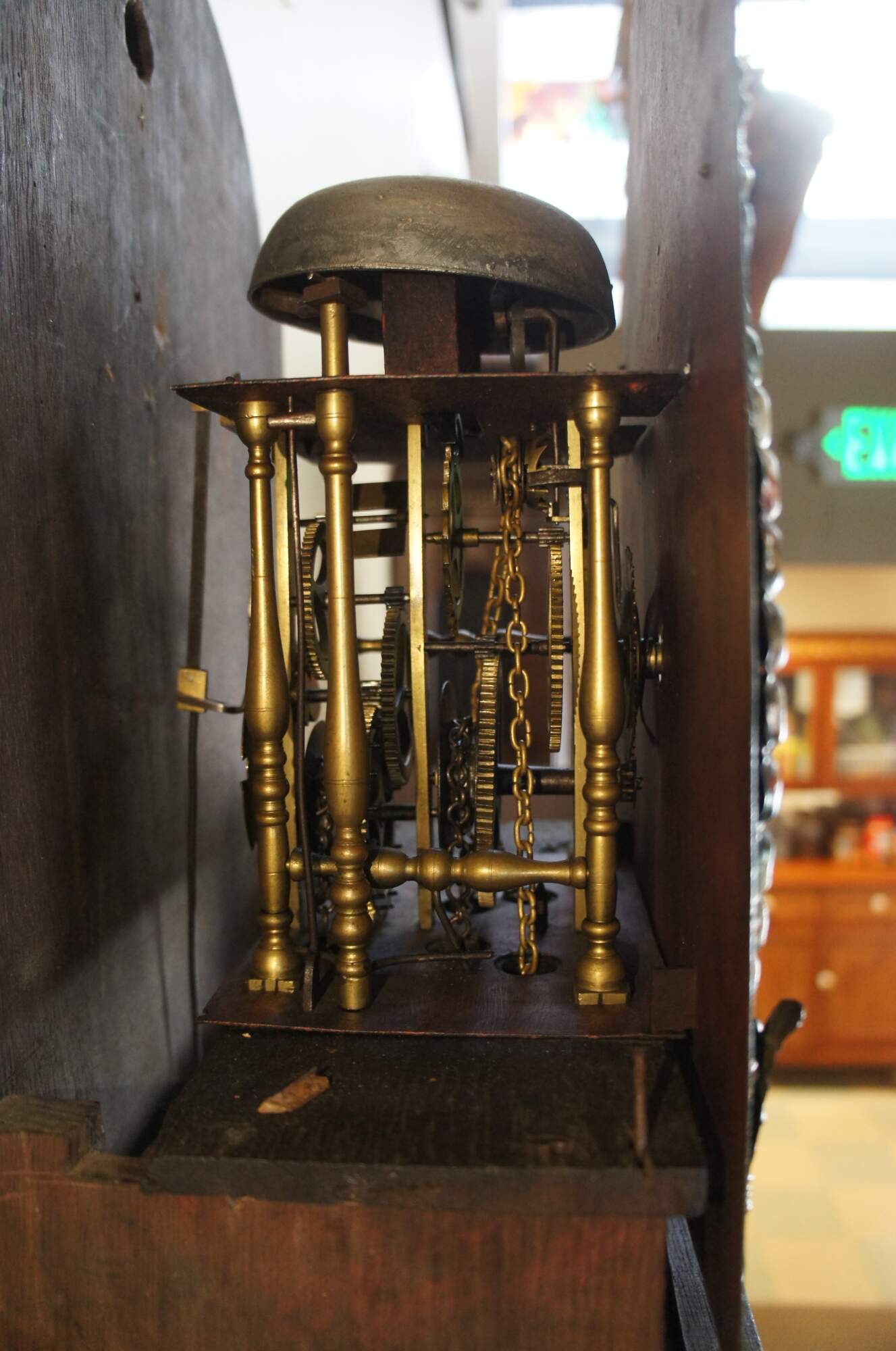 Good Overall with age and use related wear. The clock is currently keeping time and chiming at the half and full hour. It is missing the pulley that would have held the central weight in place. Without it you have to move and re-hang the weight more frequently. There is a split in the case along the right edge of the tail. There is also a split in the bronze mount along the tail towards the bottom right. The lower left capital on the face is missing. Small split in the door. Some paint wear to the face. Missing one of the pin mounts for the face. This is not necessary to hang the face as 3 of the 4 are there.