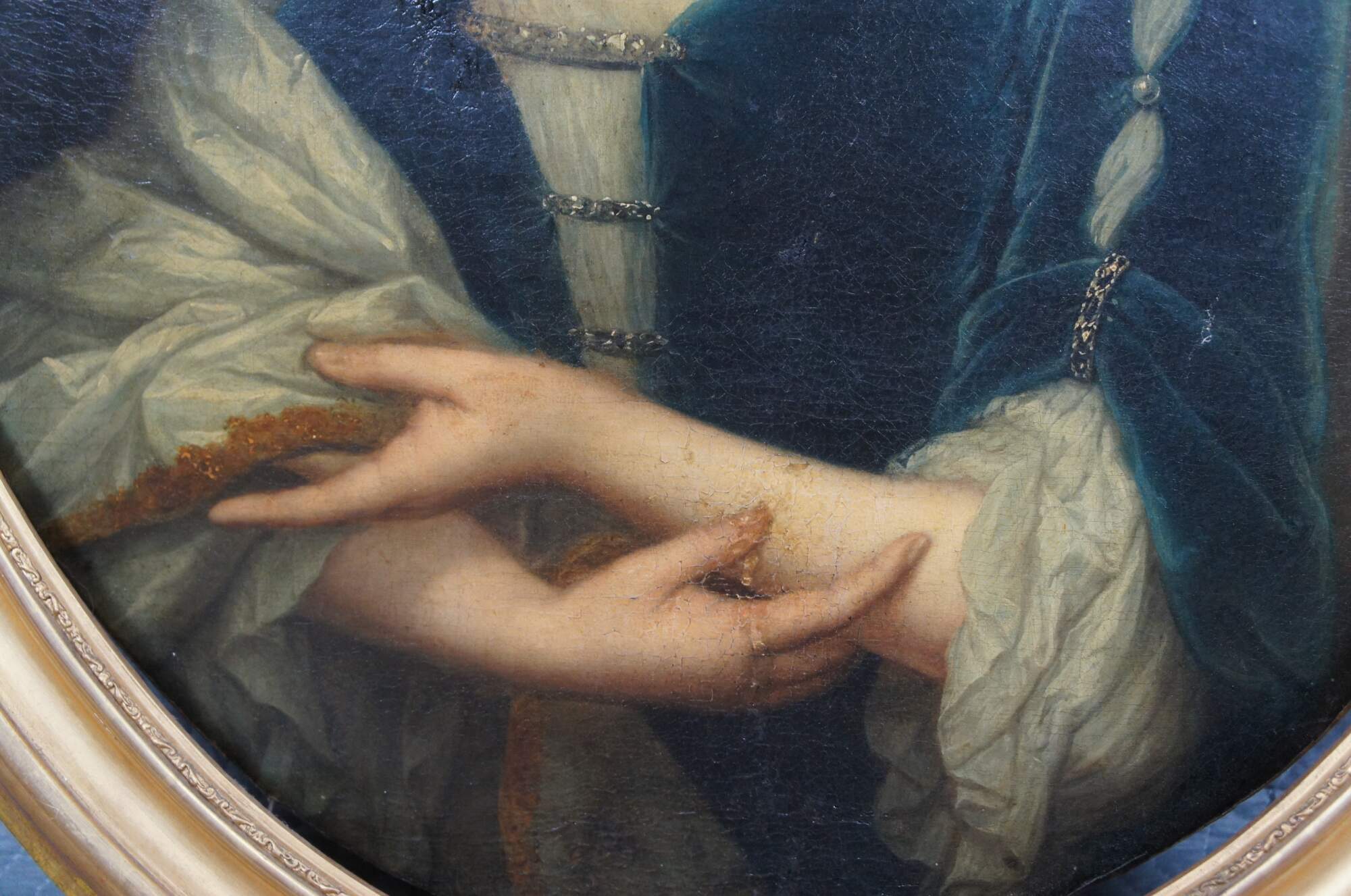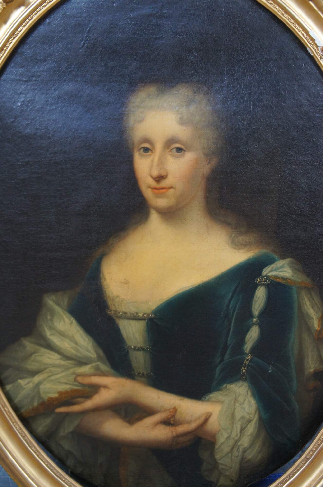An impressive early 18th century dutch school portrait of Carolina Cornelia De Wille, circa 1714. The oval oil painting is on canvas and features a pleasant seated Carolina painted before her marriage wearing a blueish velvet jeweled dress with crossed arms. Framed in an oval wood gold finished neoclassical frame with ribbon design along the top. Labeled and dated along the backside in Dutch.