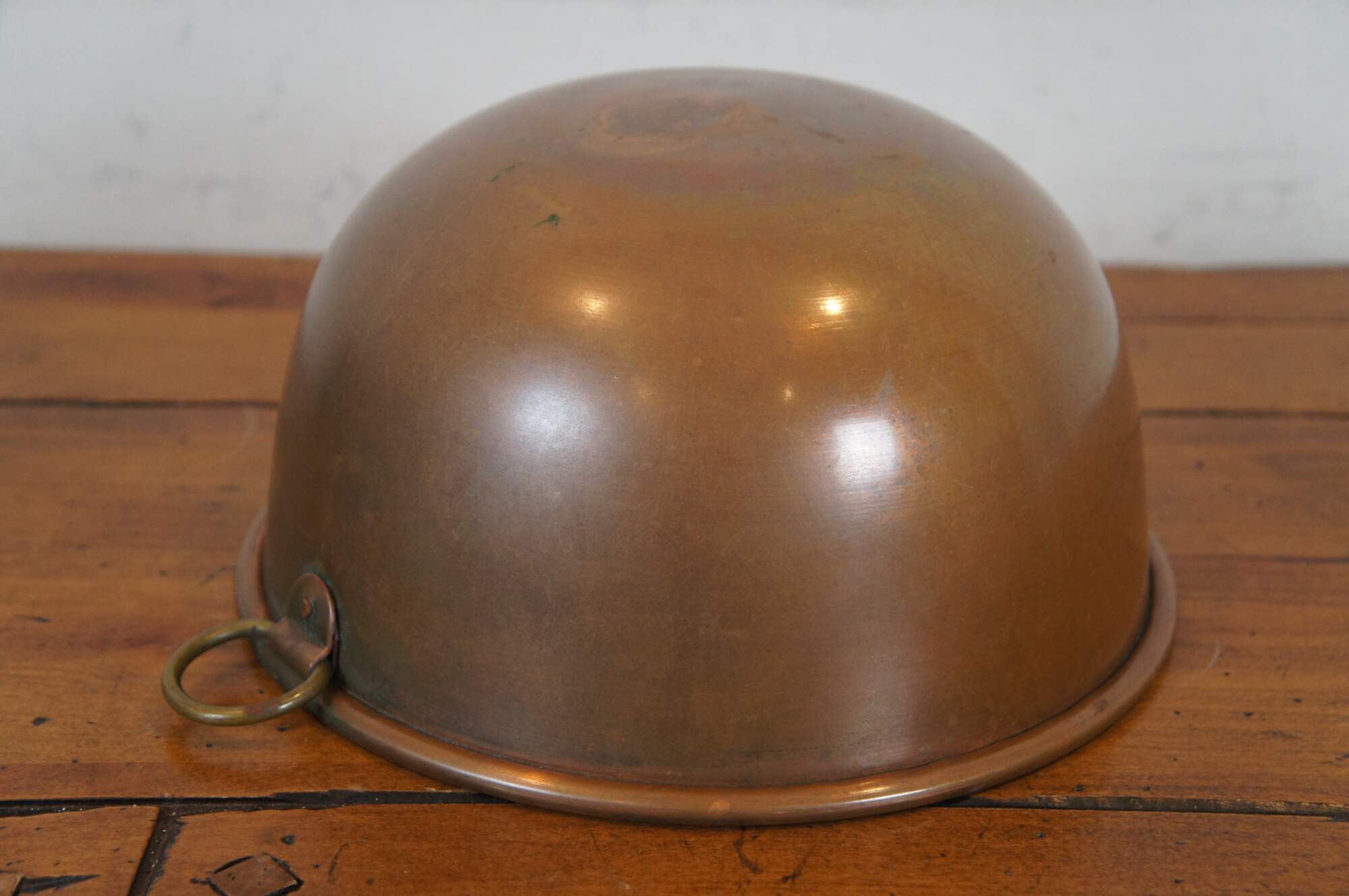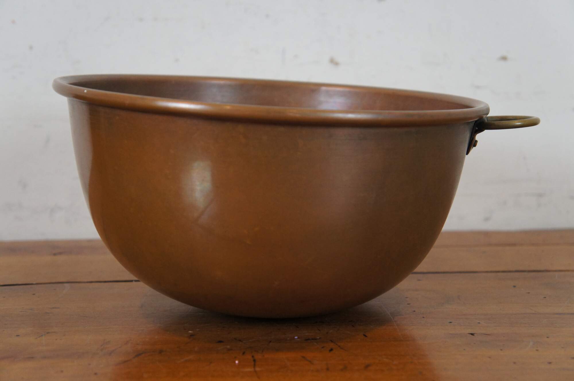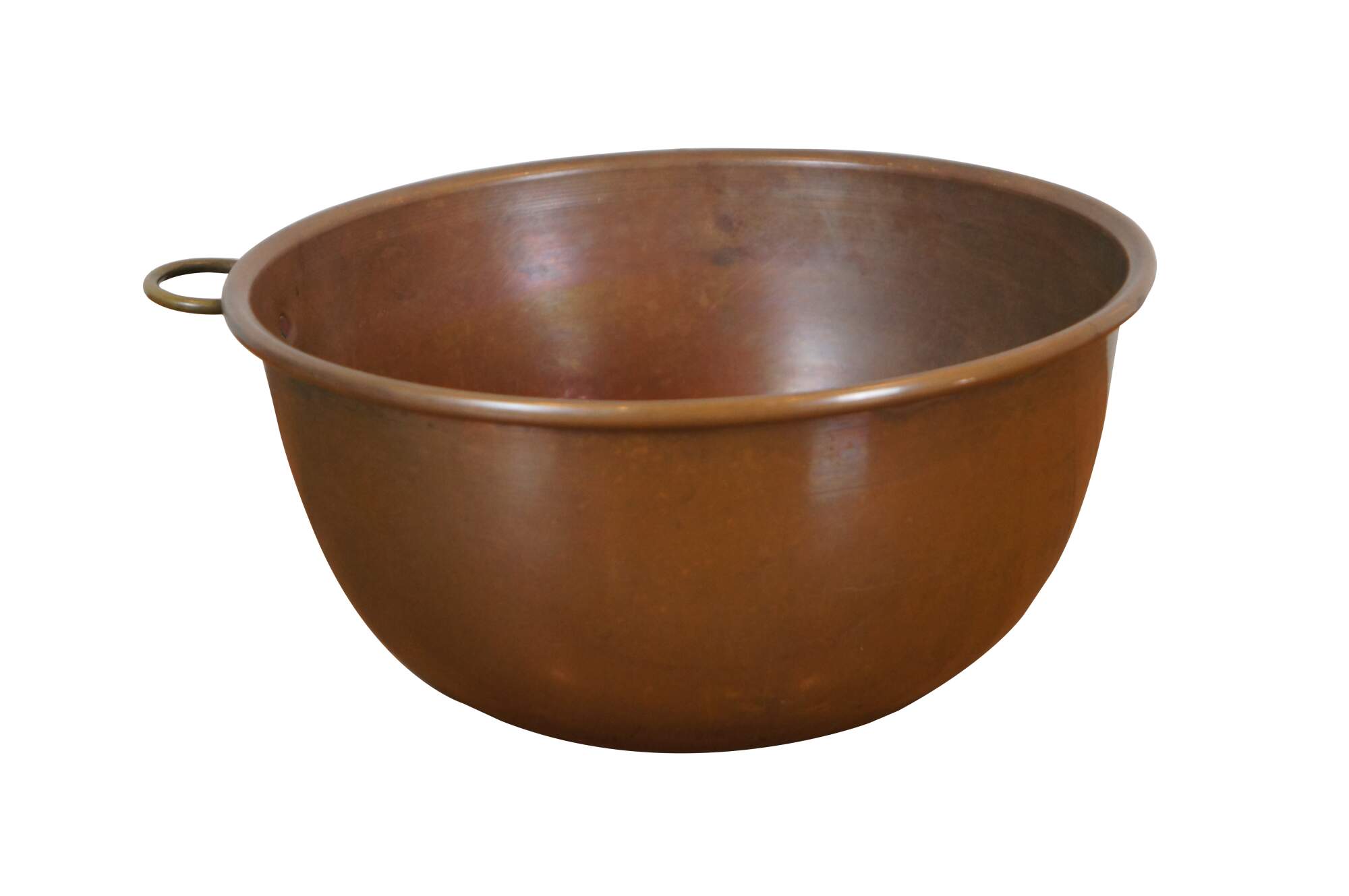 Vintage spun copper mixing bowl with rolled edge, rounded bottom / base and fixed brass hanging ring.