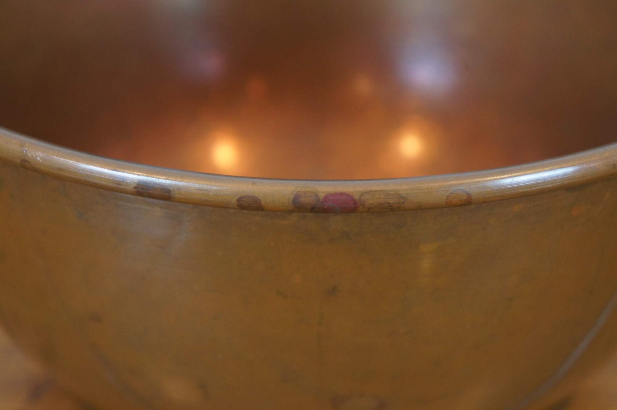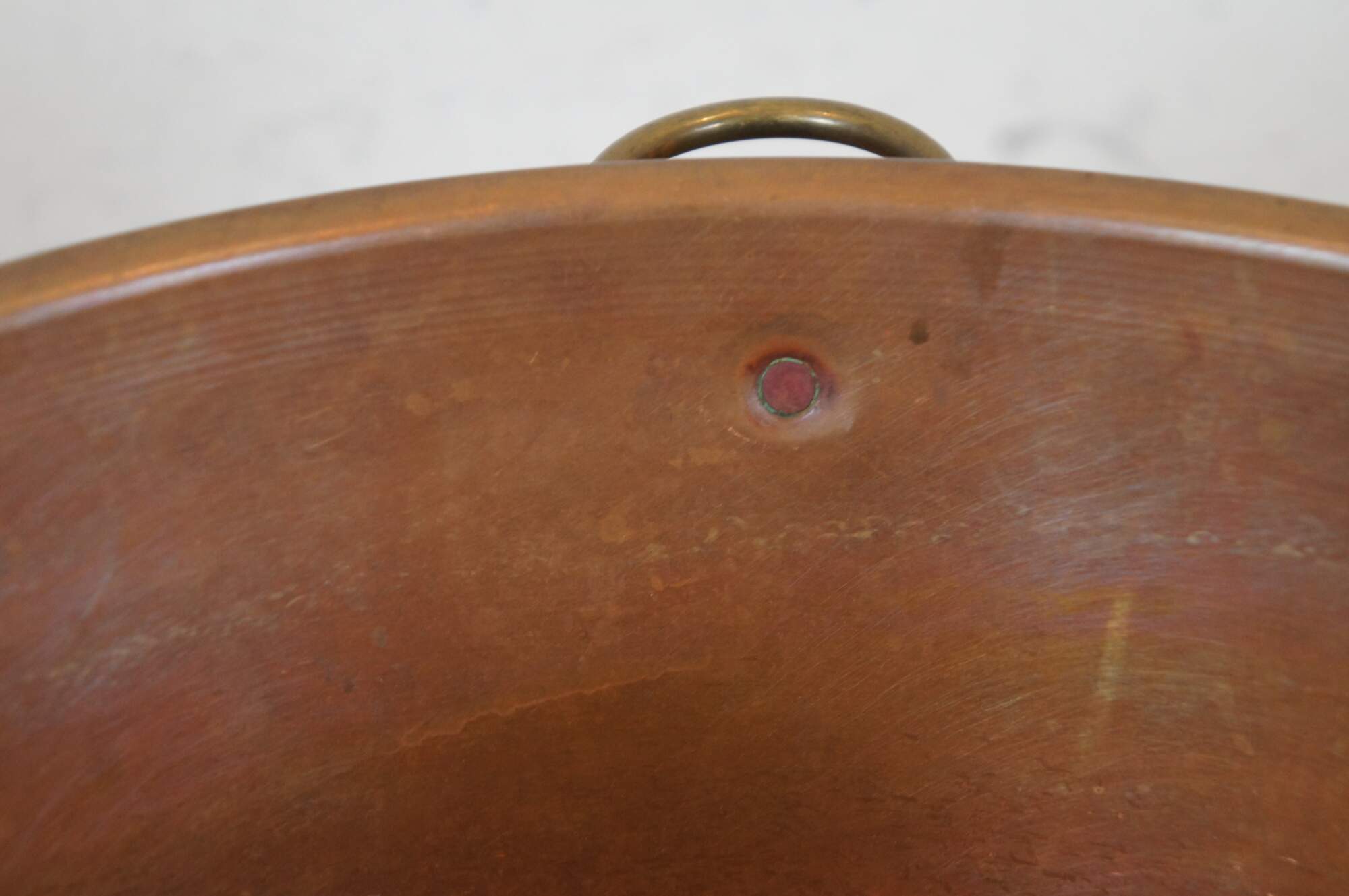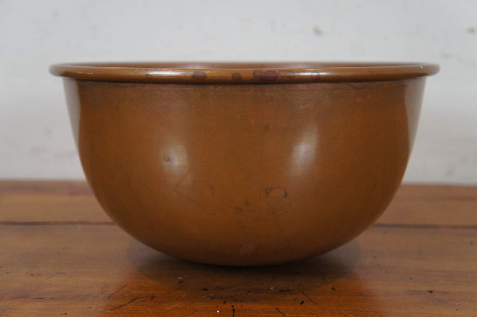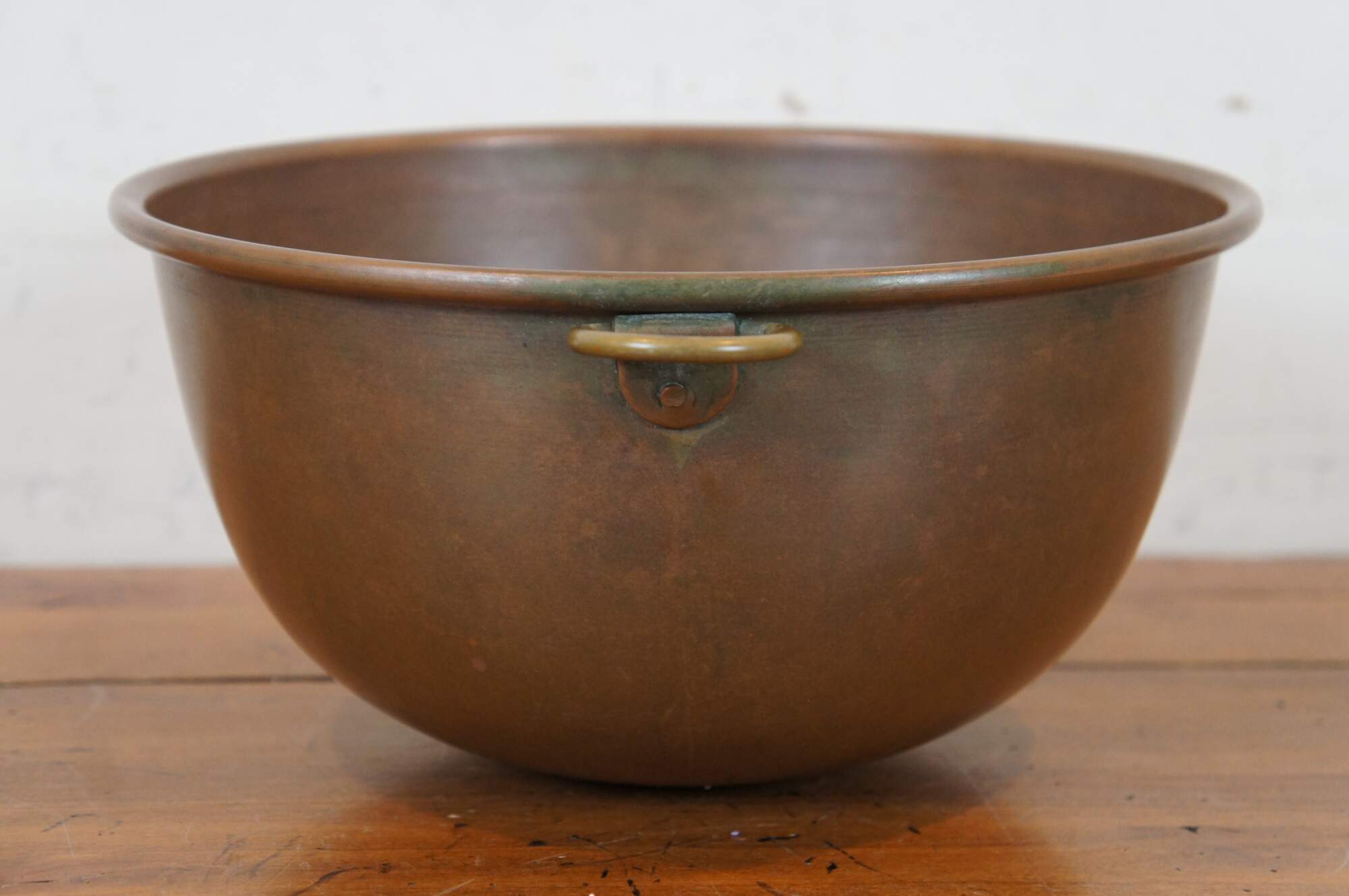 Vintage spun copper mixing bowl with rolled edge, rounded bottom / base and fixed brass hanging ring.