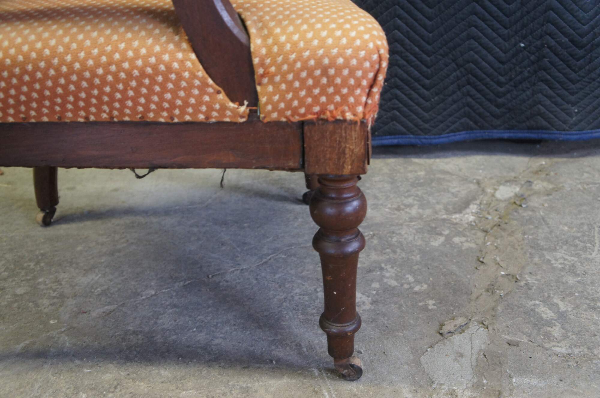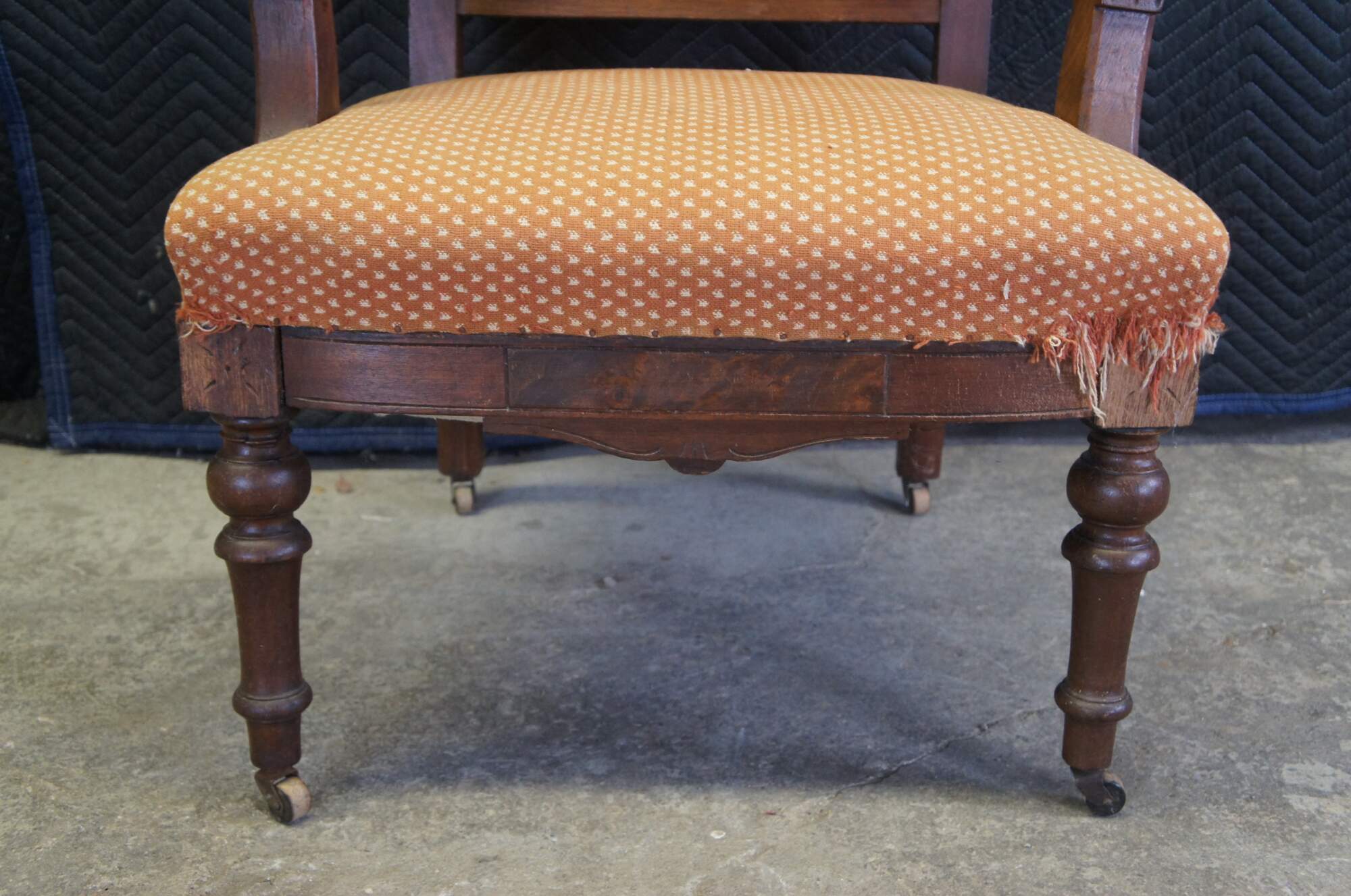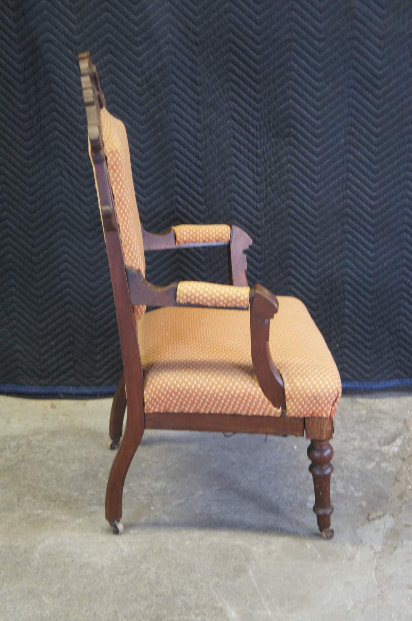 Antique Victorian parlor armchair. Made of walnut featuring Eastlake styling with carved frame, fauteuil arms and turned legs with castors.