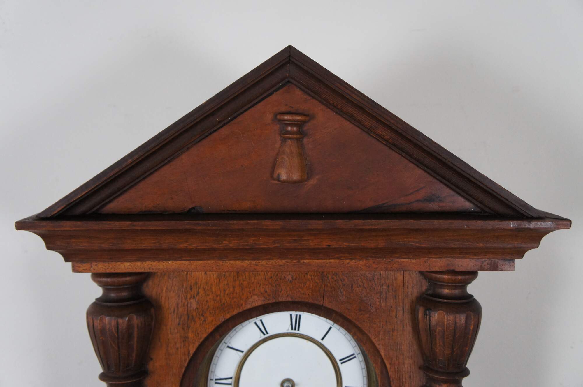 Antique German wall clock circa early 1900’s – wooden case with triangular pediment, carved columns at the sides and turned finials suspended from the base. Arched glass front and sides. Brass and white enameled face with Roman numerals. R-A pendulum. Original works replaced sometime in the late 20th century with battery operated mechanism.