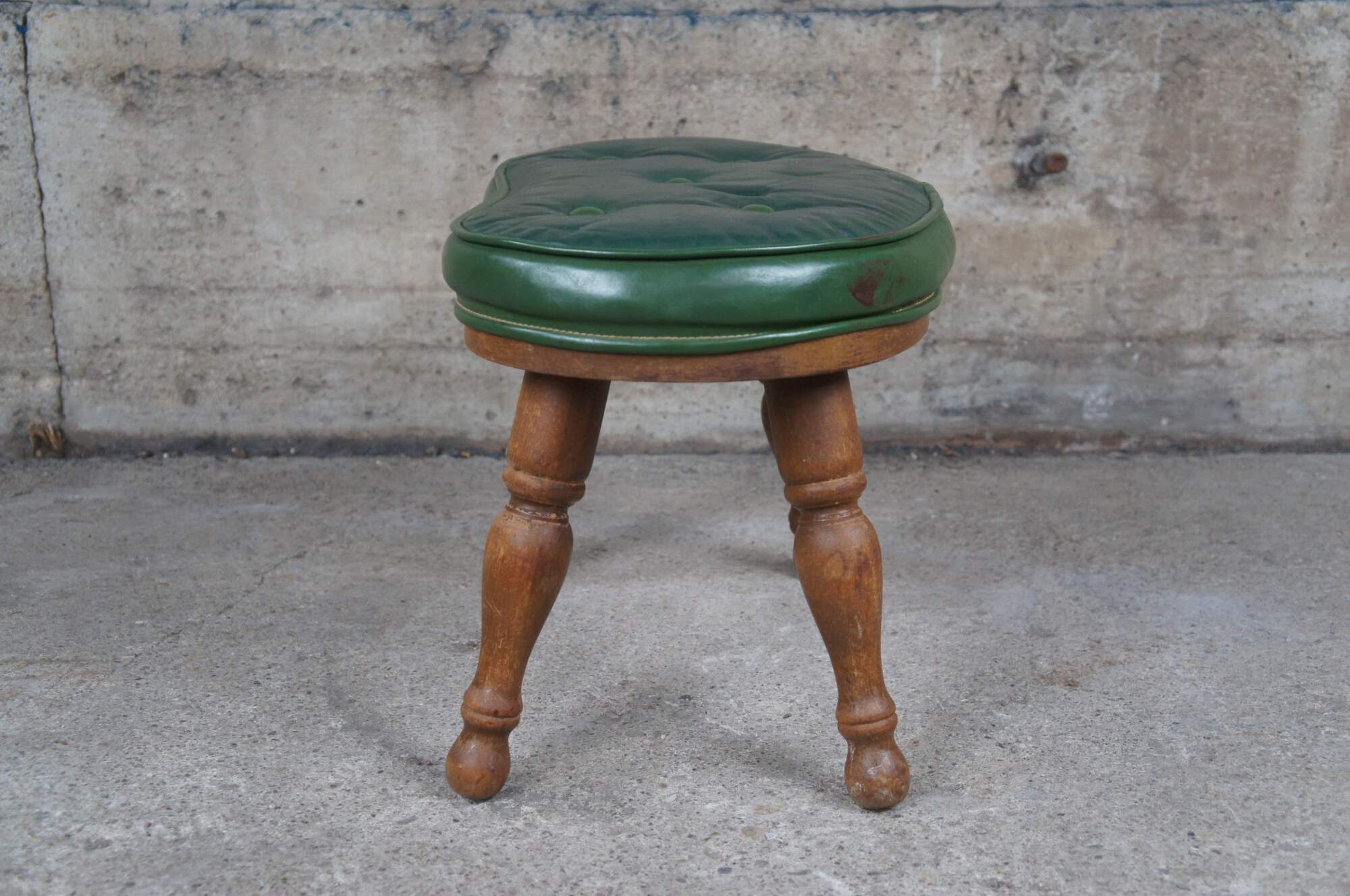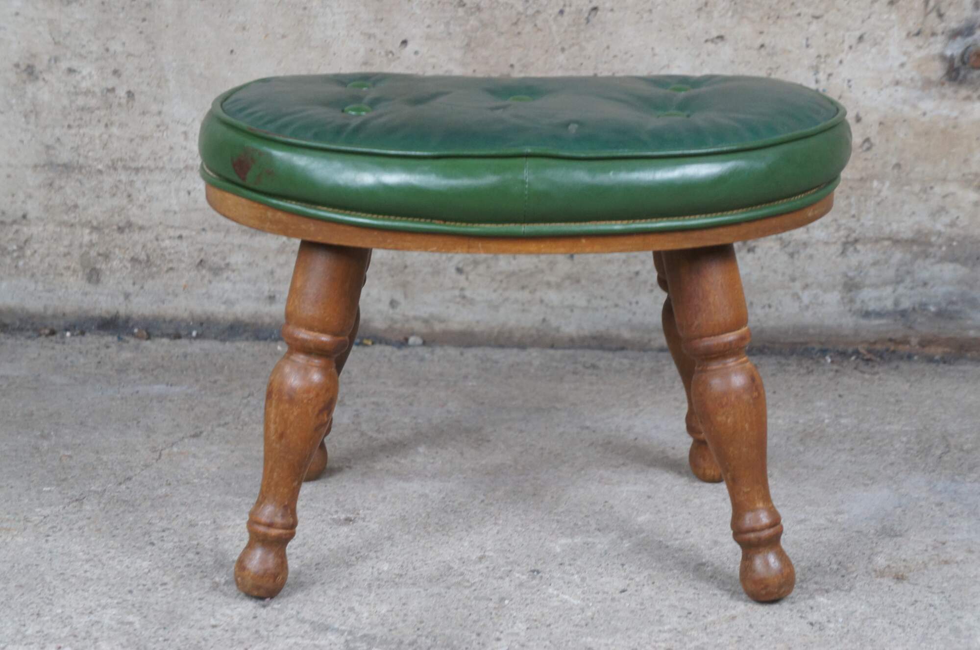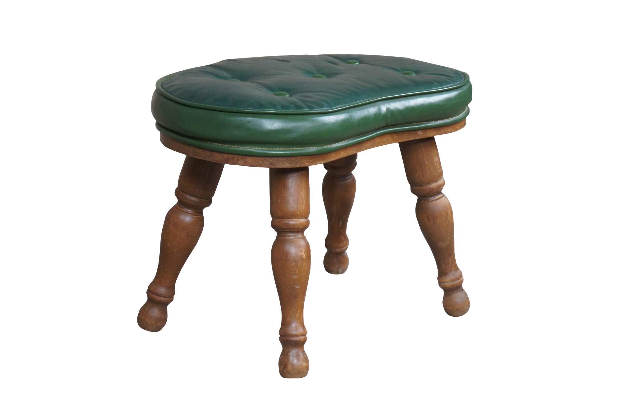 Mid Century Kidney Bean Foot Stool, Bench seat or Ottoman. Features a hardwood frame with turned legs and a green vinyltufted seat. A retro design that will draw attention in any space.