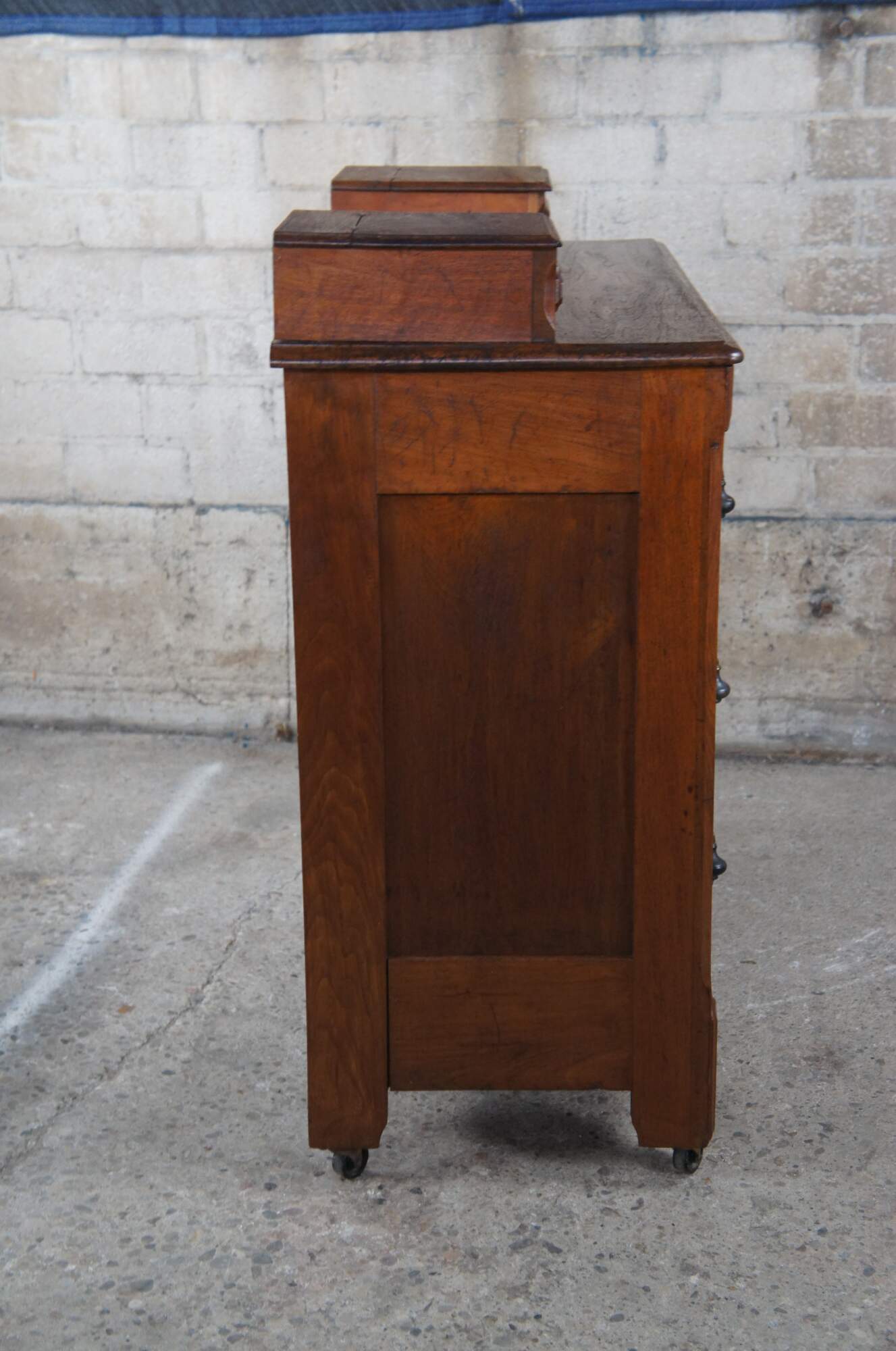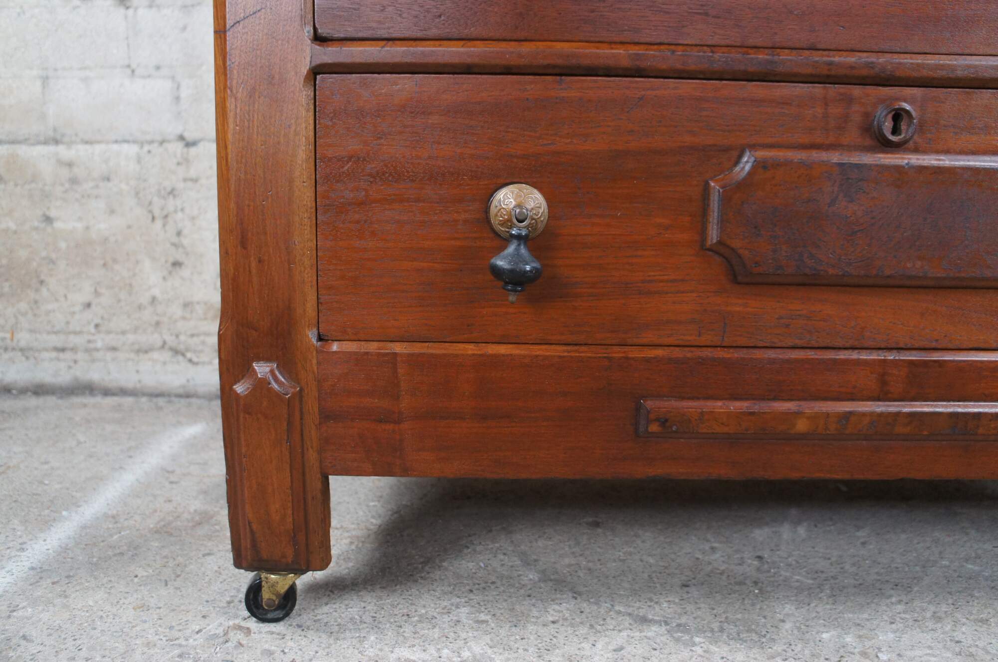An antique Victorian chest of drawers, circa 1880s. Made from walnut with three Knapp joint drawers featuring raised burlwood veneer and knocker pulls. The dreser has hinged gloveboxes along the top, chamfered stiles and rests on casters.