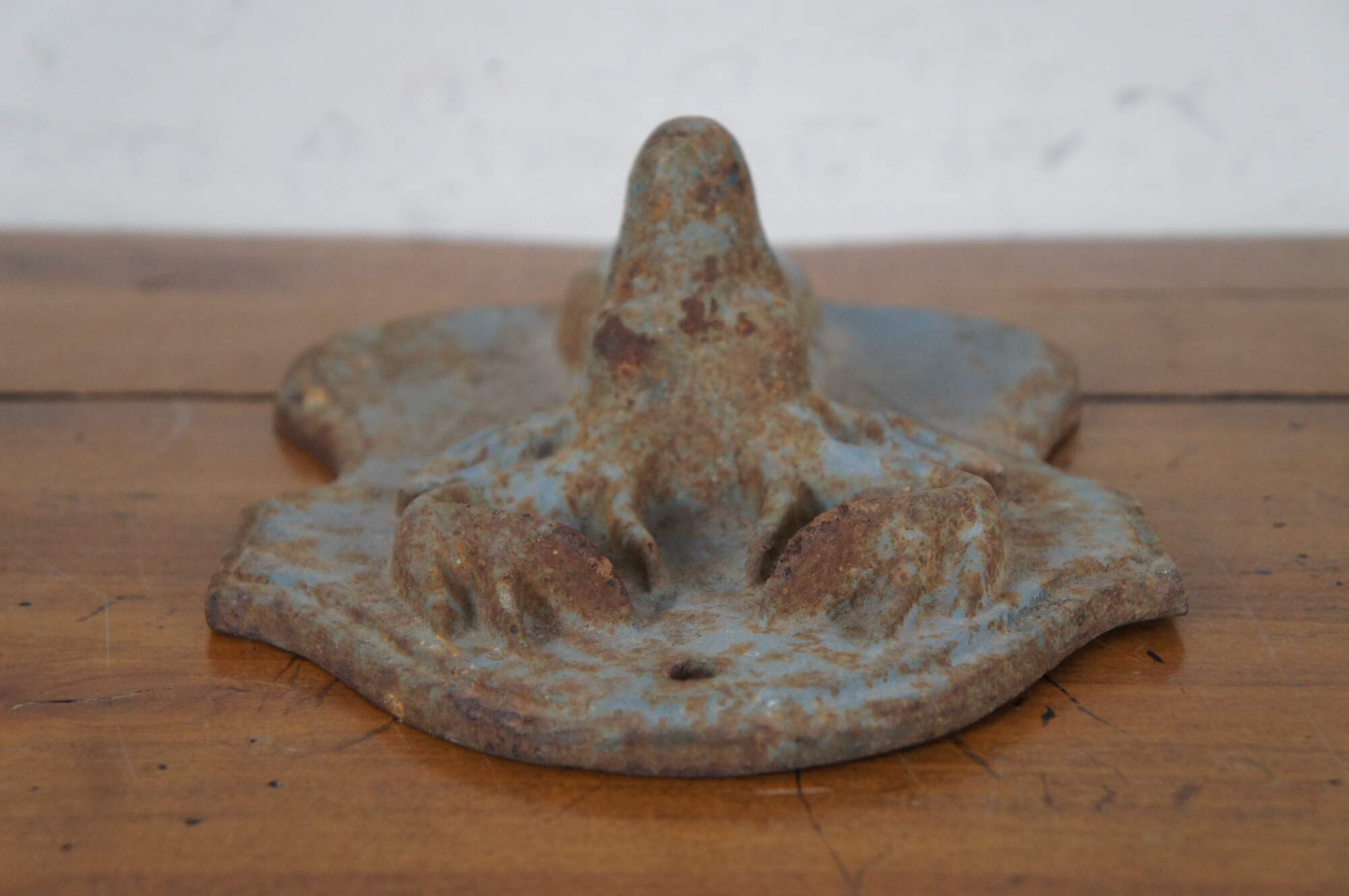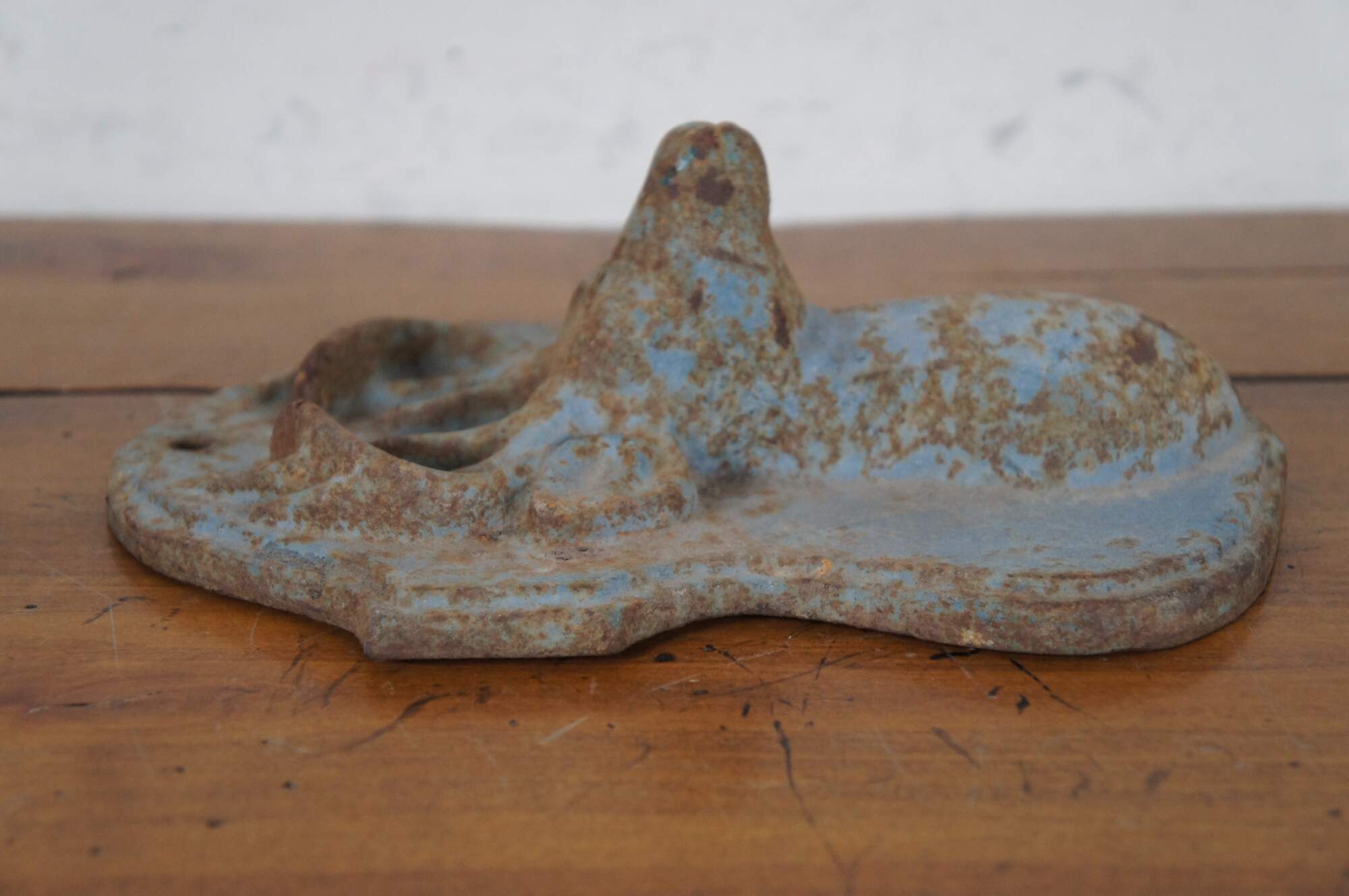 Heavy vintage cast iron wall hanging plaque in the shape of a shield with a rounded top, mounted with the head of a buck / deer. Painted light blue.