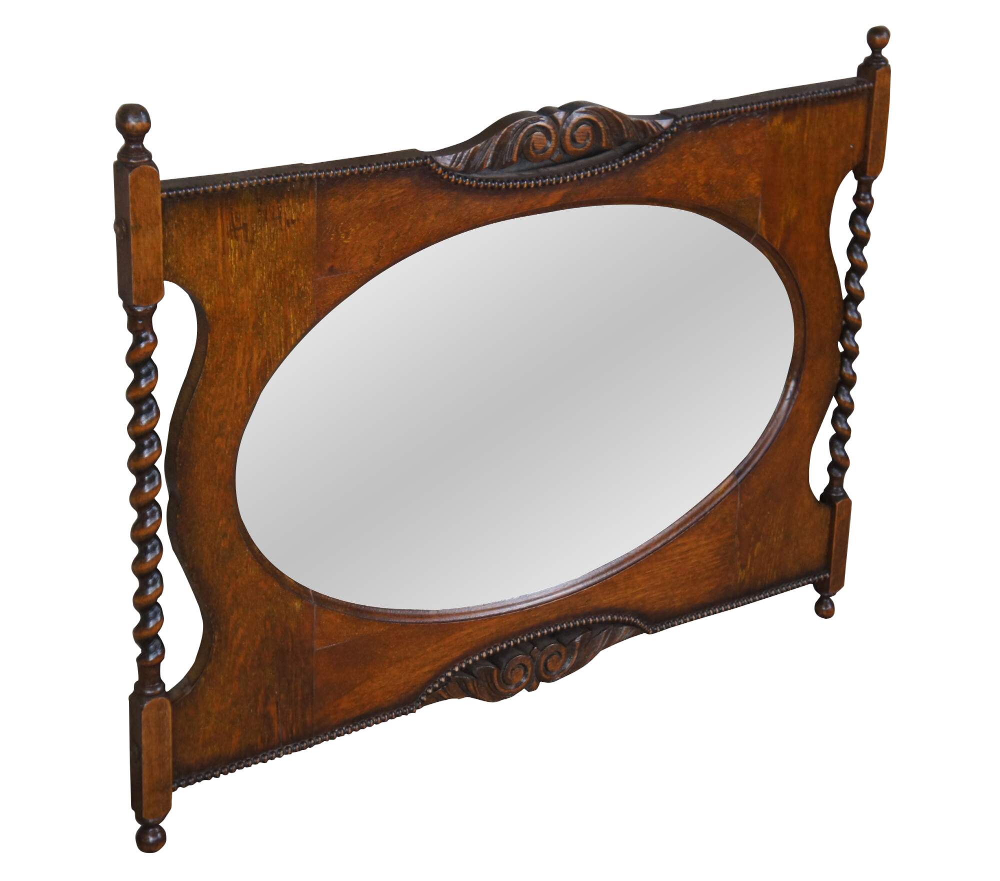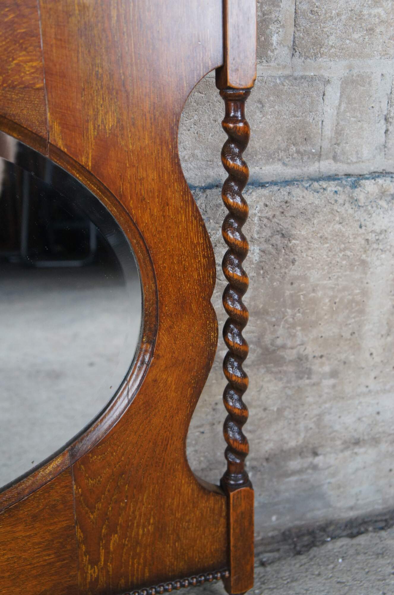 Antique Victorian parlor vanity mirror. Made of quartersawn oak featuring ornate accents with gadrooned edge, ornate carvings, barley twisted supports and beveled oval mirror.